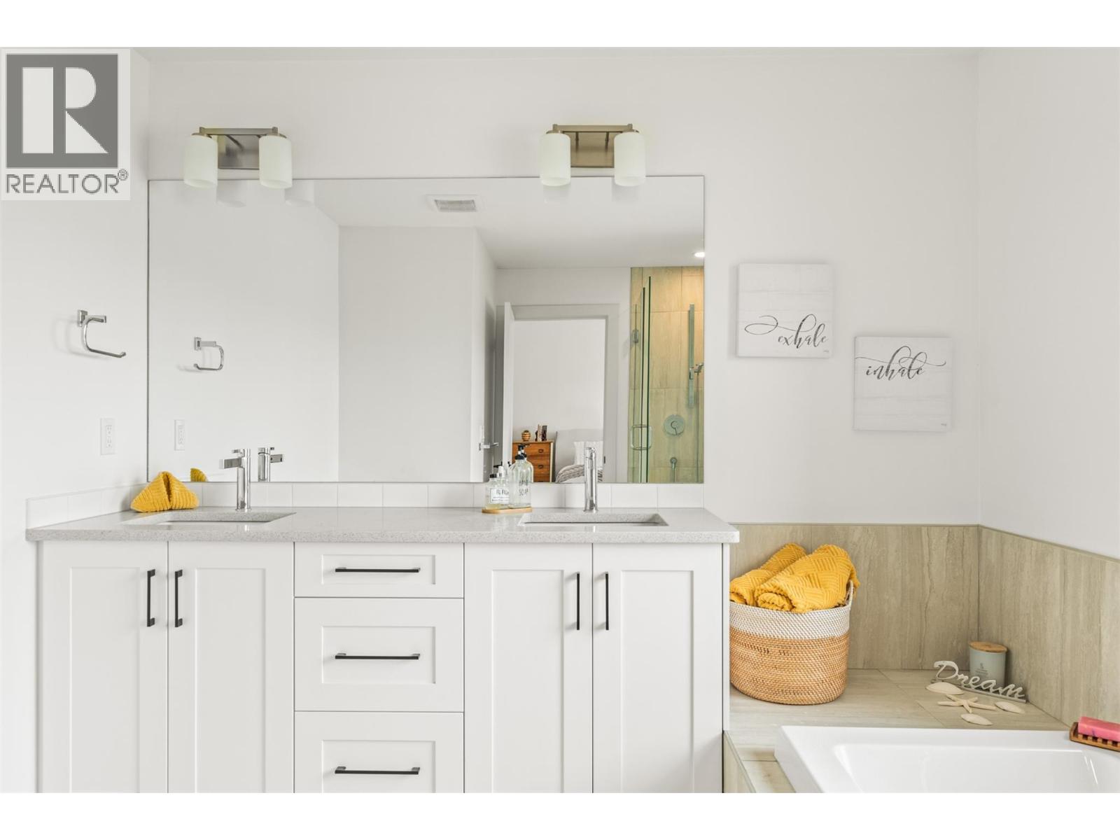 Offering stunning Kalamalka Lake views from all three levels, this turnkey townhome in the sought-after Infinity complex delivers modern living in a fantastic location. With direct access to Middleton Mountain trails and just minutes to Kal Lake, outdoor lifestyle is right at your doorstep. The entry level features a spacious double garage and welcoming foyer. The main floor is bright and open, with large picture windows framing the views. The kitchen showcases quartz countertops, white cabinetry, stainless steel appliances, and a large island, flowing into the living area with a modern electric fireplace. Step onto the front deck with power sunshade for added comfort and privacy. A bedroom and full bathroom complete this level. Upstairs, the primary suite offers breathtaking lake views, a walk-in closet, and a spa-inspired ensuite with double sinks, glass shower, soaker tub, and quartz counters. A second bedroom with its own ensuite, upper-level laundry, and access to the rear patio adds flexibility. Backing onto parkland and perched above surrounding homes, this property offers privacy, scenery, and low-maintenance living. (id:58842)