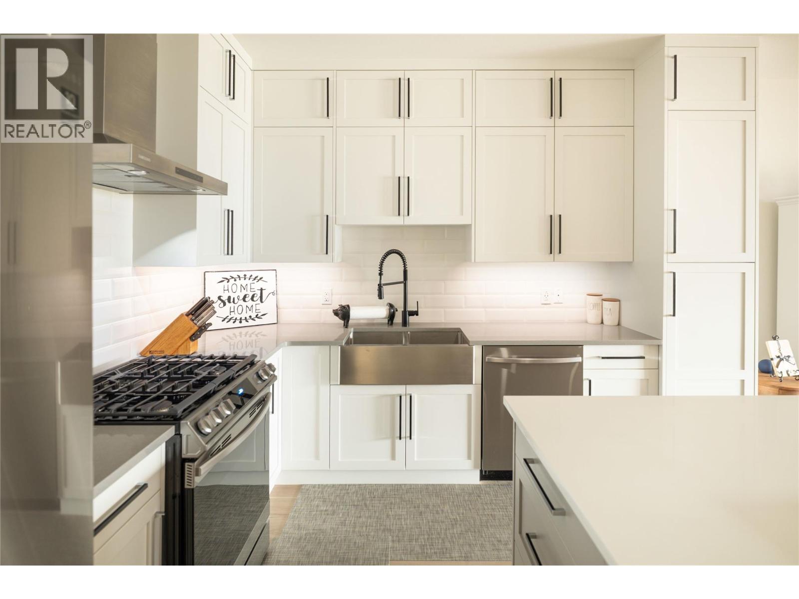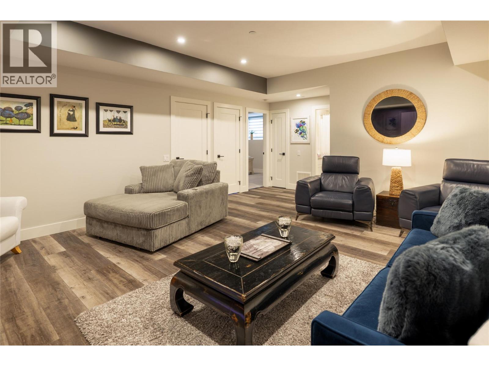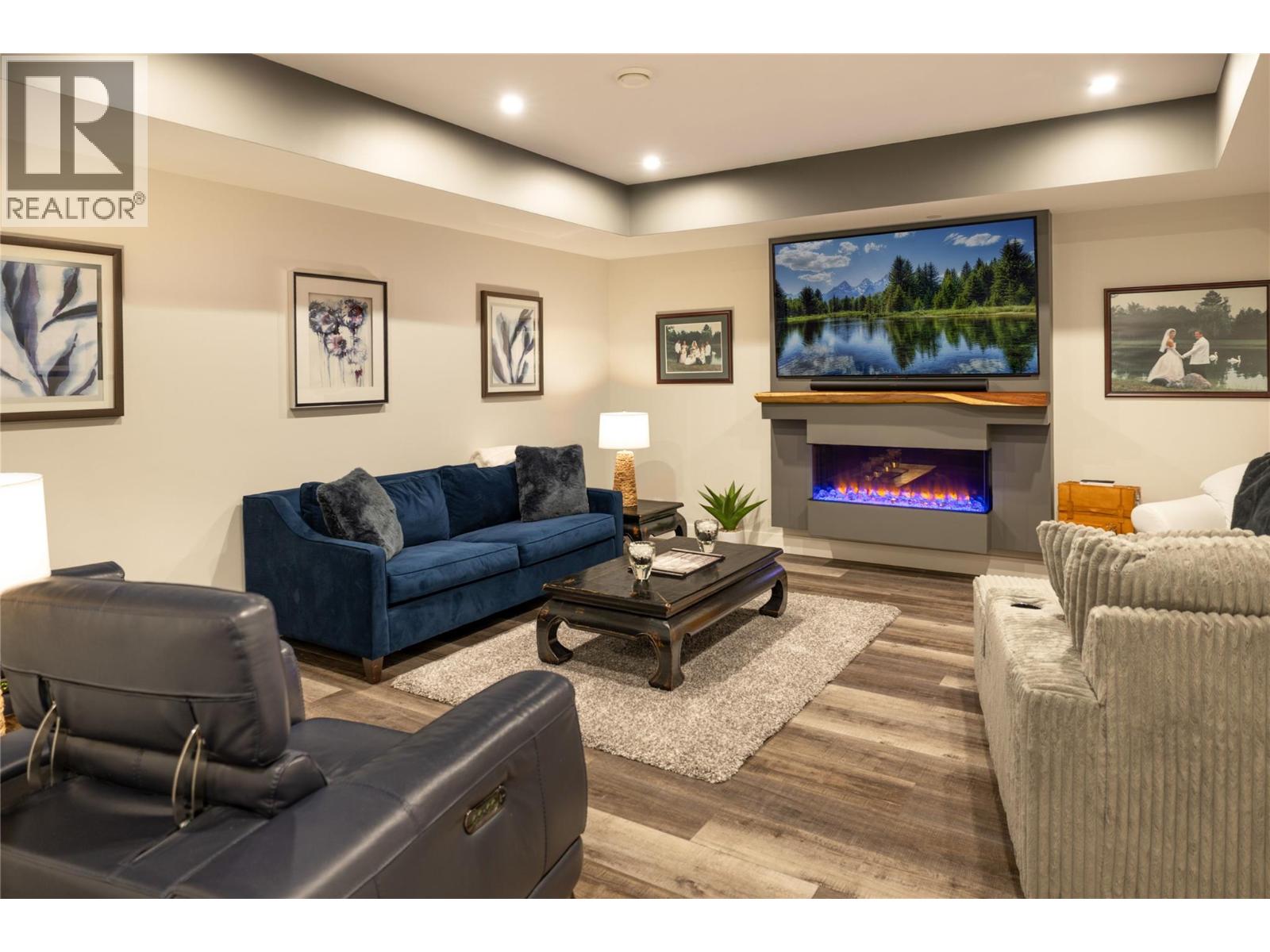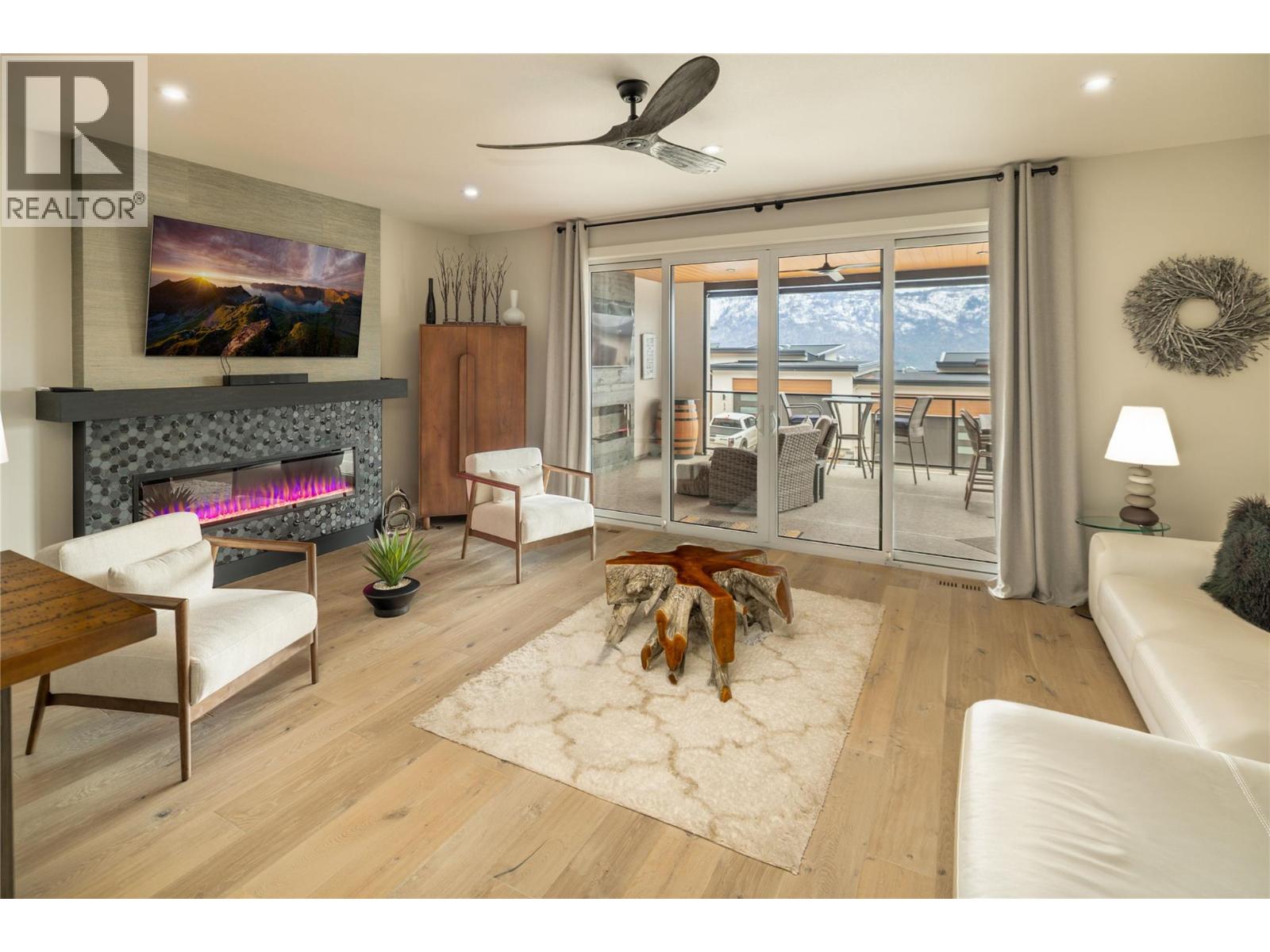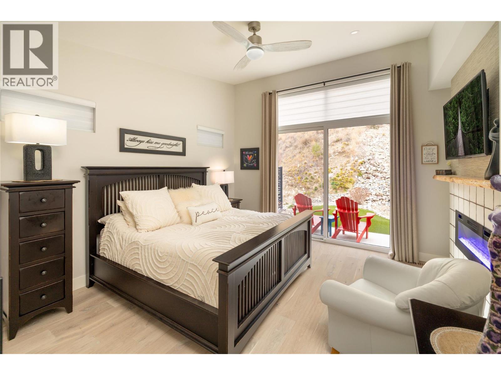 Stunning residence within the prestigious Lakestone Villas community, offering luxury living with over $90,000 in upgrades & enhancements. Pride of ownership & attention to detail are evident from the moment you enter. The spacious entry opens to a bright, open-concept layout with elegant tile flooring, stone countertops throughout, & custom wine storage. The lower level offers excellent functionality with custom laundry with built-ins & sink, a generous family room with electric fireplace & custom cabinetry, plus a guest bedroom and full bathroom. Upstairs, soaring ceilings & expansive windows flood the main living space with natural light, meaningfully finished with wide-plank hardwood flooring. The kitchen features an oversized island, stainless farmhouse sink, smart appliances, & gas range, while the living area is anchored by a striking honeycomb tile fireplace. Step out to the covered patio with privacy screens & outdoor fireplace, creating a seamless indoor-outdoor connection, complemented by a carefree front & back yard with hideaway screens & in-ground lighting. The primary suite is a serene retreat with its own electric fireplace & spa-inspired ensuite featuring a freestanding soaker tub, walk-in shower, dual sinks, heated flooring, & a custom barn door leading to the walk-in closet. An oversized double garage with epoxy flooring & mezzanine storage easily accommodates 3 vehicles, a boat, or recreational toys. Residents enjoy access to Lakestone amenities including lake access, pools, fitness facilities, & scenic trails—offering a true Okanagan lifestyle with lock-&-leave ease. (id:58842)