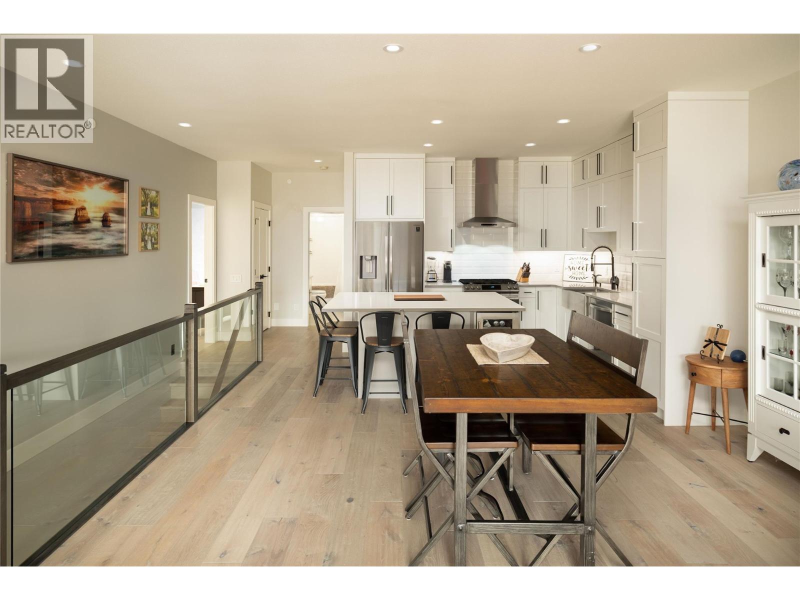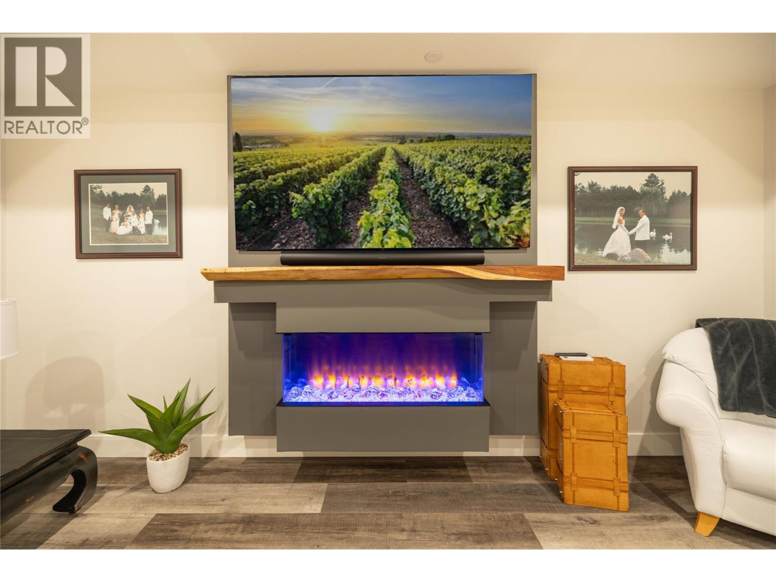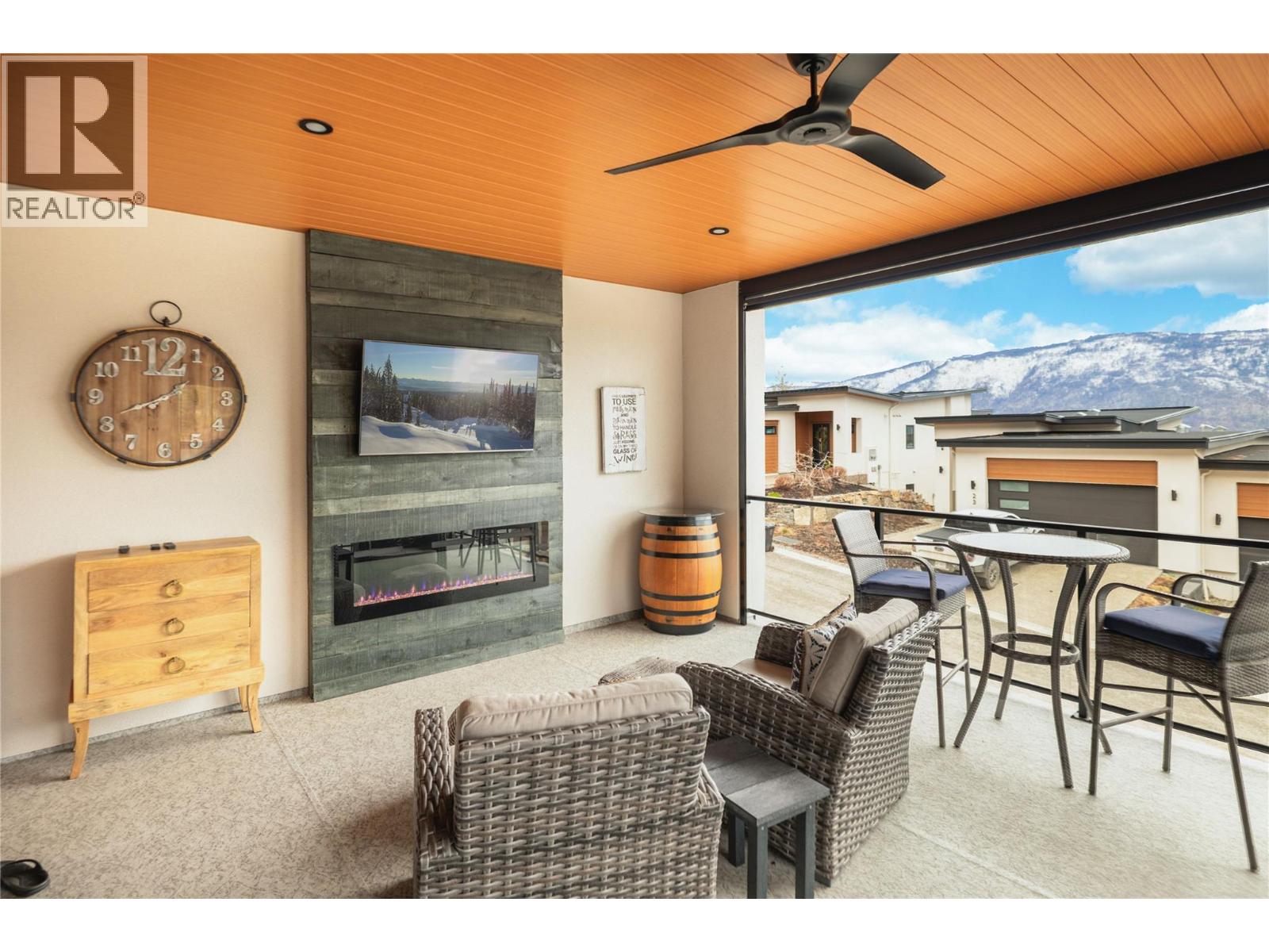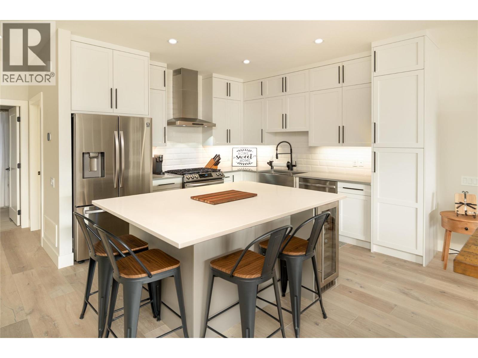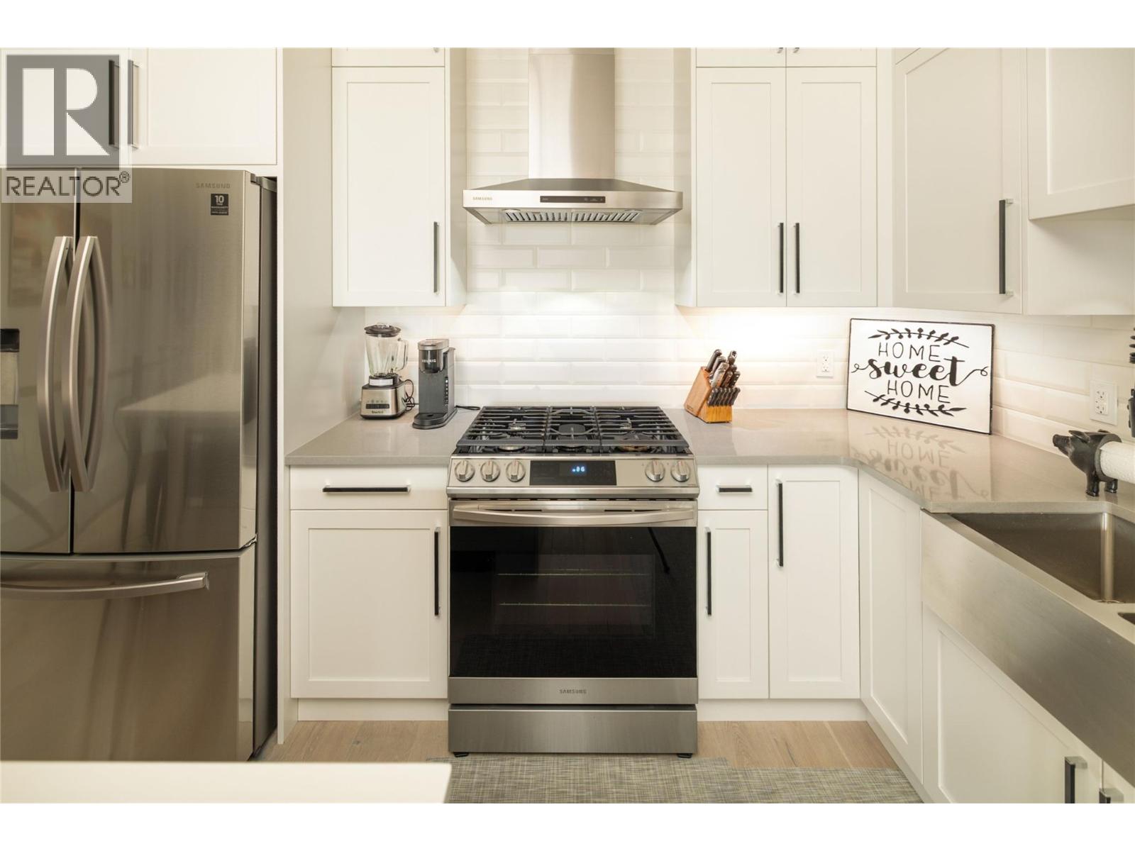 Stunning residence within the prestigious Lakestone Villas community, offering luxury living with over $90,000 in upgrades & enhancements. Pride of ownership & attention to detail are evident from the moment you enter. The spacious entry opens to a bright, open-concept layout with elegant tile flooring, stone countertops throughout, & custom wine storage. The lower level offers excellent functionality with custom laundry with built-ins & sink, a generous family room with electric fireplace & custom cabinetry, plus a guest bedroom and full bathroom. Upstairs, soaring ceilings & expansive windows flood the main living space with natural light, meaningfully finished with wide-plank hardwood flooring. The kitchen features an oversized island, stainless farmhouse sink, smart appliances, & gas range, while the living area is anchored by a striking honeycomb tile fireplace. Step out to the covered patio with privacy screens & outdoor fireplace, creating a seamless indoor-outdoor connection, complemented by a carefree front & back yard with hideaway screens & in-ground lighting. The primary suite is a serene retreat with its own electric fireplace & spa-inspired ensuite featuring a freestanding soaker tub, walk-in shower, dual sinks, heated flooring, & a custom barn door leading to the walk-in closet. An oversized double garage with epoxy flooring & mezzanine storage easily accommodates 3 vehicles, a boat, or recreational toys. Residents enjoy access to Lakestone amenities including lake access, pools, fitness facilities, & scenic trails—offering a true Okanagan lifestyle with lock-&-leave ease. (id:58842)