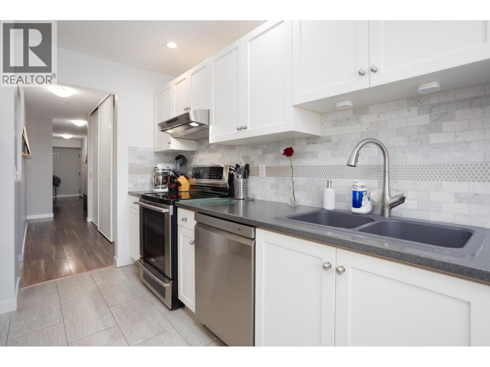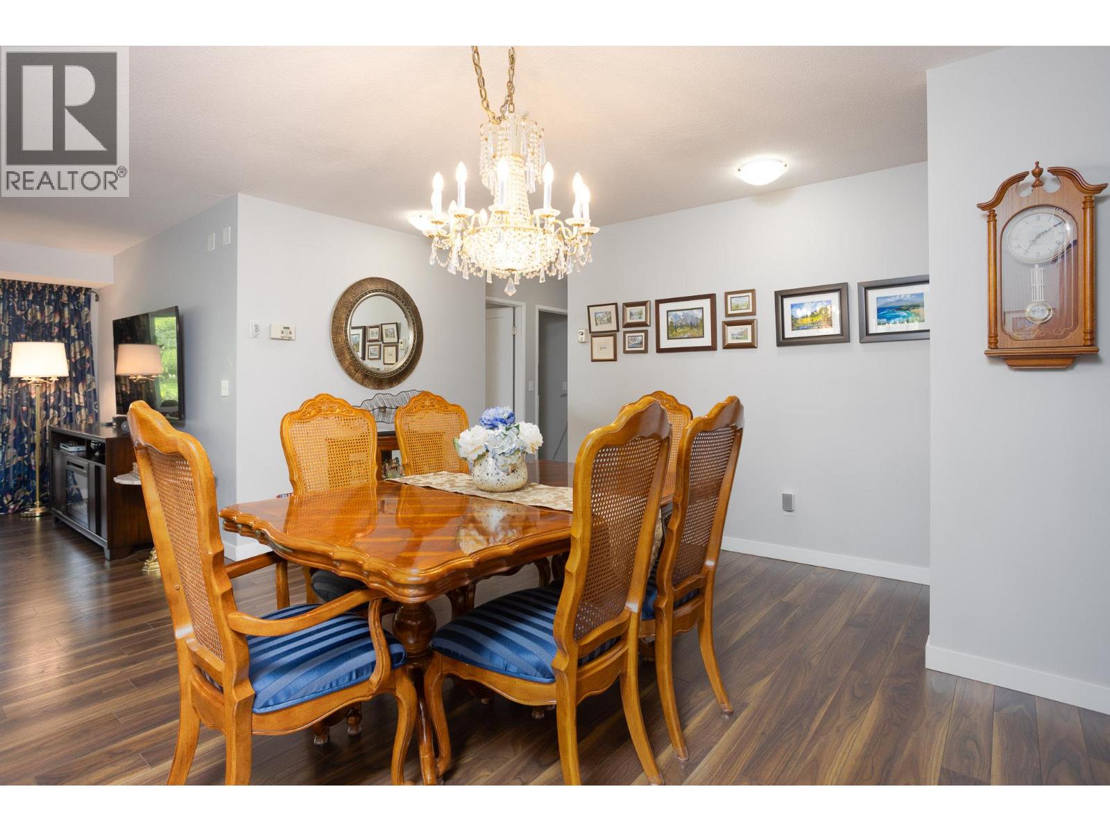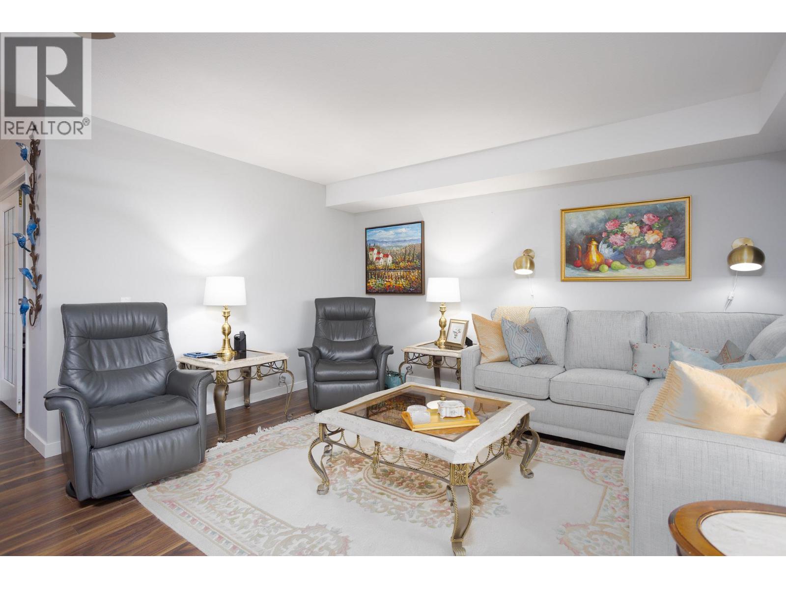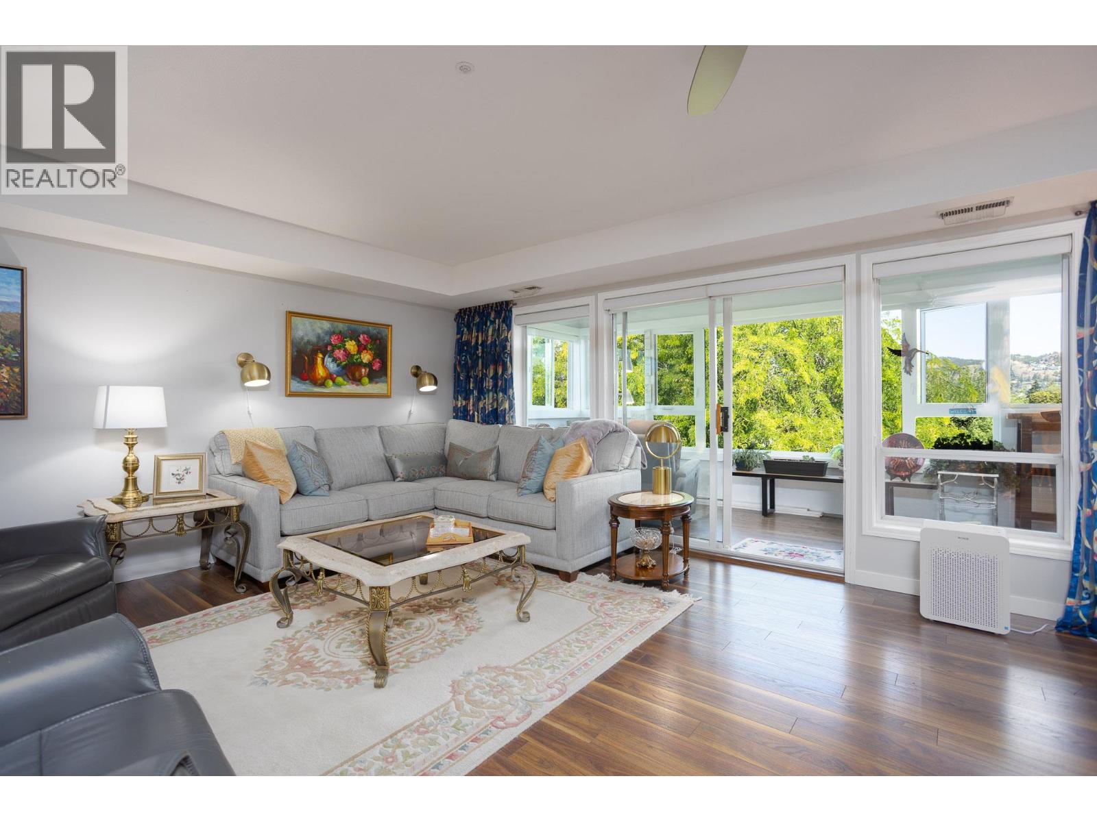 Welcome to Wedgewood! This UPDATED quiet and spacious 55+ northwest-facing corner unit offers over 1,600 sqft of beautifully updated living space with 2 bedrooms plus a den. Ideally located near Millbridge Park and just minutes from Hwy 97 and across from shopping. Enjoy peace of mind with all-new windows and modern upgrades throughout, including laminate and vinyl plank flooring, LED pot lights, and forced air heating and cooling throughout. The stylish kitchen features stainless steel appliances with an induction cooktop. French doors open to a bright den with a window, while the oversized living room includes roller blinds and access to the enclosed balcony - complete with views of Knox Mountain, opening windows, and a sliding glass door. The king-sized primary suite includes a walk-through closet and private ensuite with a walk-in tub and generous counter space. The second bedroom offers a full closet, while the main bath features a modern glass and tile walk-in shower. The oversized laundry room truly is a dream with built-in cabinets, a folding area, sink, and built-in vacuum. The unit also includes 1 underground parking stall and storage locker. (id:58842)