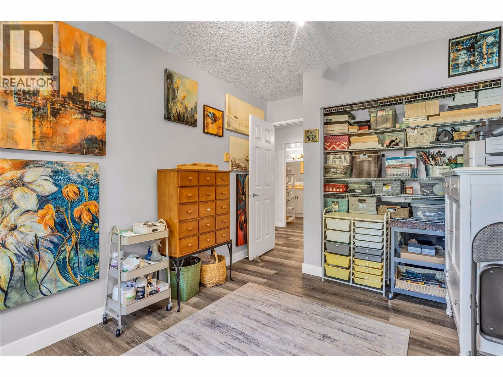 WELCOME TO #216-1056 BERNARD AVENUE! LARGEST IN THE COMPLEX AT 1314 SF. This Beautifully UPDATED 2 Bedroom 2 Bathroom QUIET CORNER UNIT in a 55+ community features a private WRAP AROUND DECK with SW EXPOSURE and LOVELY views overlooking the POOL and LUSH COURTYARD. Updates include: vinyl flooring throughout, a stylish professionally designed kitchen with quartz countertops, stainless steel appliances (double oven), pantry, sit-up breakfast bar plus a full main bath renovation. The spacious primary bedroom easily accommodates a king-size bed & features ""his & her"" closets and a full ensuite. Updated wall A/C units, in-suite laundry, and convenient pantry/storage room off kitchen. Bonus flex space with built-in shelving is perfect for a den or extended living room. Workshop and storage unit in secured parking garage. 1 parking stall with potential option to rent a second. Enjoy RESORT STYLE AMENITIES: Outdoor pool, indoor hot tub and saunas! PET FRIENDLY! (2 dogs/cats or 1 of each, dogs not to exceed 12kg & 24” at shoulder). IDEALLY LOCATED across from grocery stores, pharmacy, restaurants and medical services-just a short walk to downtown and the beach…Move in and embrace the Okanagan Lifestyle at 1056 Bernard! (id:58842)