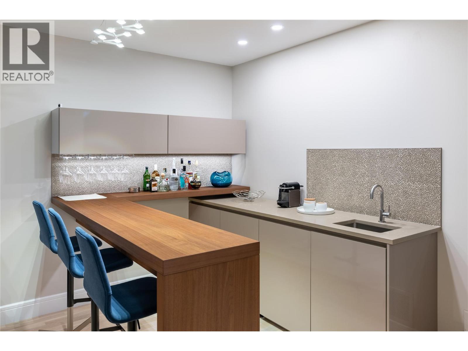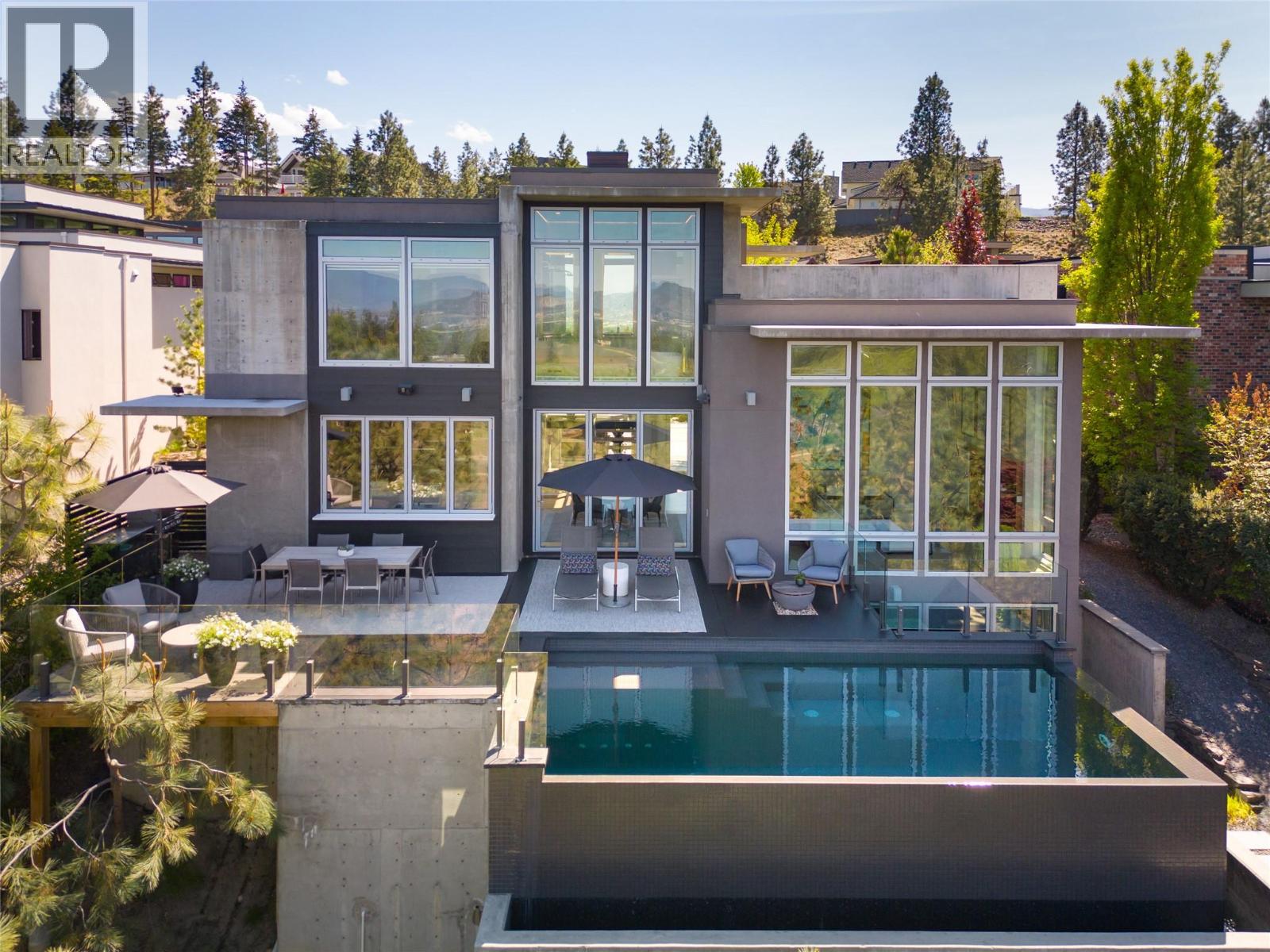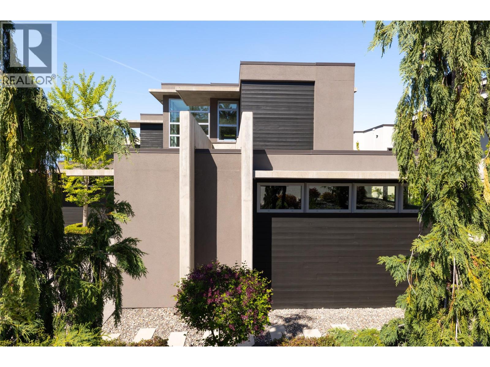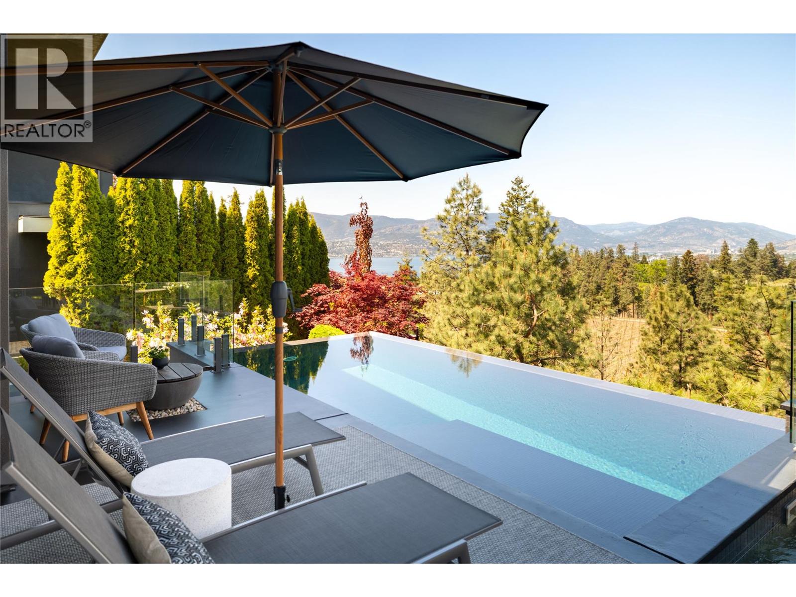 Discover extraordinary design and elevated living in this striking concrete-and-glass home in Kelowna’s coveted Lower Mission. This one-of-a-kind residence captivates with panoramic views of Okanagan Lake, the city skyline, and surrounding vineyards. From the moment you arrive, the home’s bold form and refined craftsmanship set the tone. A dramatic floating-stair staircase, European white oak floors, and high-gloss stretch ceilings with ambient inset lighting underscore the sophisticated aesthetic. Floor-to-ceiling commercial-grade windows capture the landscapes, while open-concept living flows effortlessly to the outdoors. Entertain on a grand scale: full nano-doors open from the main floor to multiple patios and seating areas, including a built-in eating bar with a nano pass-through window. Head up to the rooftop patio and unwind in the hot tub or the eye-catching infinity pool—designed to appear as though it’s floating above the terrain. The designer kitchen is built for both performance and show-stopping style: two-tone Liecht cabinetry, top-of-the-line Miele appliances. A built-in espresso machine, double ovens, cooktop, fridge, freezer, wine fridge, all seamlessly integrated to host gatherings of any magnitude. See firsthand how this home sets a new standard for contemporary living in Kelowna. (id:58842)