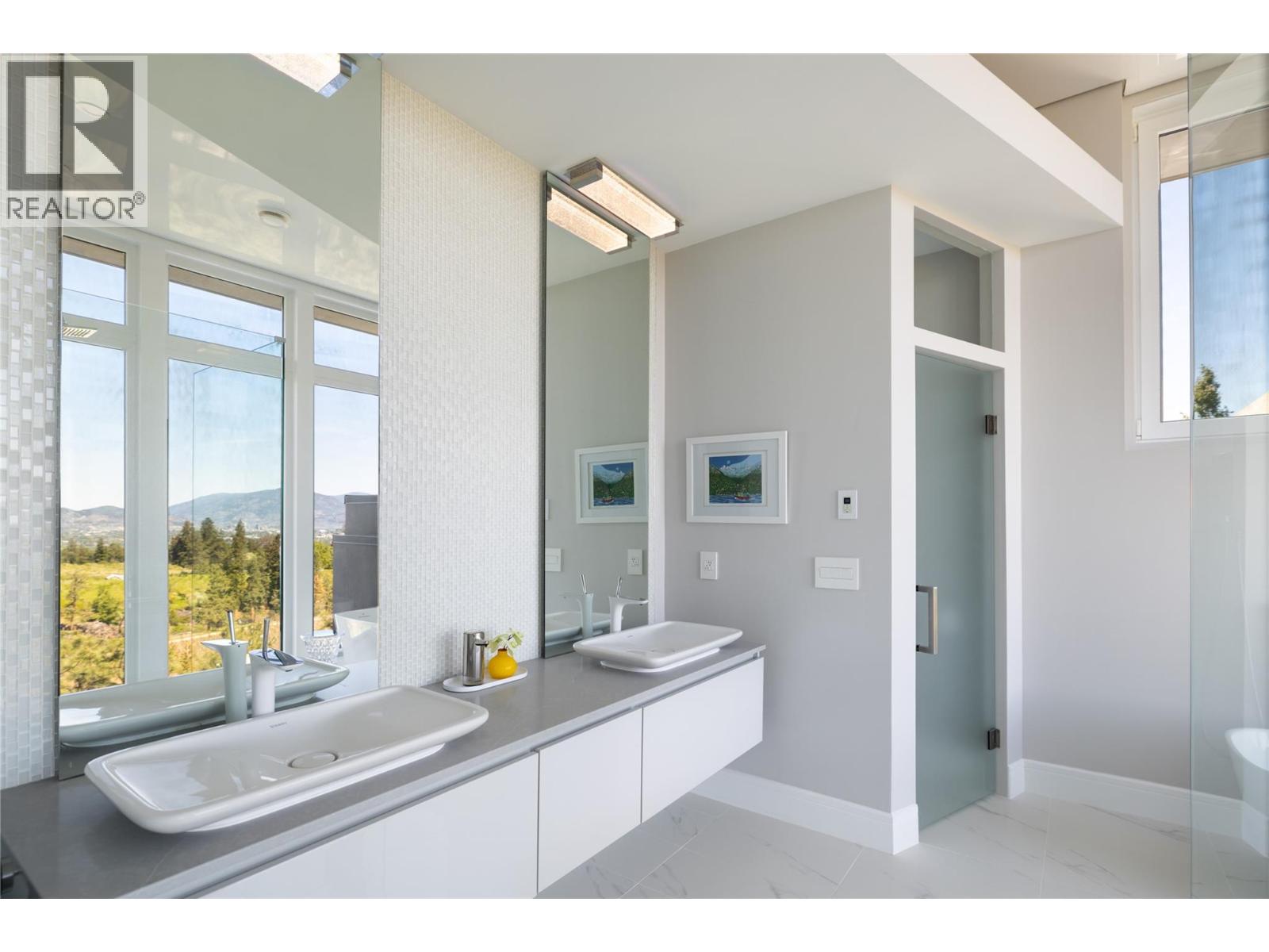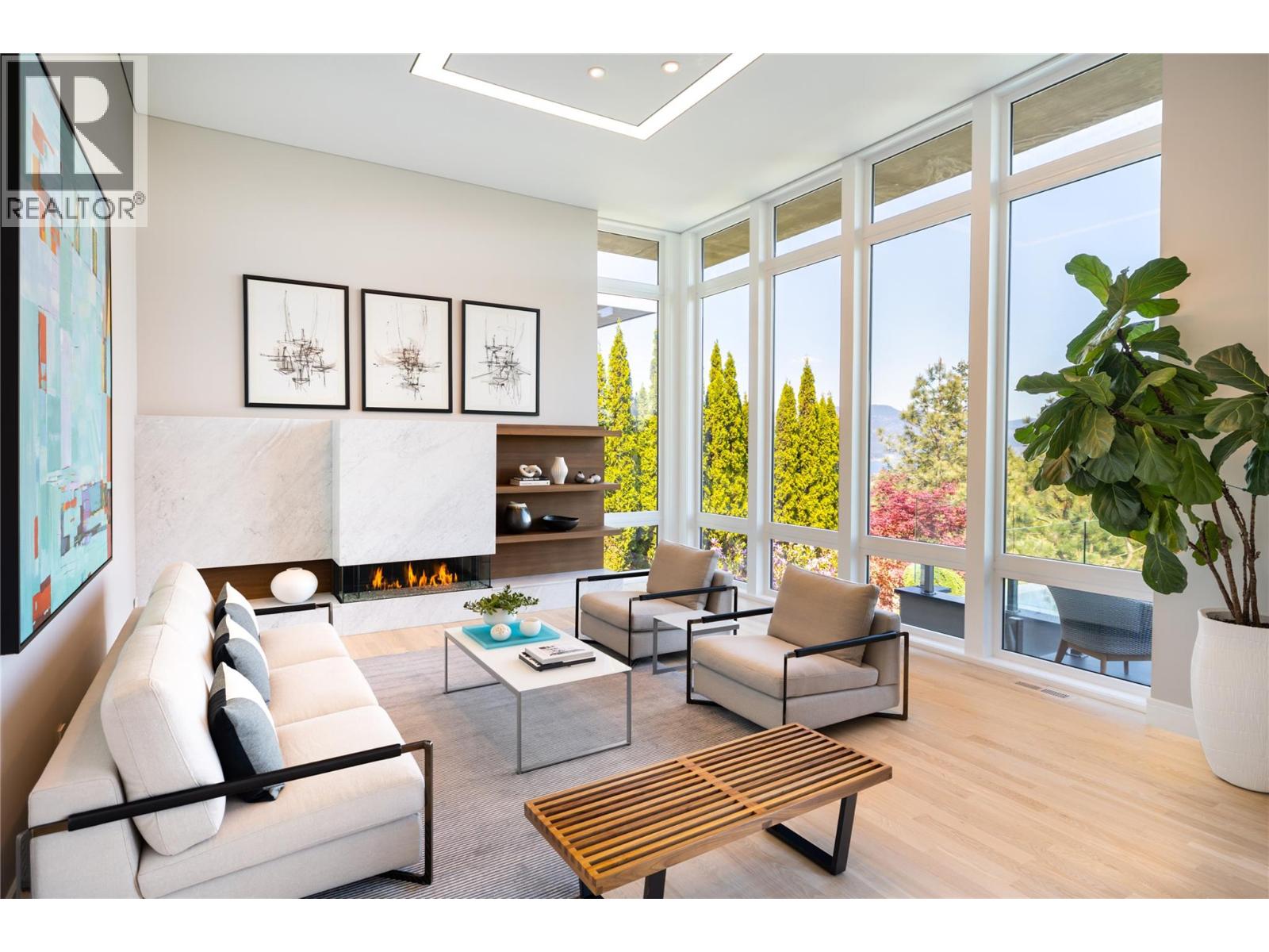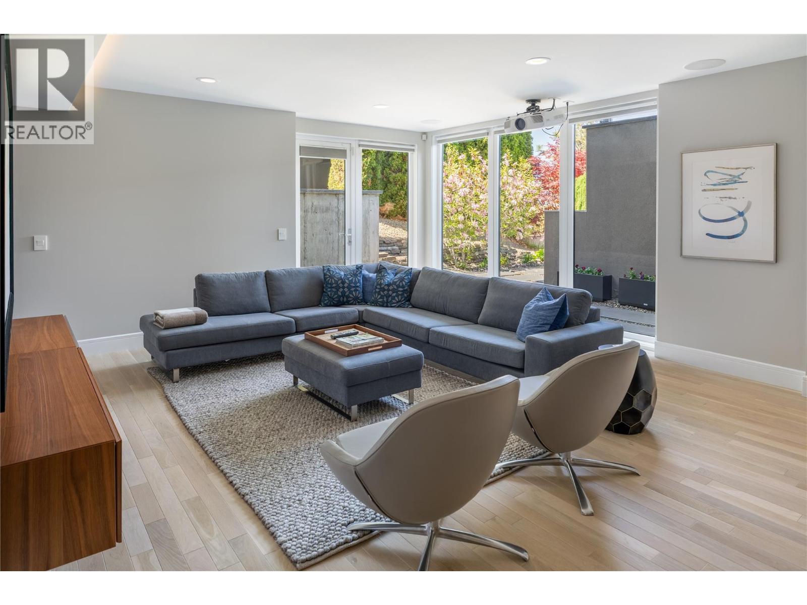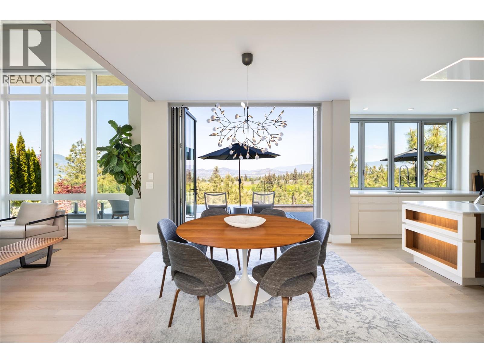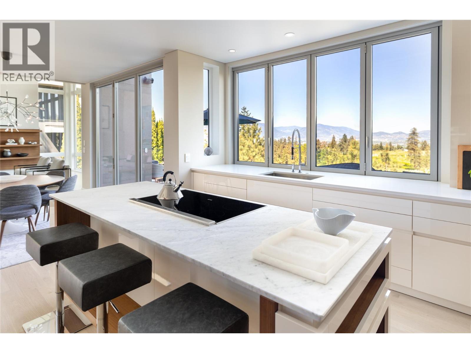 Discover extraordinary design and elevated living in this striking concrete-and-glass home in Kelowna’s coveted Lower Mission. This one-of-a-kind residence captivates with panoramic views of Okanagan Lake, the city skyline, and surrounding vineyards. From the moment you arrive, the home’s bold form and refined craftsmanship set the tone. A dramatic floating-stair staircase, European white oak floors, and high-gloss stretch ceilings with ambient inset lighting underscore the sophisticated aesthetic. Floor-to-ceiling commercial-grade windows capture the landscapes, while open-concept living flows effortlessly to the outdoors. Entertain on a grand scale: full nano-doors open from the main floor to multiple patios and seating areas, including a built-in eating bar with a nano pass-through window. Head up to the rooftop patio and unwind in the hot tub or the eye-catching infinity pool—designed to appear as though it’s floating above the terrain. The designer kitchen is built for both performance and show-stopping style: two-tone Liecht cabinetry, top-of-the-line Miele appliances. A built-in espresso machine, double ovens, cooktop, fridge, freezer, wine fridge, all seamlessly integrated to host gatherings of any magnitude. See firsthand how this home sets a new standard for contemporary living in Kelowna. (id:58842)