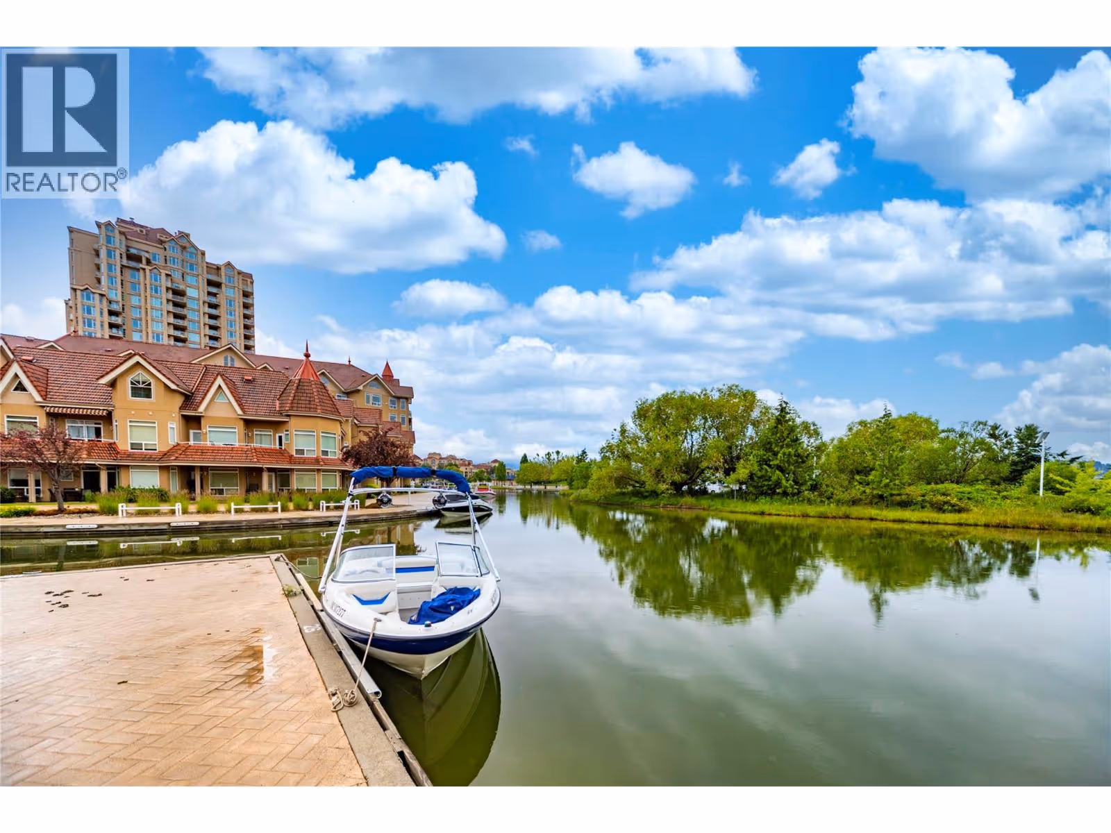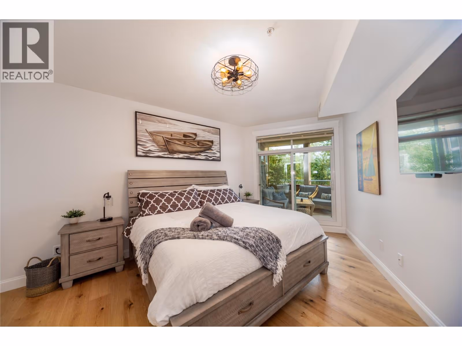 Renovated 3-bed 2-bath suite on the peaceful side of Discovery Bay, right on the shores of Lake Okanagan. With nearly 1,500 sq. ft. of thoughtfully designed living space, this home offers a rare combination of privacy, style, and location. Step inside to white oak engineered hardwood floors, a designer kitchen with custom two-tone cabinetry, quartz countertops, a Bosch whisper-quiet dishwasher, induction/convection oven, and updated lighting throughout. The open layout flows from the kitchen and dining area into the living room, where a tiled gas fireplace creates a warm focal point. Two private decks overlook the bird sanctuary and lush landscaping. Both bathrooms feature heated floors, with the primary ensuite showcasing a spacious walk-in shower. Residents enjoy premium amenities including two pools (one open year-round), two hot tubs, a sauna, fitness centre, and games room—all within walking distance to shops, restaurants, and the beach within the Cultural District. Secure underground parking is included. Pets allowed, 1 small dog or cat. (id:58842)