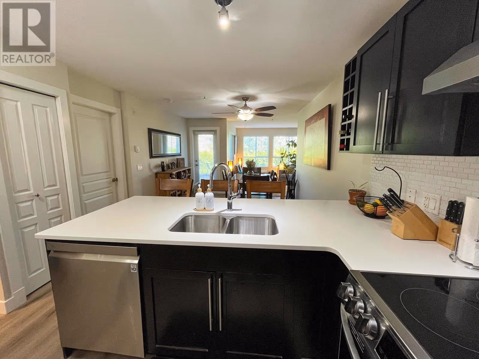 This stunning condo offers an unparalleled lifestyle in Kelowna, combining waterfront proximity, urban convenience and natural beauty. Enjoy an oversized private yard overlooking a protected bird sanctuary, ensuring peaceful mornings with the sounds of nature and unobstructed views. Within easy walking distance to a vibrant array of coffee shops, diverse restaurants, Prospera Place, and the Ellis street market. Recent upgrades include luxury vinyl plank flooring, elegant quartz countertops, sinks and faucets, blinds, and all new appliances. Enjoy the custom-built walk-in pantry and closet for extra storage and organization. Waterscapes also provides resort-like amenities including an outdoor pool, hot tubs, bbq area, pool tables, a well equipped gym, convenient suites for visitors, and a bookable lounge area for gatherings.Includes 1 secured underground parking spot and a storage locker. Pet-friendly (2 dogs, 2 cats, or one of each—no size limit). This main-floor 1 bed / 1 bath condo is available for quick possession. Monthly Strata fees of $451/month. Click Multi-Media to view floor plan, X out to view virtual tour. (id:58842)