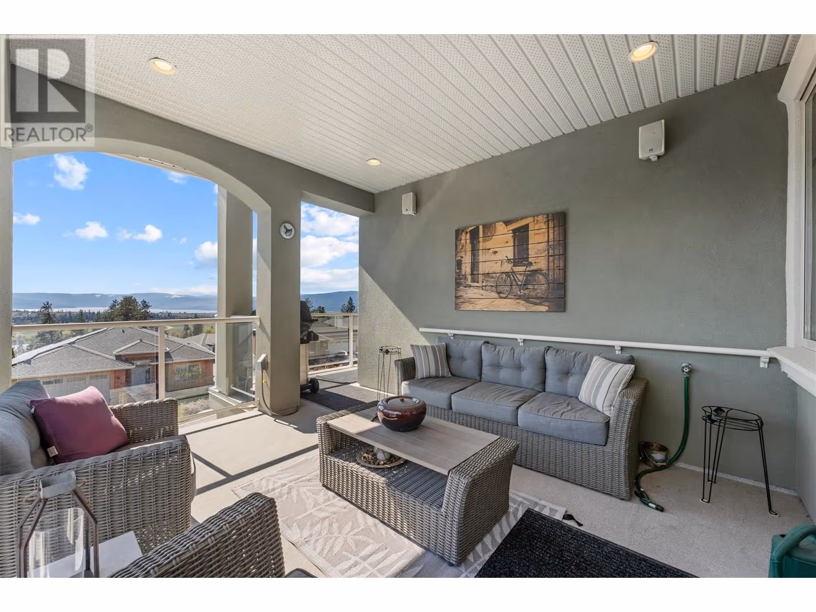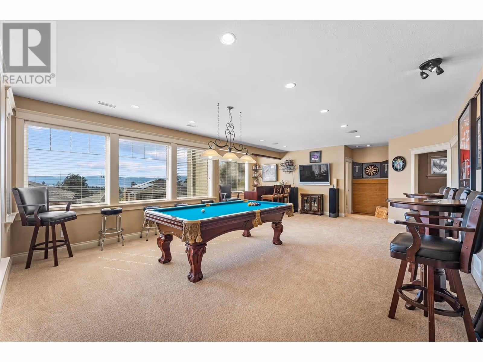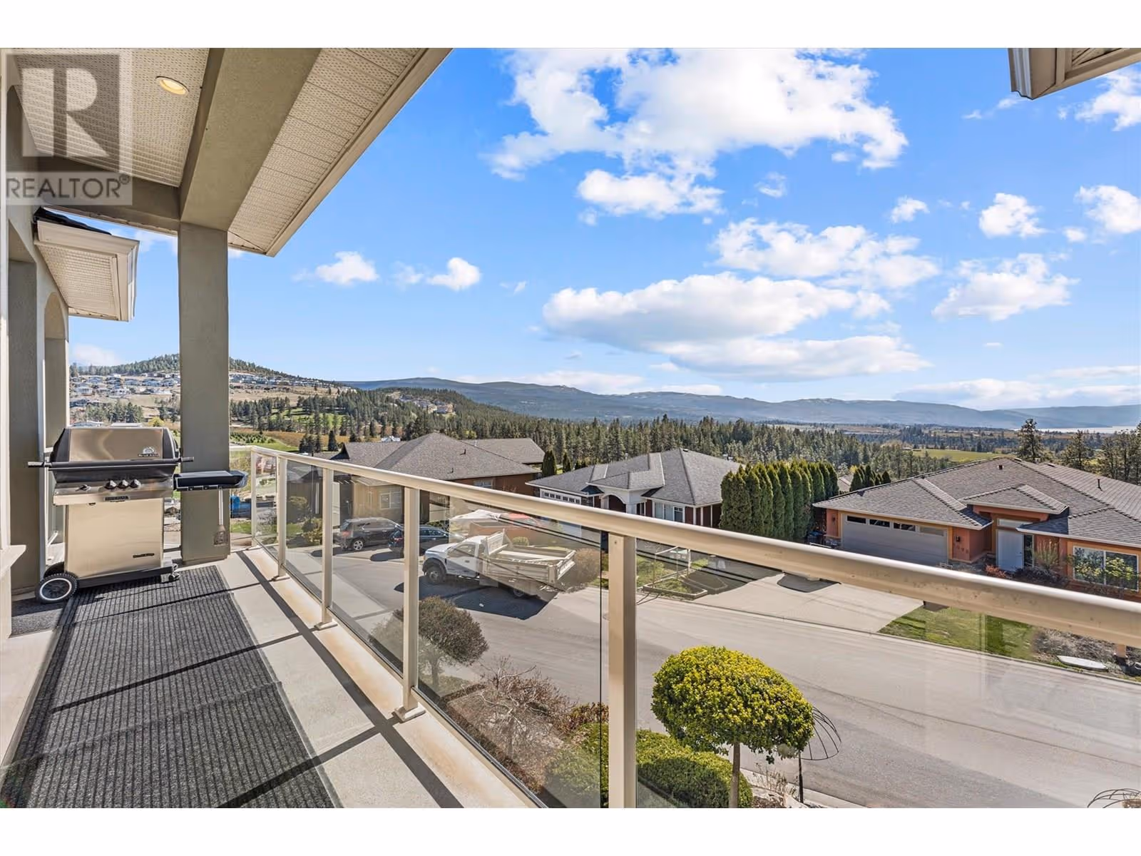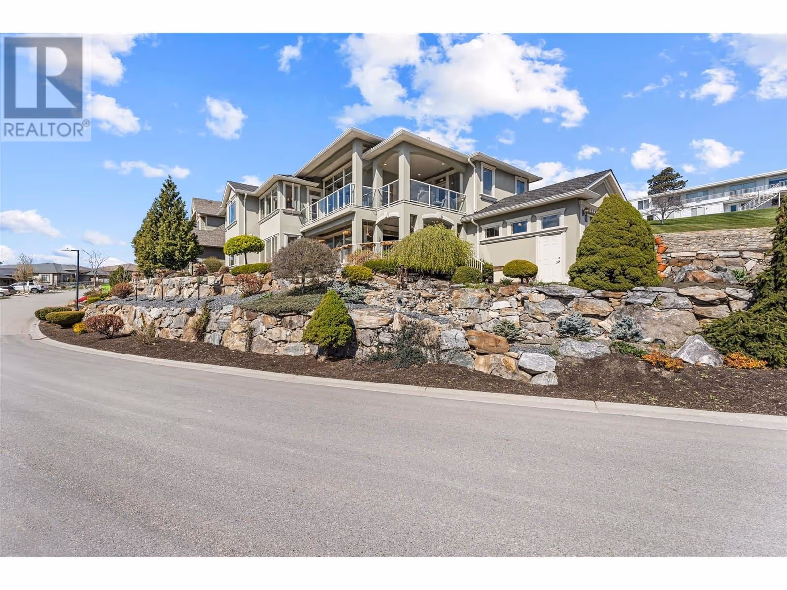 Tucked away in a tranquil Kelowna cul-de-sac, this custom-built home offers luxury & comfort. Situated on a meticulously landscaped corner lot with tiered rock walls its curb appeal is exceptional. This property boasts two distinct garages: an oversized double garage accessing the upper level, and a separate single garage leading to the lower level perfect for a potential suite conversion (with plans for a second kitchen). The expansive REC room featuring in-floor heating, a wet bar, and a versatile gym/media room, all with captivating city and lake views. This level also includes two guest bedrooms, a 4-piece bathroom, and abundant storage, ideal for entertaining or extended family. The upper level, bathed in natural light from large windows, showcases 11-foot ceilings and an open-concept living area framing stunning lake, mountain, and city vistas. The gourmet kitchen is a chef's dream, with a Wolf six-burner range, dual wall ovens, and pantry, flowing seamlessly into the living and dining areas. The wrap-around covered deck is perfect for year-round BBQs and sunsets. A flexible library space can be a formal dining room or home office. The expansive primary suite offers a spa-like ensuite with a soaker tub, steam shower, double vanity, and a dual-entry walk-in closet. A 2nd bdrm with a Murphy bed, a 2-piece powder room, and a full laundry room with garage access complete this level. With 2 driveways and 2 garages, there's abundant parking, including RV or boat space. (id:58842)