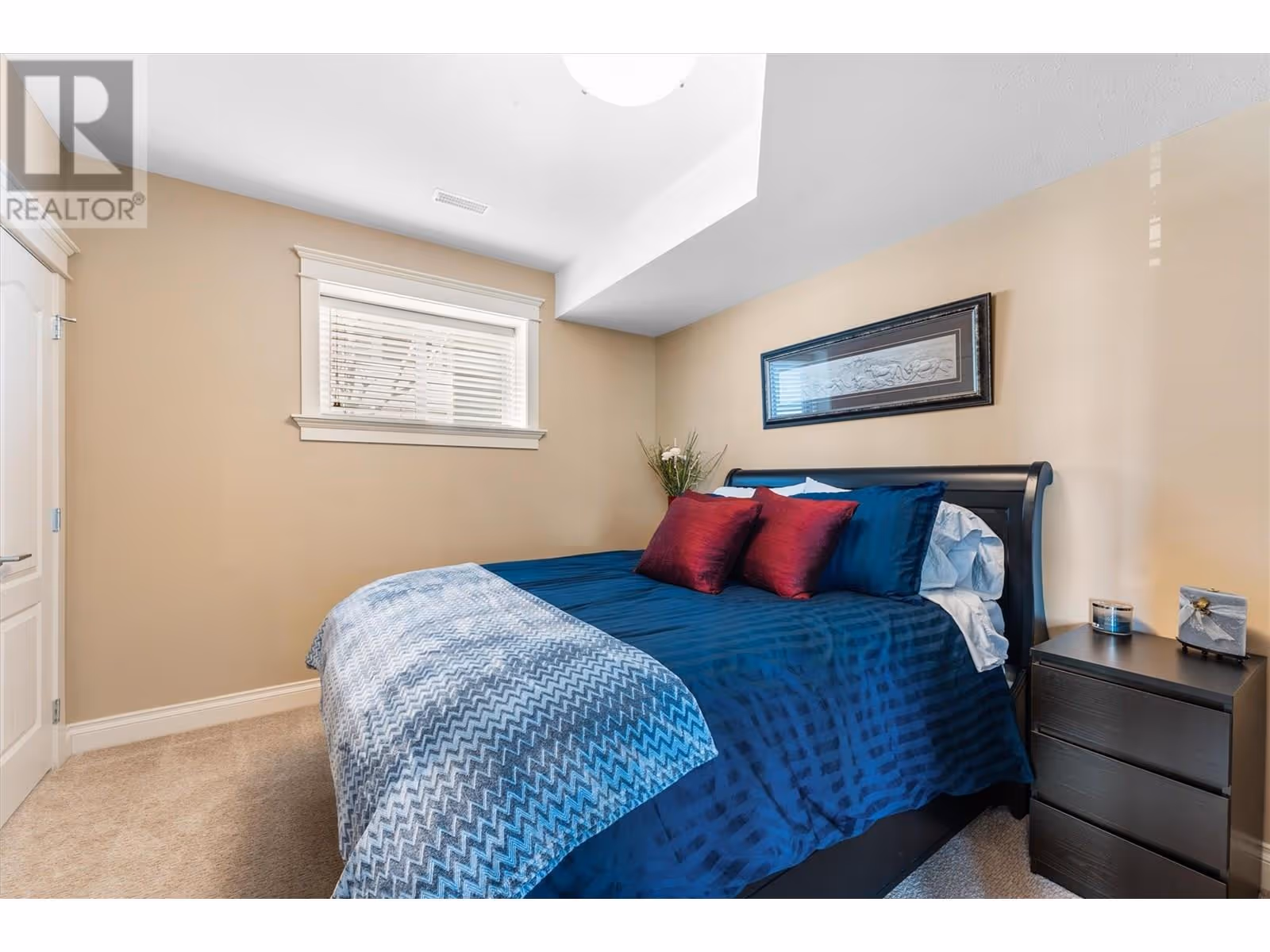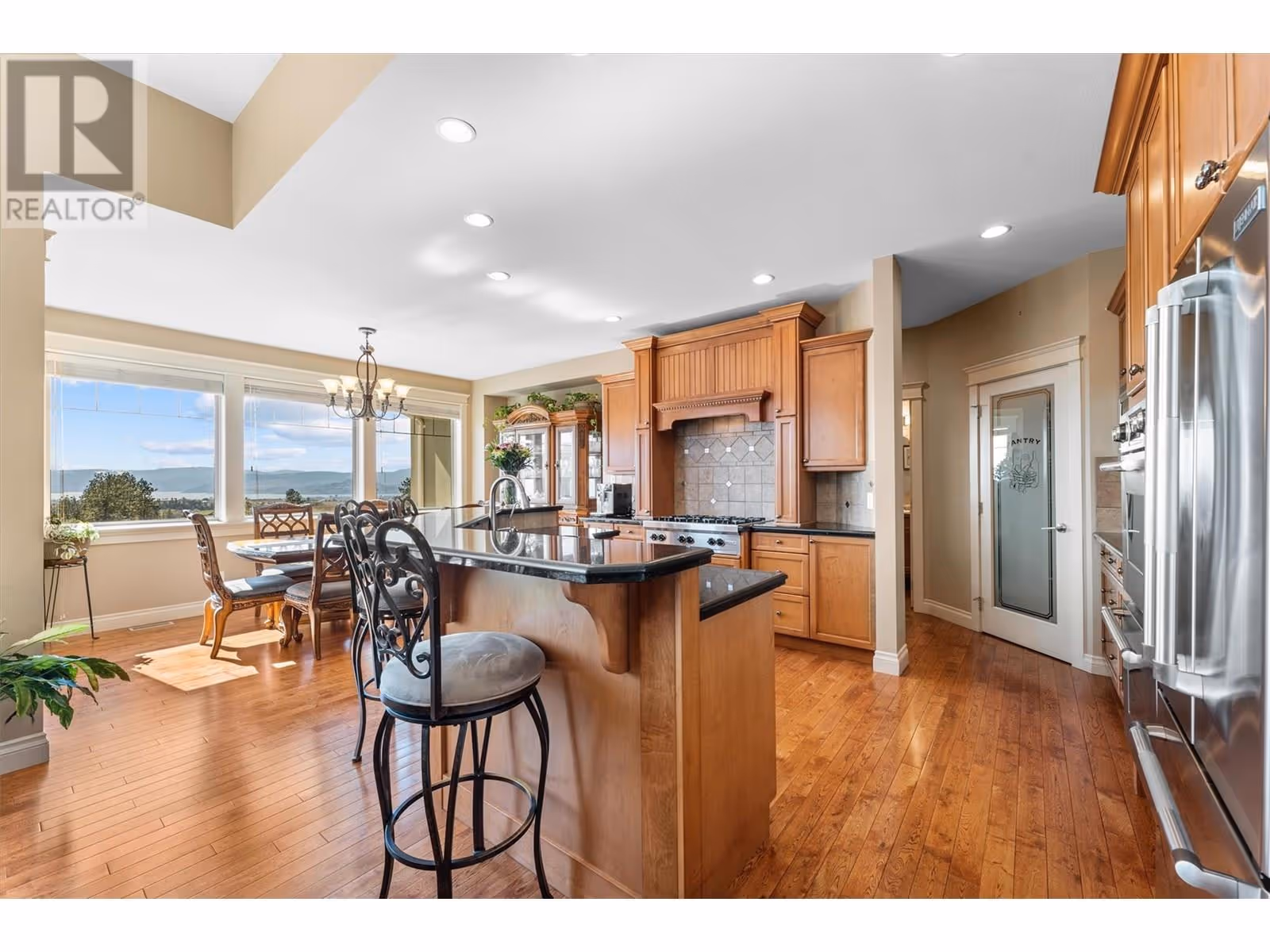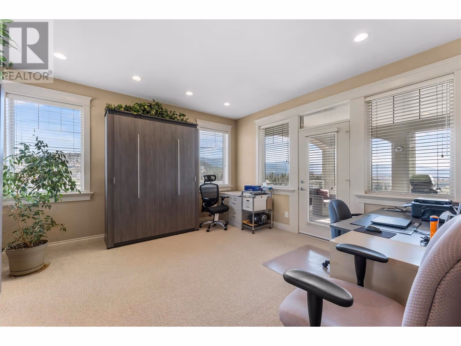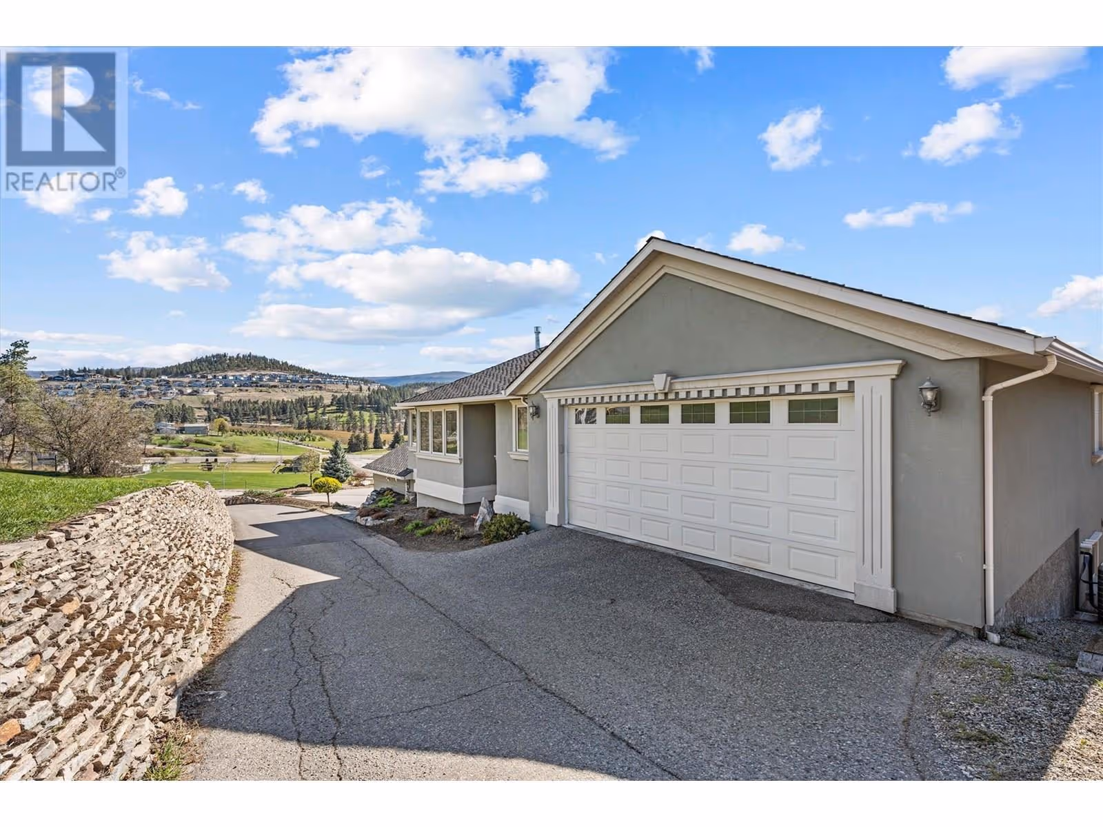 Tucked away in a tranquil Kelowna cul-de-sac, this custom-built home offers luxury & comfort. Situated on a meticulously landscaped corner lot with tiered rock walls its curb appeal is exceptional. This property boasts two distinct garages: an oversized double garage accessing the upper level, and a separate single garage leading to the lower level perfect for a potential suite conversion (with plans for a second kitchen). The expansive REC room featuring in-floor heating, a wet bar, and a versatile gym/media room, all with captivating city and lake views. This level also includes two guest bedrooms, a 4-piece bathroom, and abundant storage, ideal for entertaining or extended family. The upper level, bathed in natural light from large windows, showcases 11-foot ceilings and an open-concept living area framing stunning lake, mountain, and city vistas. The gourmet kitchen is a chef's dream, with a Wolf six-burner range, dual wall ovens, and pantry, flowing seamlessly into the living and dining areas. The wrap-around covered deck is perfect for year-round BBQs and sunsets. A flexible library space can be a formal dining room or home office. The expansive primary suite offers a spa-like ensuite with a soaker tub, steam shower, double vanity, and a dual-entry walk-in closet. A 2nd bdrm with a Murphy bed, a 2-piece powder room, and a full laundry room with garage access complete this level. With 2 driveways and 2 garages, there's abundant parking, including RV or boat space. (id:58842)