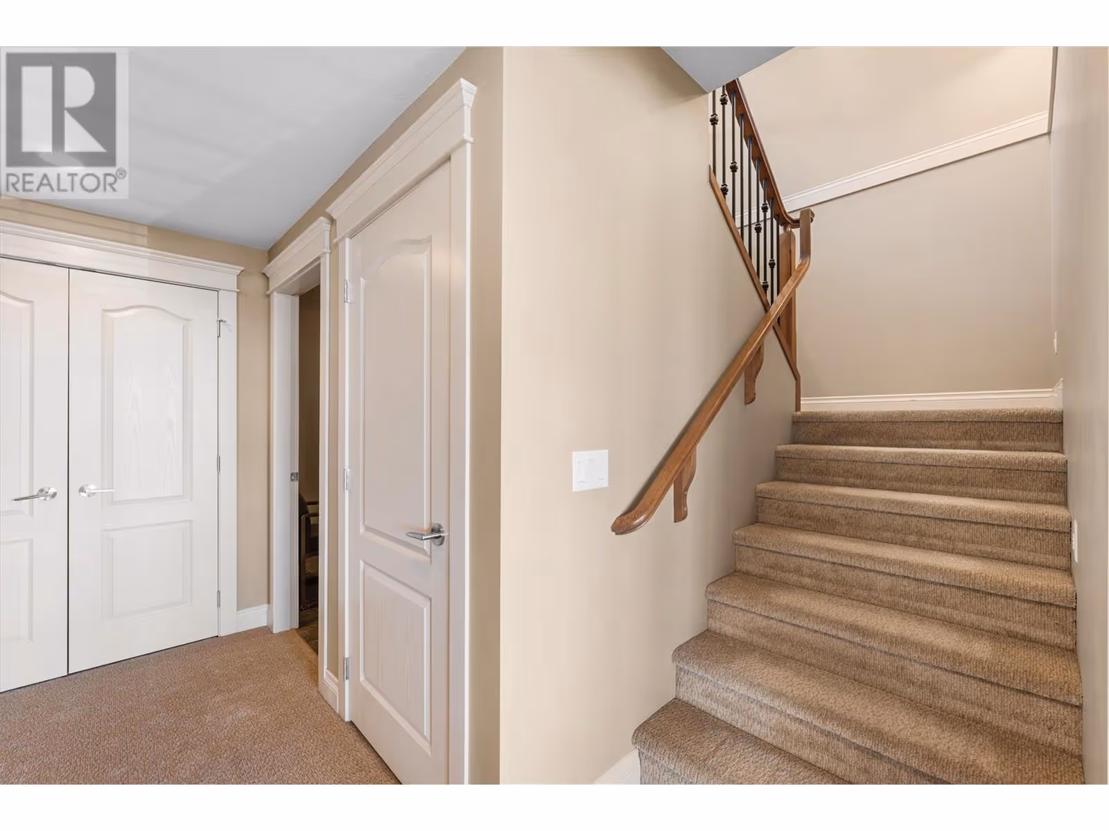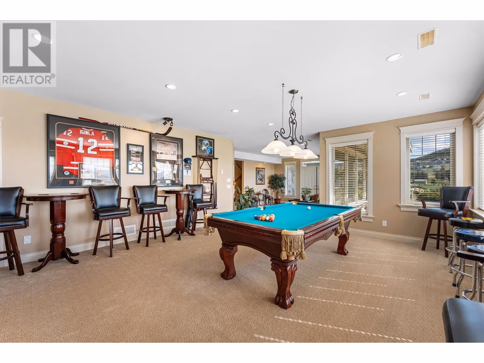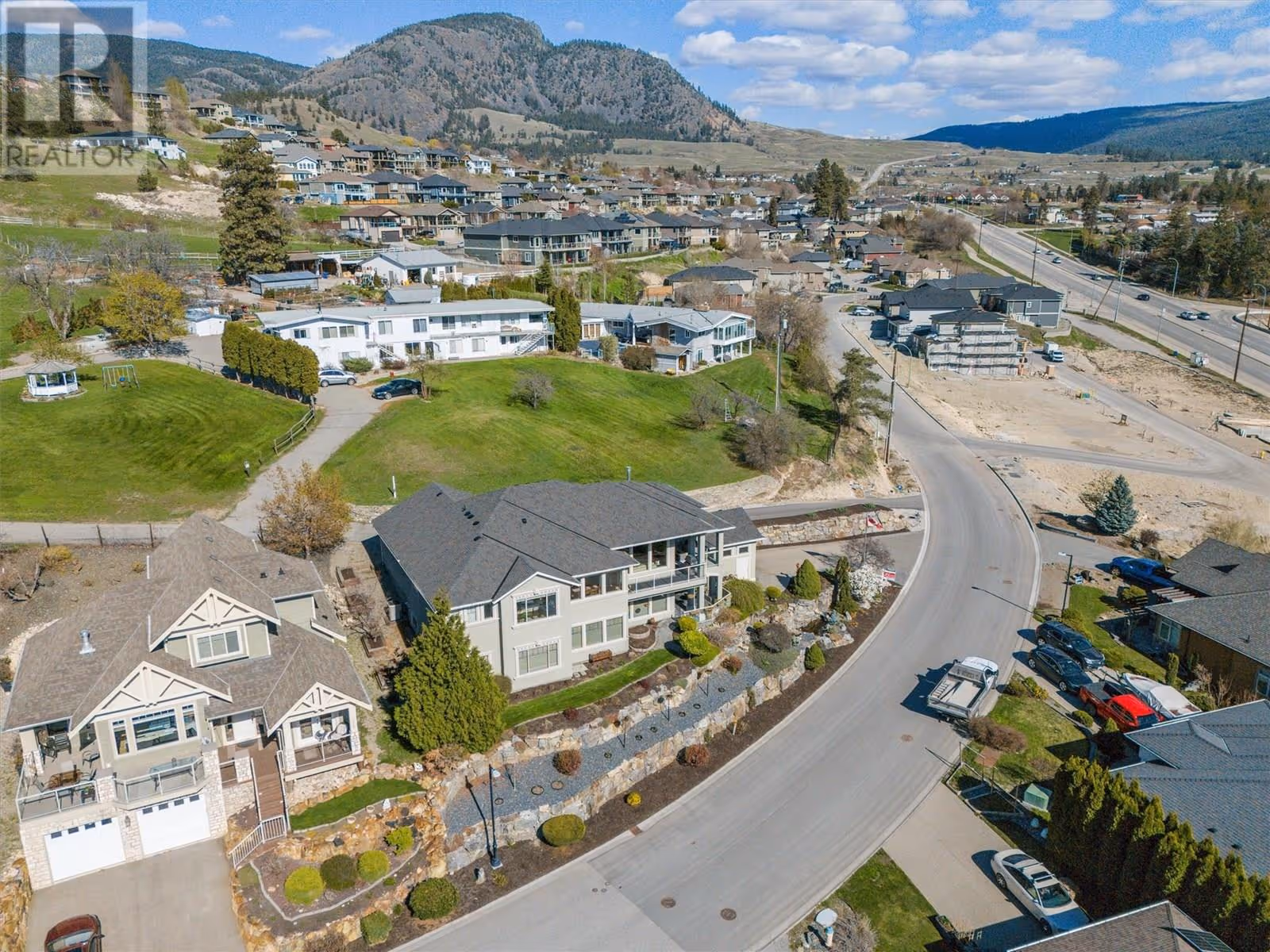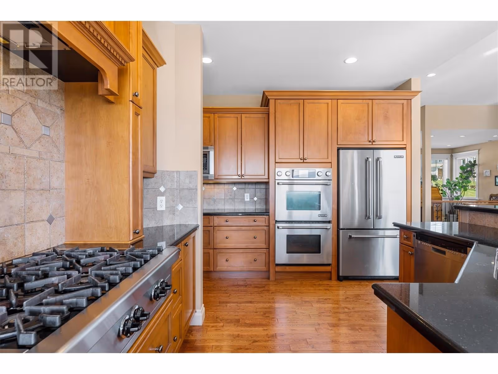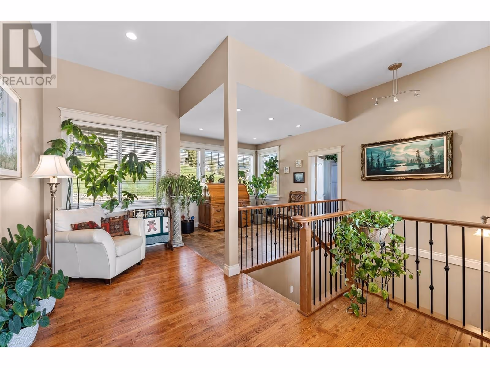 Tucked away in a tranquil Kelowna cul-de-sac, this custom-built home offers luxury & comfort. Situated on a meticulously landscaped corner lot with tiered rock walls its curb appeal is exceptional. This property boasts two distinct garages: an oversized double garage accessing the upper level, and a separate single garage leading to the lower level perfect for a potential suite conversion (with plans for a second kitchen). The expansive REC room featuring in-floor heating, a wet bar, and a versatile gym/media room, all with captivating city and lake views. This level also includes two guest bedrooms, a 4-piece bathroom, and abundant storage, ideal for entertaining or extended family. The upper level, bathed in natural light from large windows, showcases 11-foot ceilings and an open-concept living area framing stunning lake, mountain, and city vistas. The gourmet kitchen is a chef's dream, with a Wolf six-burner range, dual wall ovens, and pantry, flowing seamlessly into the living and dining areas. The wrap-around covered deck is perfect for year-round BBQs and sunsets. A flexible library space can be a formal dining room or home office. The expansive primary suite offers a spa-like ensuite with a soaker tub, steam shower, double vanity, and a dual-entry walk-in closet. A 2nd bdrm with a Murphy bed, a 2-piece powder room, and a full laundry room with garage access complete this level. With 2 driveways and 2 garages, there's abundant parking, including RV or boat space. (id:58842)
