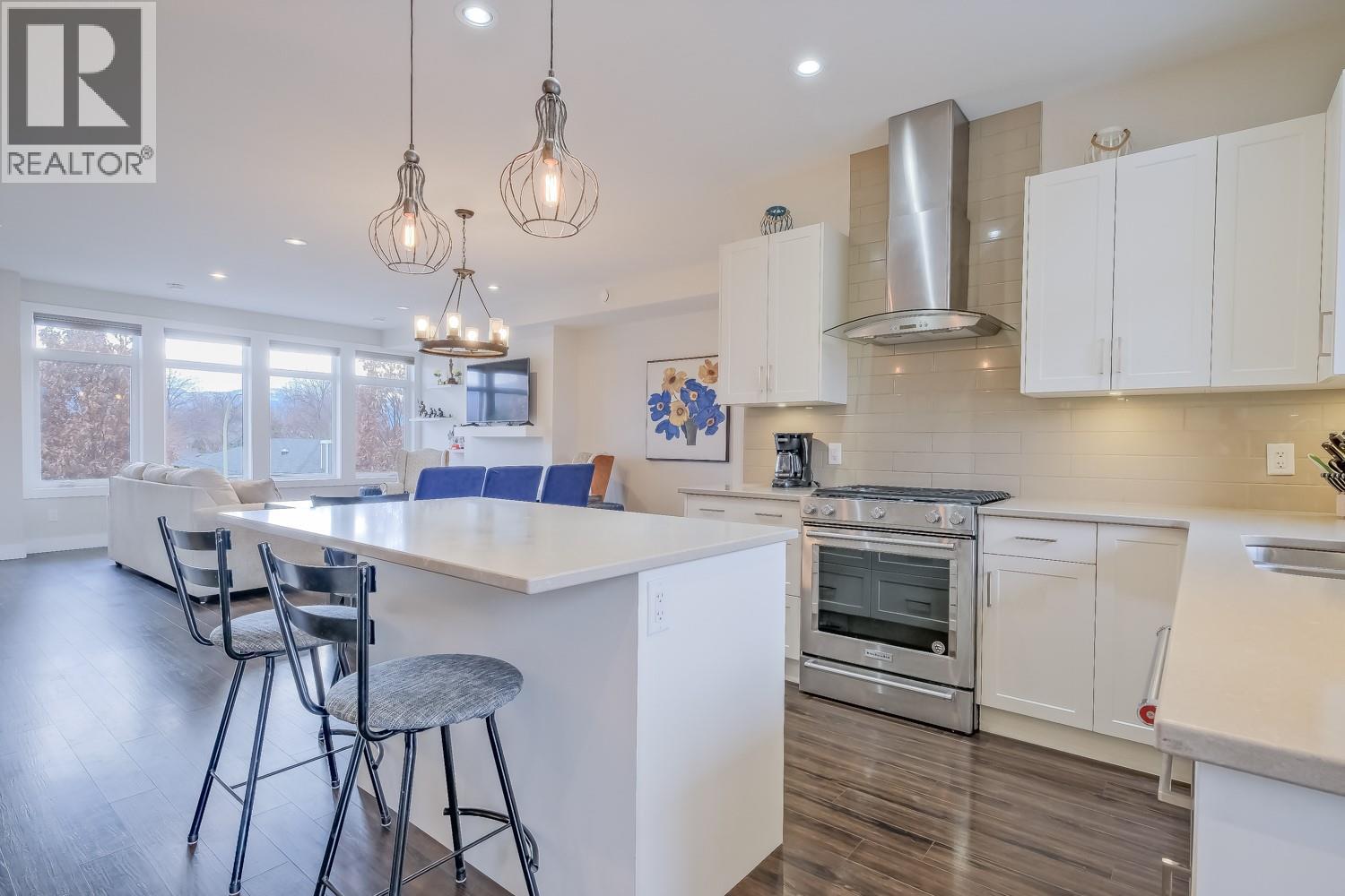Contemporary 3 Bedroom + Den, 2.5 Bathroom Townhome in Cameron Mews with tasteful exterior finishes of hardie board, brick & stucco! Nestled beside Guisacha Hertiage Park & gardens, this home features a Brownstone style entrance off Cameron Avenue. The location in the development lends itself to privacy with a mountain view south exposure from the living room. The main level great room concept features 9 foot ceilings, a beautiful quartz kitchen with soft close cabinets and a gas range. Just off the kitchen is a large, covered deck with a gas BBQ hook up. Open concept dining & living room, great for entertaining and a powder room with heated floors. The 3rd floor also features 9-foot ceilings, offers 3 bedrooms, 2 bathrooms & laundry with a sink. The primary bedroom features a 10 x 8-foot sliding glass door leading onto a balcony with picturesque mountain views. Completing the primary is a large walk-in-closet & en-suite with double under-mounted sinks, quartz counter-top and a tiled shower. Featuring a double garage plus a rare longer driveway offering room for a truck. Guests can park outside your home on Cameron or visitor parking located right across from this home. The location is ideal being close to KGH, Pandosy Village and just a short walk to the beach. With Guisachan Village right across the street you have everything at your fingertips. (id:58842)