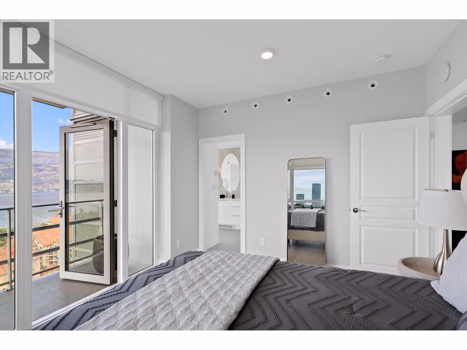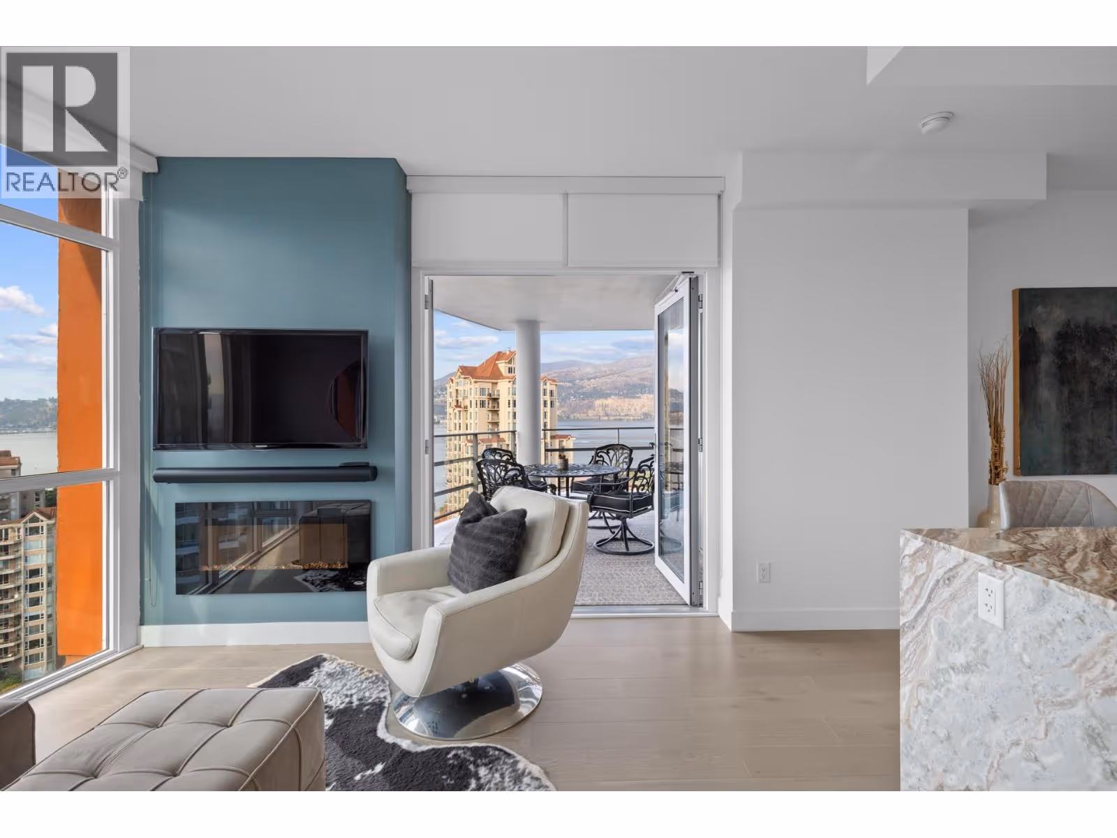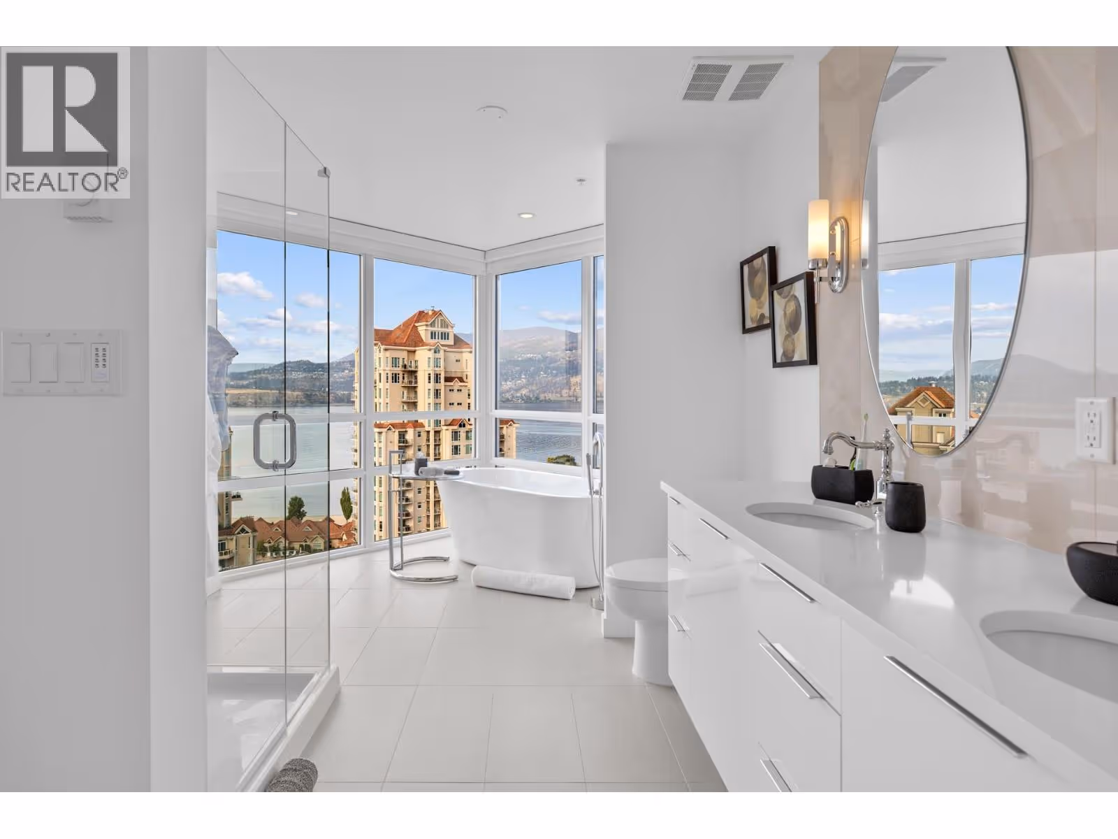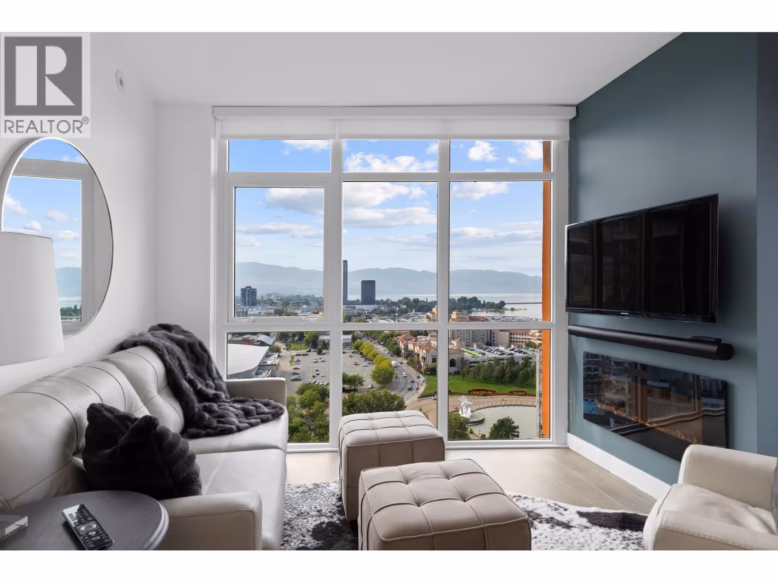 Experience elevated luxury living in the heart of downtown Kelowna. Soaring above the city on the 17th floor, this stunning 2 bed/2.5 bathroom home showcases west-facing views of Lake Okanagan, the city skyline, and evening sunsets-captured through dramatic floor-to-ceiling windows. Open the double doors to your wrap-around entertainer's balcony. The gourmet kitchen impresses with a waterfall island, stainless steel appliances including a gas stove, two-toned cabinetry, and an upgraded pantry with built-in storage. The primary retreat offers balcony access, custom walk-in closet storage, and a spa-inspired ensuite. A bathtub lover's dream-indulge the stand-alone soaker tub while taking in the breathtaking views, or refresh in the waterfall shower. Dual vanities with designer sinks complete the spa-like feel. The second bedroom also features a 4-piece ensuite, walk-through closet, and additional upgraded storage. Additional highlights include a cozy electric fireplace, in-suite laundry, 2 parking stalls and 1 storage locker. Residents enjoy resort-style amenities: fitness centre, social and BBQ areas, and a year-round plunge pool-heated in winter, cooled in summer. All this in a prime downtown location, just steps to the beach, boutique shops, award-winning restaurants, breweries, concerts, and Kelowna's vibrant cultural scene. 2 pets welcome with restrictions. (id:58842)