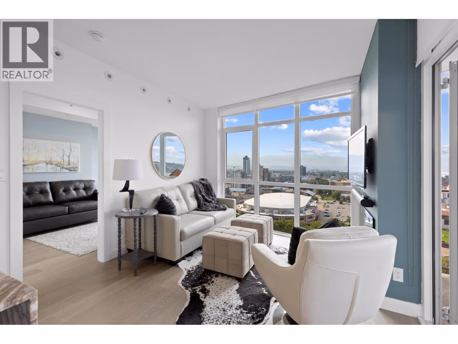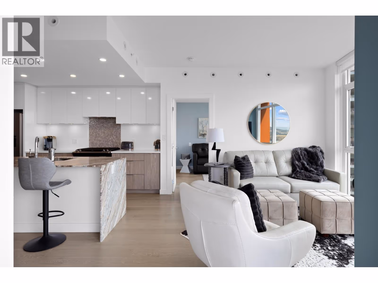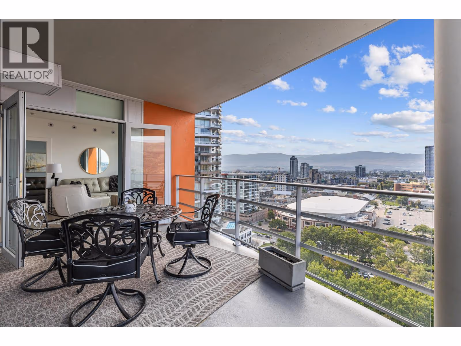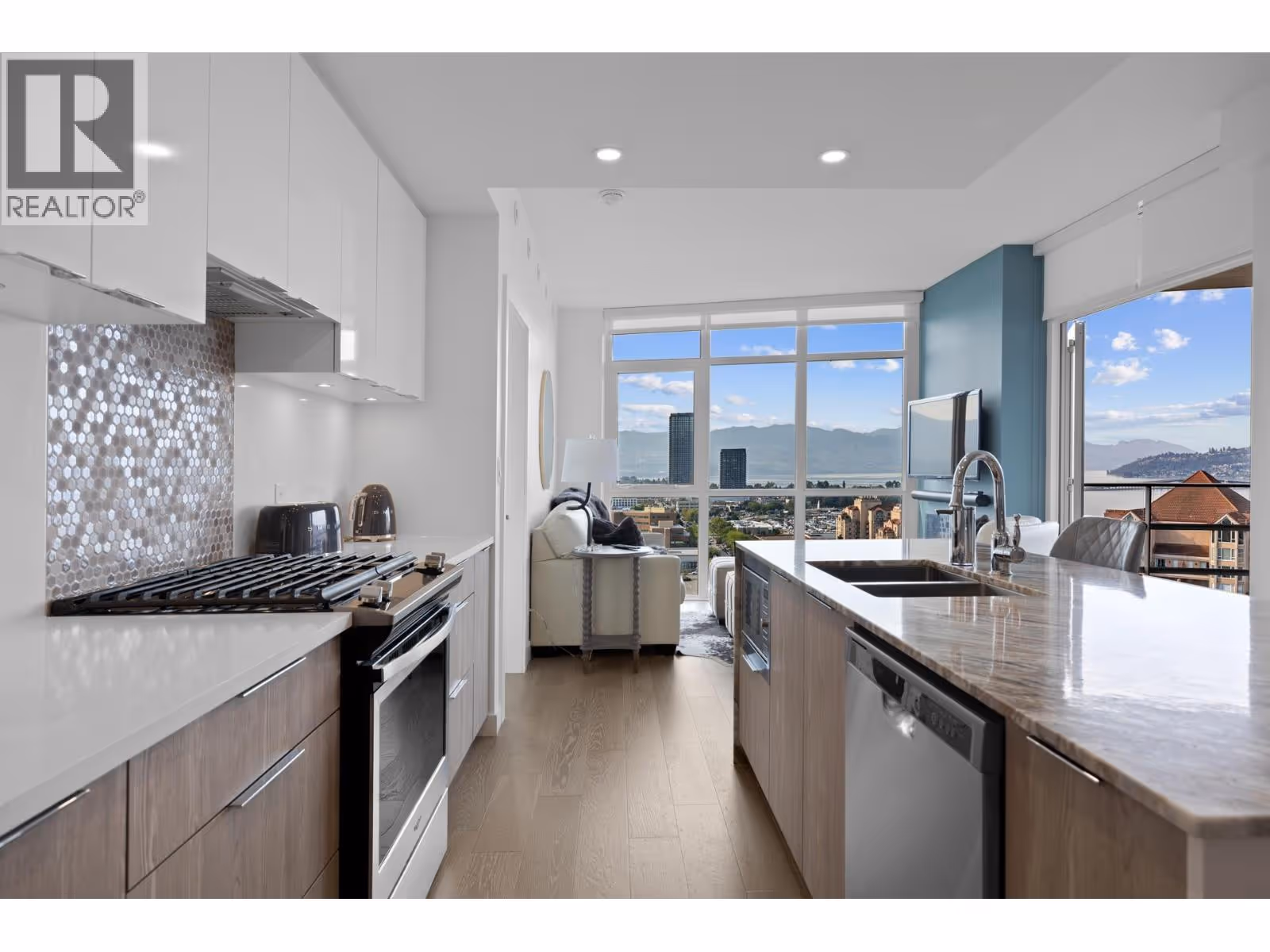 Experience elevated luxury living in the heart of downtown Kelowna. Soaring above the city on the 17th floor, this stunning 2 bed/2.5 bathroom home showcases west-facing views of Lake Okanagan, the city skyline, and evening sunsets-captured through dramatic floor-to-ceiling windows. Open the double doors to your wrap-around entertainer's balcony. The gourmet kitchen impresses with a waterfall island, stainless steel appliances including a gas stove, two-toned cabinetry, and an upgraded pantry with built-in storage. The primary retreat offers balcony access, custom walk-in closet storage, and a spa-inspired ensuite. A bathtub lover's dream-indulge the stand-alone soaker tub while taking in the breathtaking views, or refresh in the waterfall shower. Dual vanities with designer sinks complete the spa-like feel. The second bedroom also features a 4-piece ensuite, walk-through closet, and additional upgraded storage. Additional highlights include a cozy electric fireplace, in-suite laundry, 2 parking stalls and 1 storage locker. Residents enjoy resort-style amenities: fitness centre, social and BBQ areas, and a year-round plunge pool-heated in winter, cooled in summer. All this in a prime downtown location, just steps to the beach, boutique shops, award-winning restaurants, breweries, concerts, and Kelowna's vibrant cultural scene. 2 pets welcome with restrictions. (id:58842)