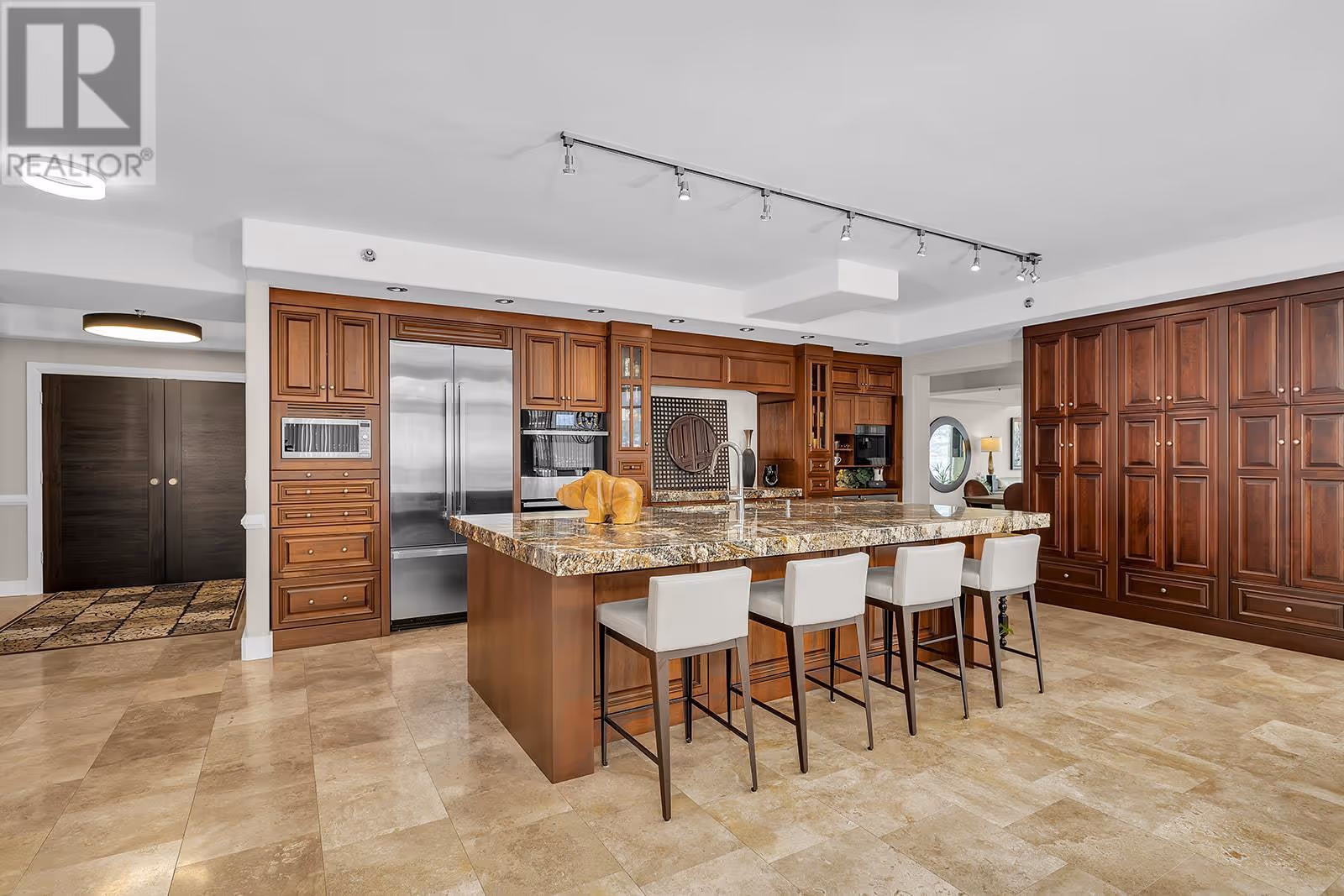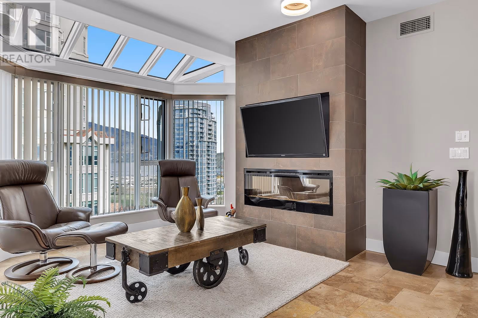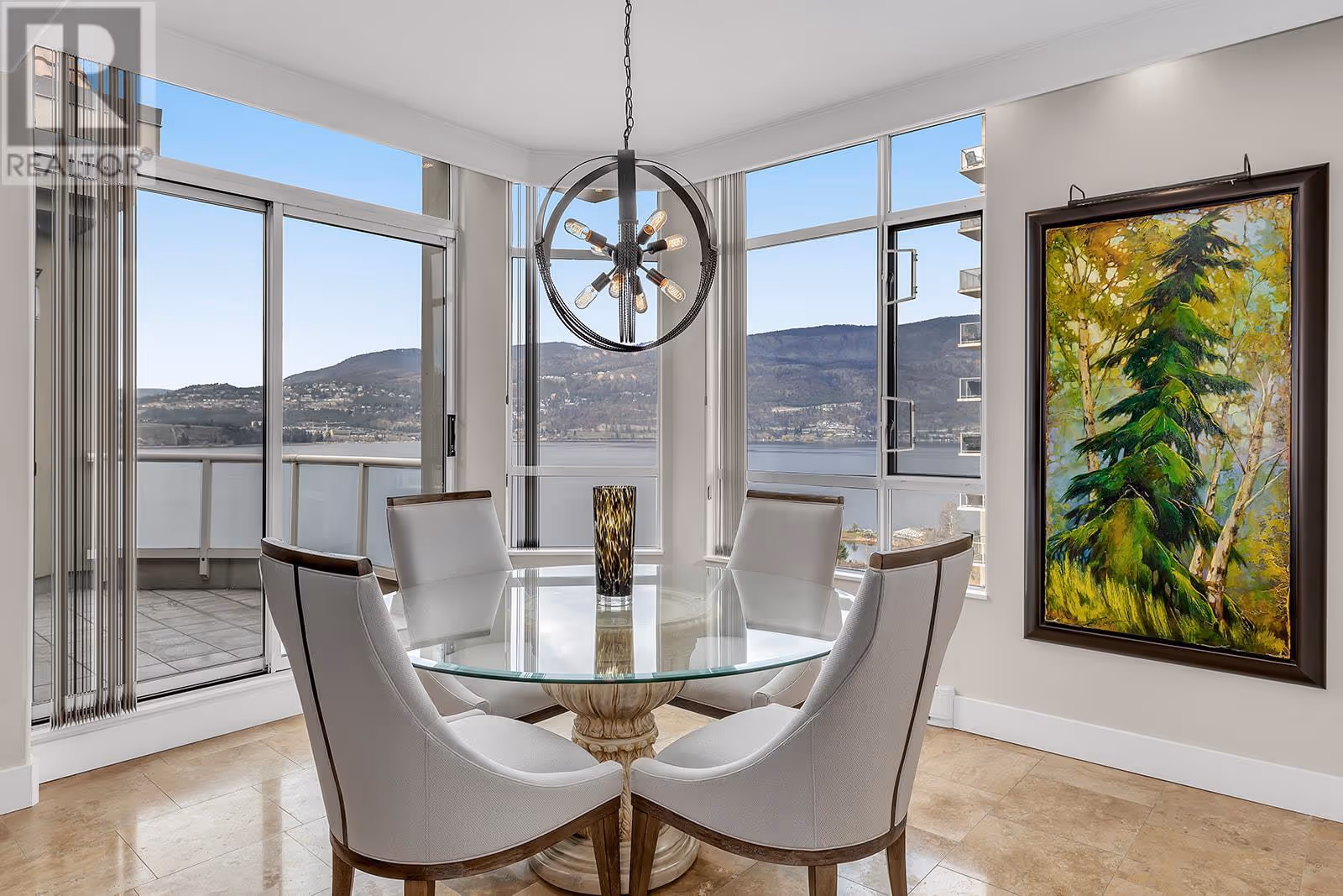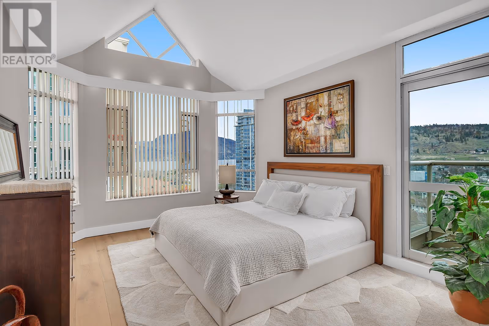 Now's your opportunity to own one of Kelowna’s most extraordinary lakefront penthouses. Spanning 3,000 sq ft of refined luxury, this meticulously renovated residence sits high above the city, offering sweeping panoramic views of Okanagan Lake, the bridge, the city skyline, and the sandy beach below. Elegantly renovated throughout, highlighted updates include crafted medieval walnut doors, refreshed window coverings, and a large gourmet kitchen with premium granite countertops complemented by state-of-the-art appliances. The vaulted living room, with its modern gas fireplace, overlooks the expansive views with access to one of your three private decks, perfect for sunrises with your morning coffee or sunsets with your favourite glass of Okanagan wine, selected directly from your temperature-controlled built-in wine library. The expansive primary bedroom, crowned with a vaulted ceiling, flows seamlessly from the walk-through closet with its custom-designed built-ins to the reimagined ensuite, now a spa-like haven with granite countertops, a grand floor-to-ceiling granite walk-in shower, and heated floors. The penthouse comes with two secure underground parking spots, a same floor storage room, and access to premium amenities including two pools, steam room and gym. There’s even an option for boat moorage in the Lagoon. Positioned in the heart of downtown Kelowna, you’ll enjoy unparalleled walkability to world-class dining, shopping, galleries, theatres, and the beach. (id:58842)