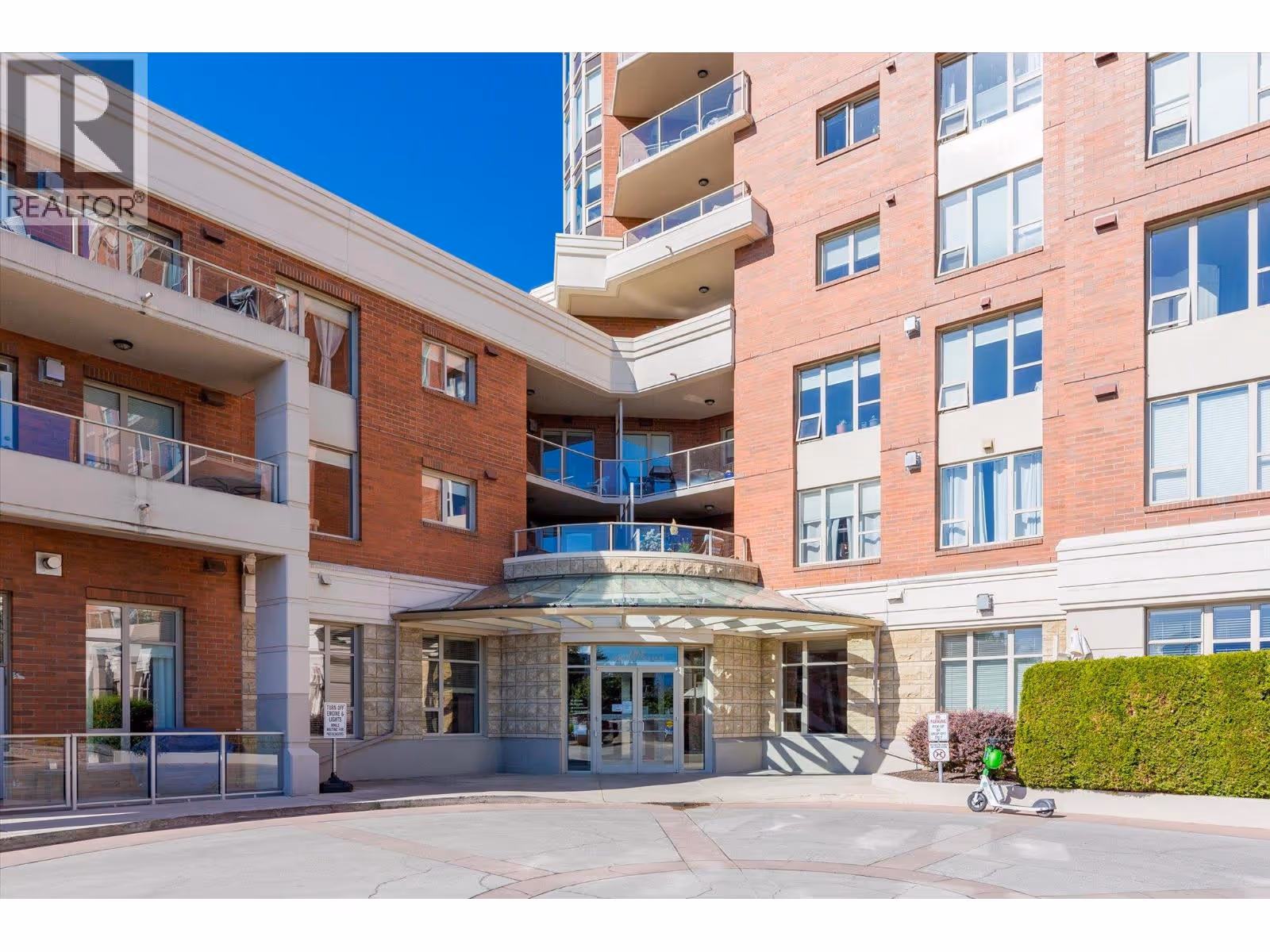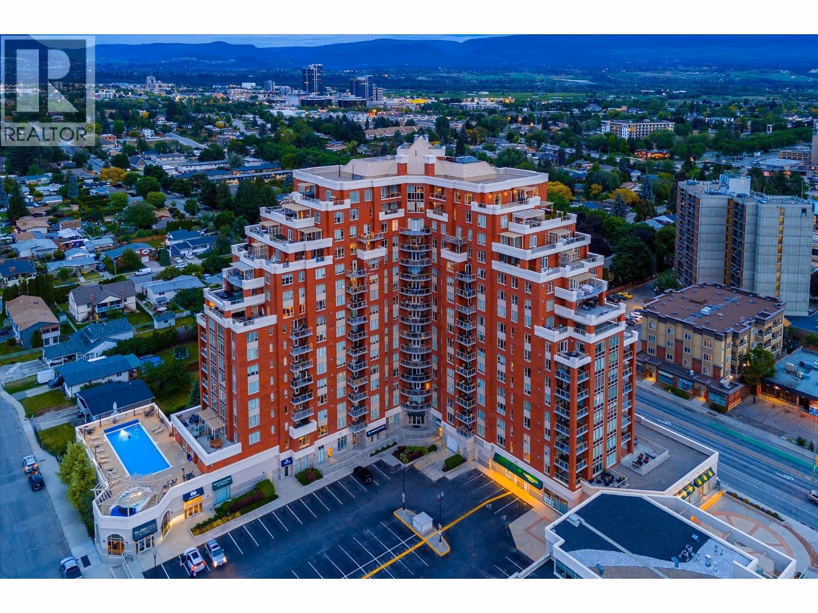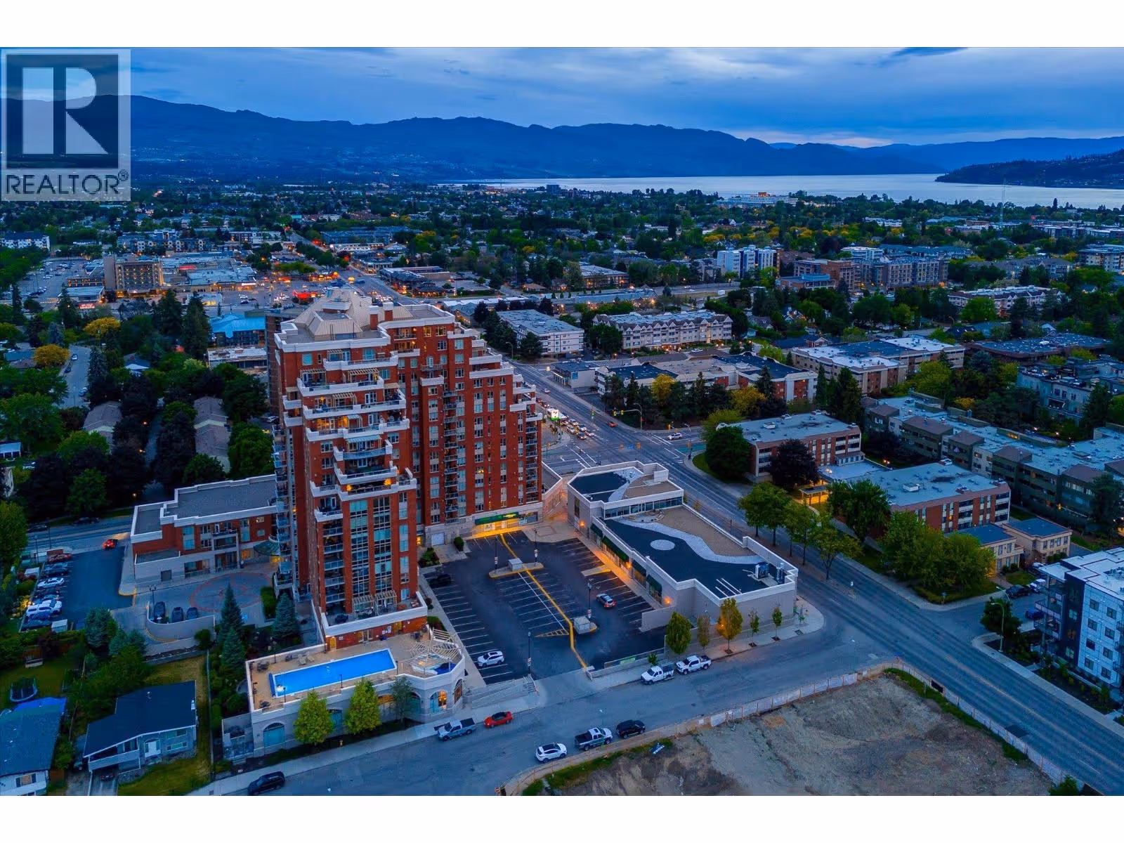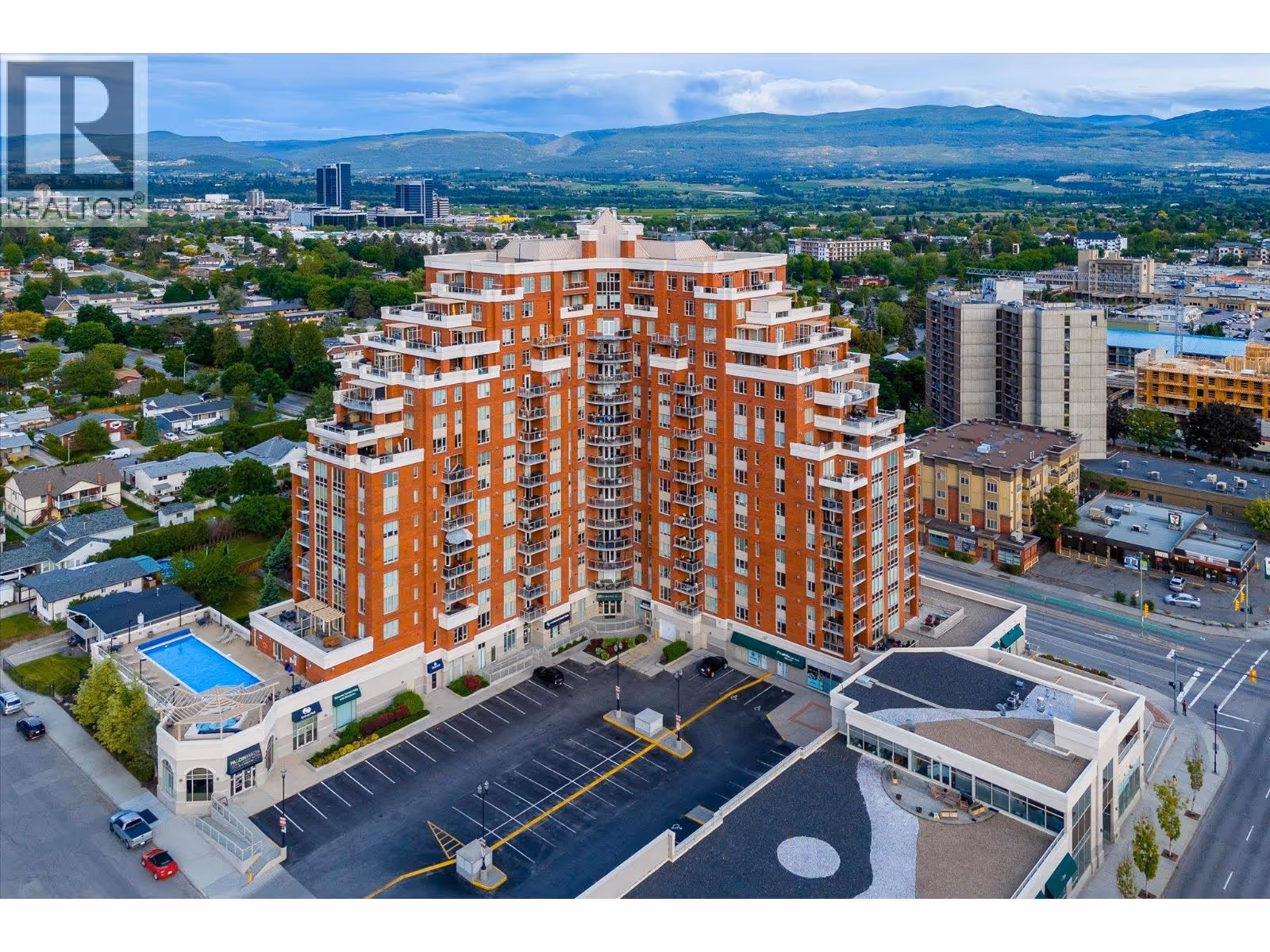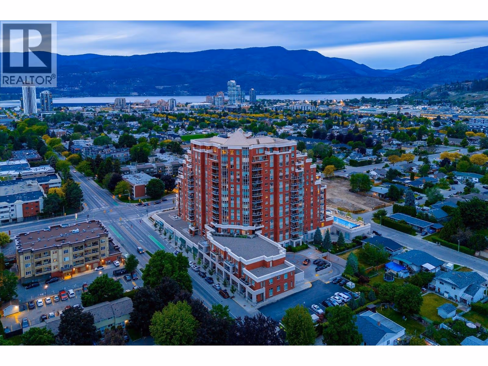 Two Bedroom + Den with 2 parking stalls—this condo puts you right on the edge of downtown Kelowna. Lake, city, and mountain views from the 12th floor. Located in one of the city’s most sought-after buildings, residents enjoy premium amenities including a pool, hot tub, dry sauna, steam room, and gym, with groceries just an elevator ride away. The unit itself is spacious and features a smart split-bedroom floor plan and a den with sliding doors complete with a built-in Murphy bed— perfect for guests or an ultra flexible work or hobby space. Enjoy a generous kitchen with new stainless steel appliances, an oversized island, plenty of storage, and ample prep space—perfect for hosting or everyday living. In the living room, a cozy gas fireplace anchors the space, framed by big windows and stunning views. Retreat to the primary bedroom, where you will find a spacious walk in closet, as well as an ensuite with dual vanities and a separate soaker tub. Step out onto the private balcony to soak up the scenery, all framing those iconic Kelowna views. This condo also comes with two parking spots and a storage locker, and the building welcomes 2 dogs (up to 14"" at the shoulder) or 2 cats! Whether it’s biking the nearby trails, beach days, brewery hopping, or dining out, this location connects you to everything If you’re looking for comfort, convenience, and a view, this condo is sure to check all of the boxes! (id:58842)