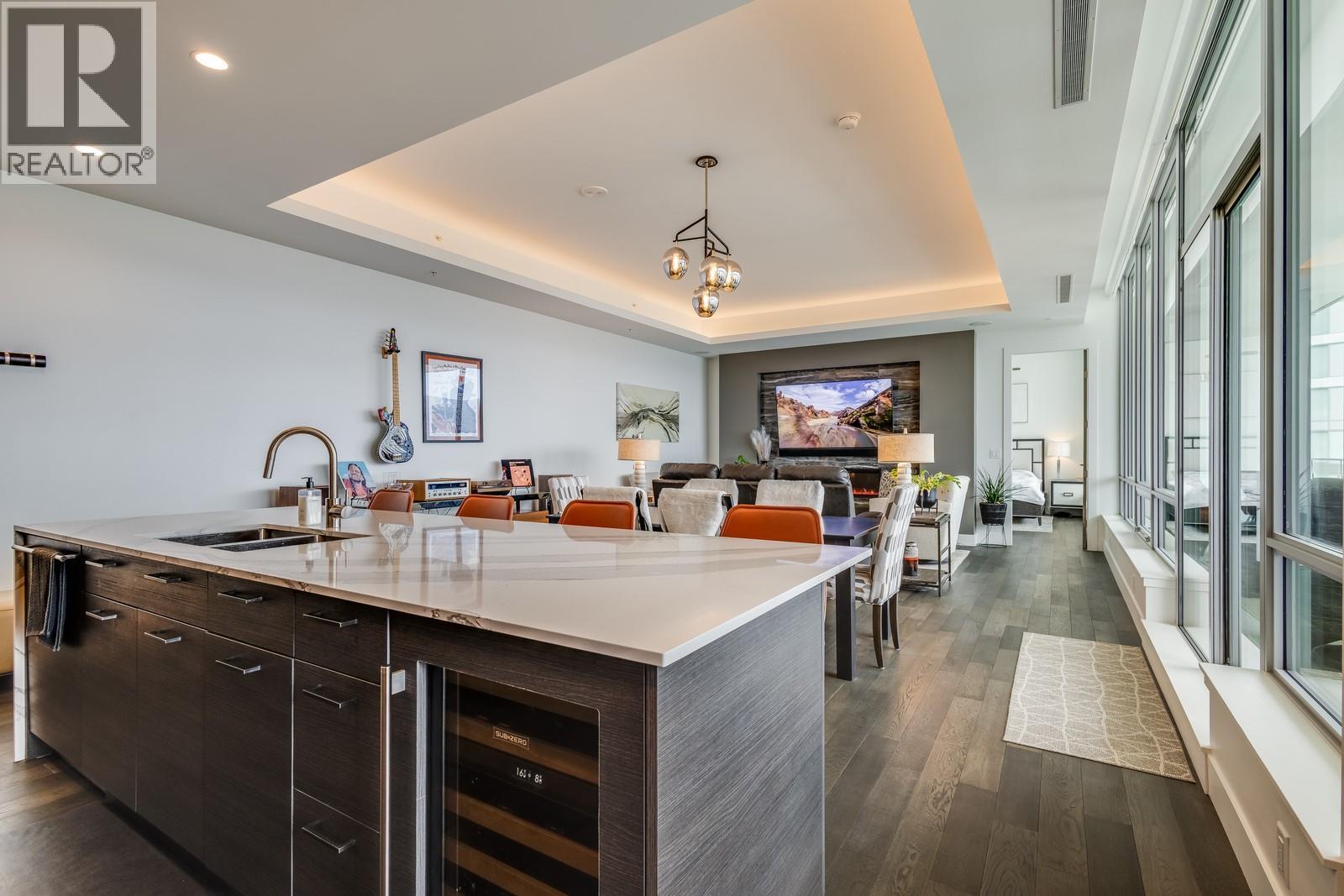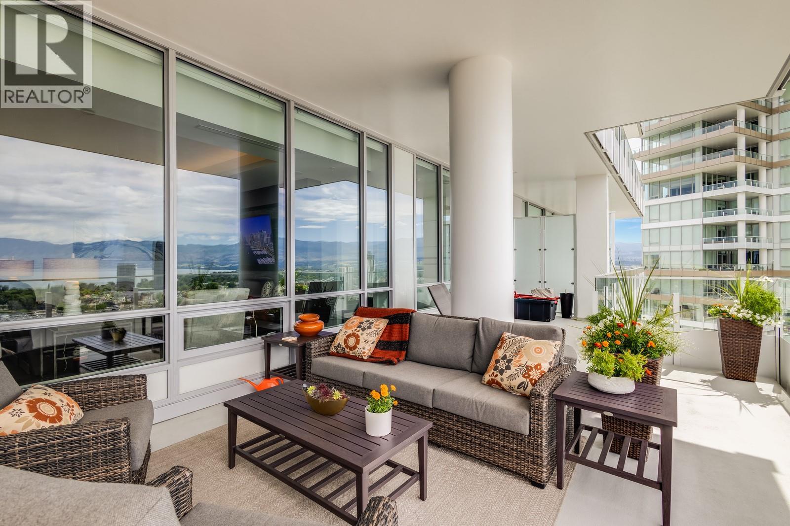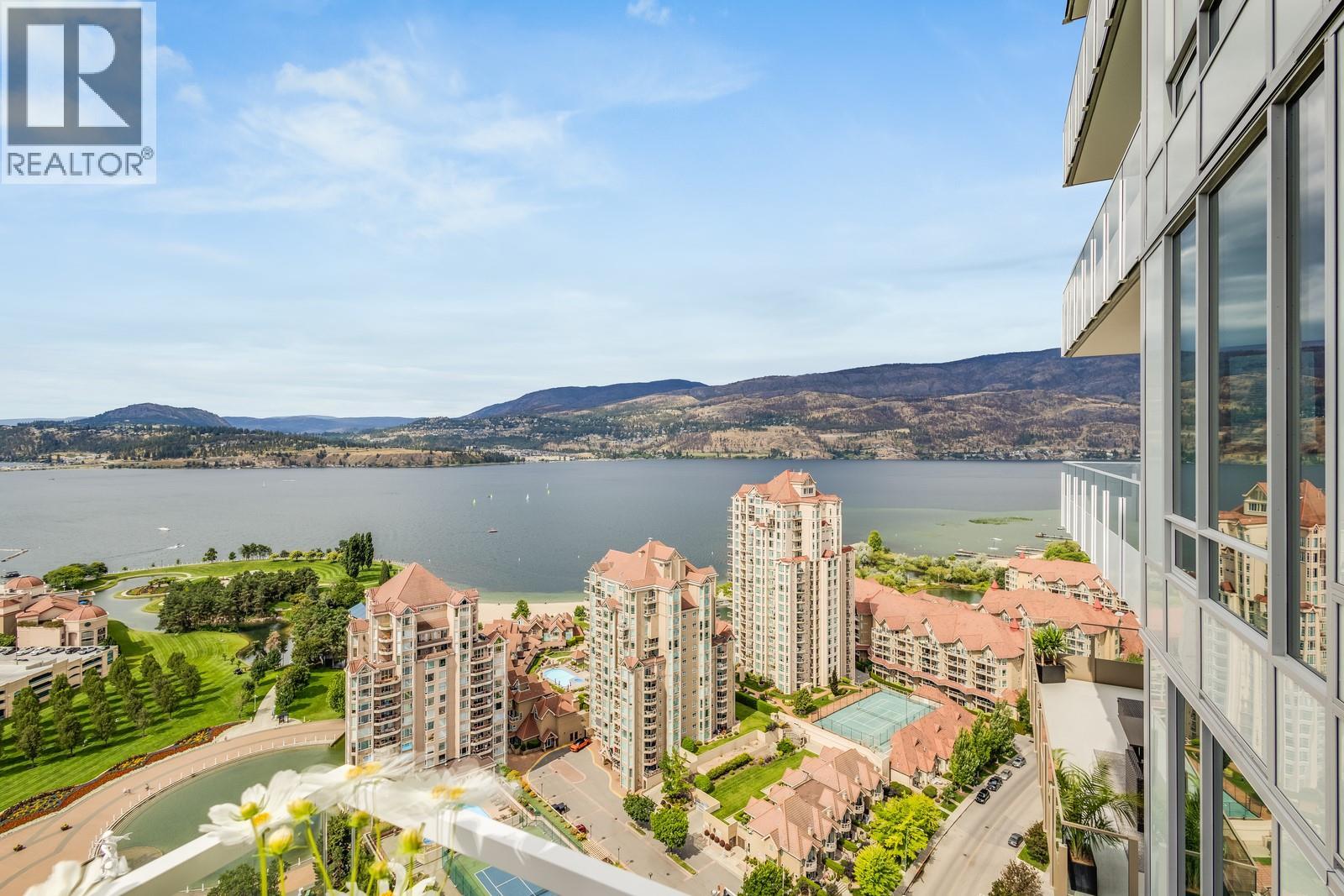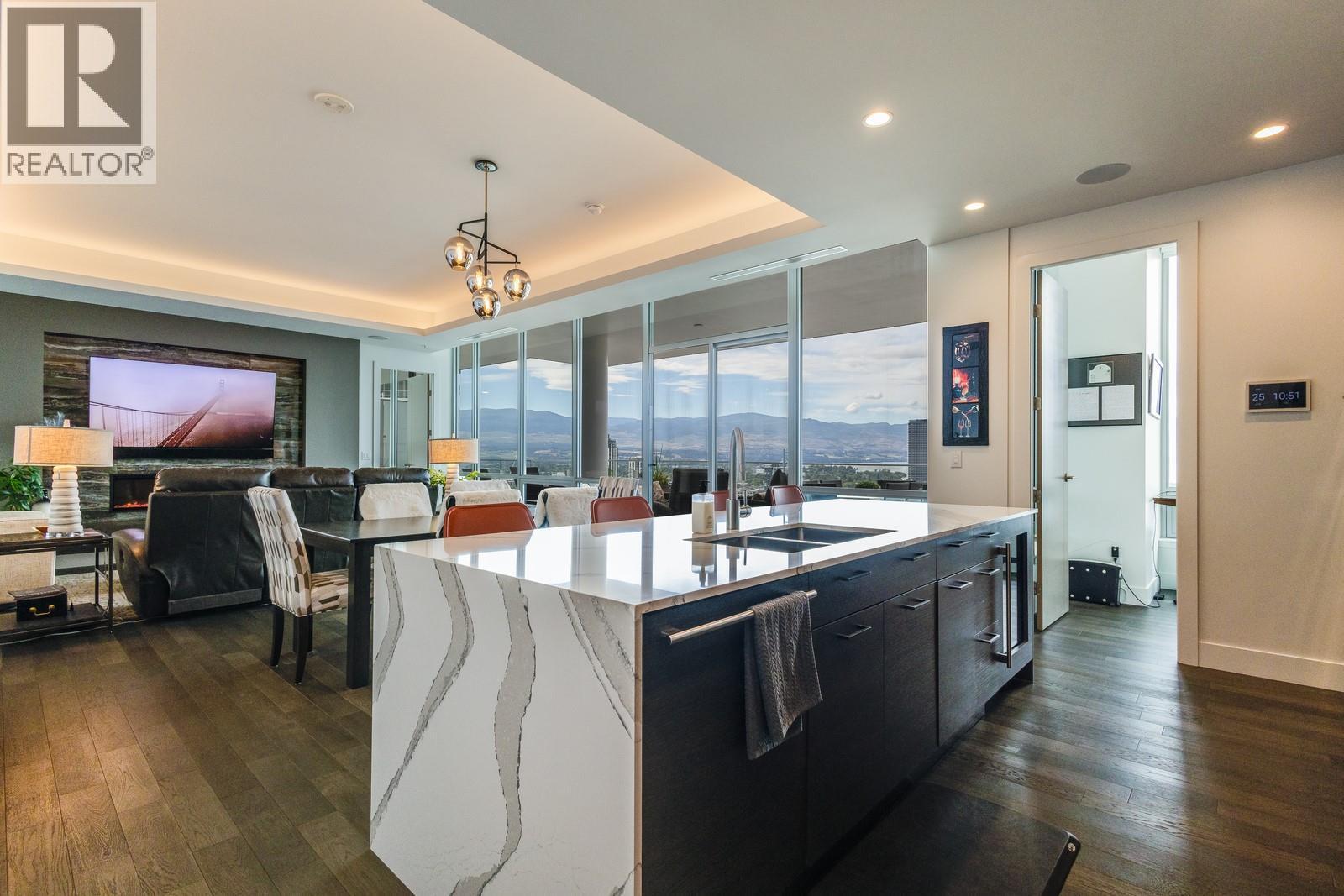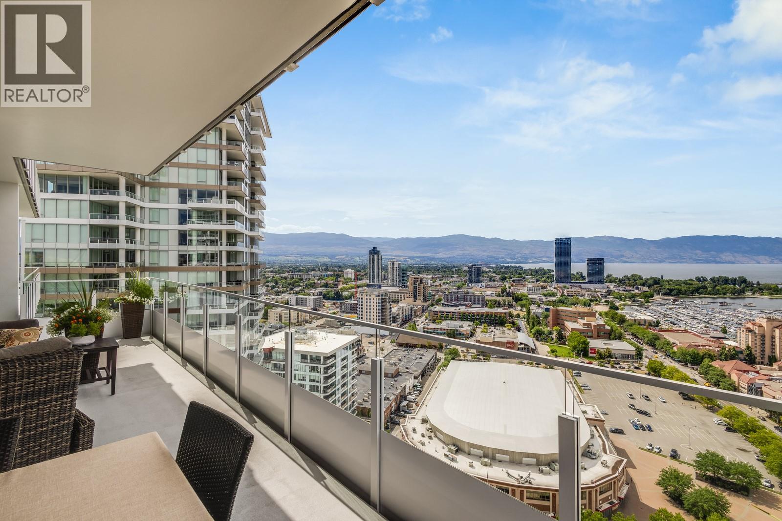 Sub-Penthouse | 2 Bedrooms + Den | 26th Floor | One Water Experience stunning panoramic vistas of Kelowna’s skyline, Lake Okanagan, and the scenic mountains from the upper levels of One Water Street! This spacious 2-bedroom plus den sub-penthouse features an open-concept layout with 10'5"" ceilings and high-end finishes throughout. The residence boasts a sleek selection of stainless steel appliances, including a Control4 smart home package, and an expansive outdoor patio perfect for enjoying the breathtaking surroundings. The modern kitchen is equipped with large quartz countertops, a waterfall island, a Sub-Zero fridge, Wolf gas cooktop, and built-in wall oven—ideal for entertaining while taking in the remarkable city and lake views through floor-to-ceiling windows. The adjacent living area is surrounded by windows and provides access to the large covered deck, creating a seamless indoor-outdoor living experience. The master suite features a luxurious spa-inspired ensuite and walk-in closet. What sets this unit apart is the 2 side-by-side parking spots and huge storage locker. Within this resort-like community, residents enjoy a range of amenities including BBQ and firepit enclaves, an oversized hot tub, swimming pools, a multi-purpose entertainment room, gym, a dog park, and more. Living on one of the best streets in Kelowna, you’re across the street from our world-famous lake and beaches, plus some of the best cafes, restaurants, and shops the Okanagan has to offer! (id:58842)