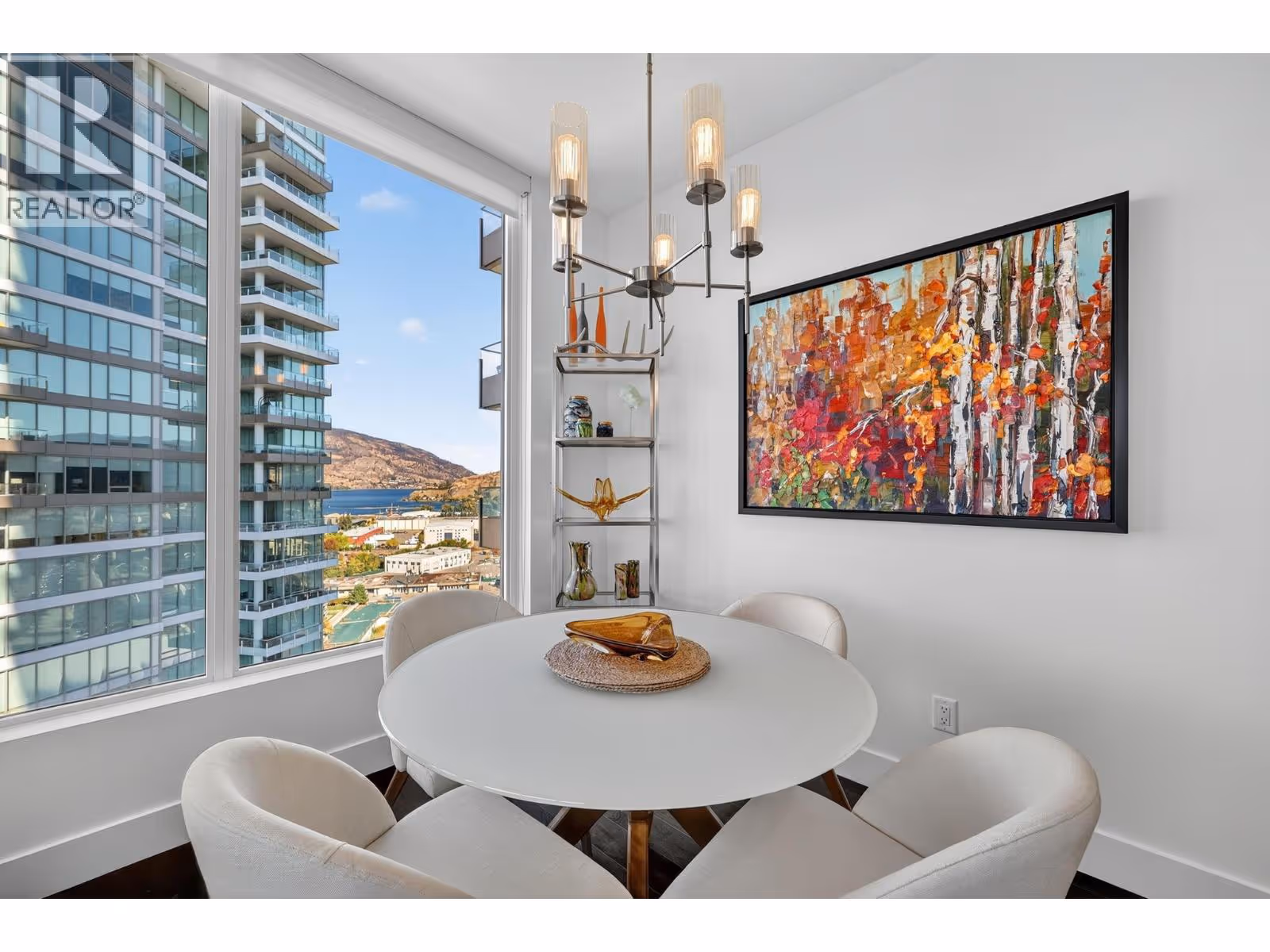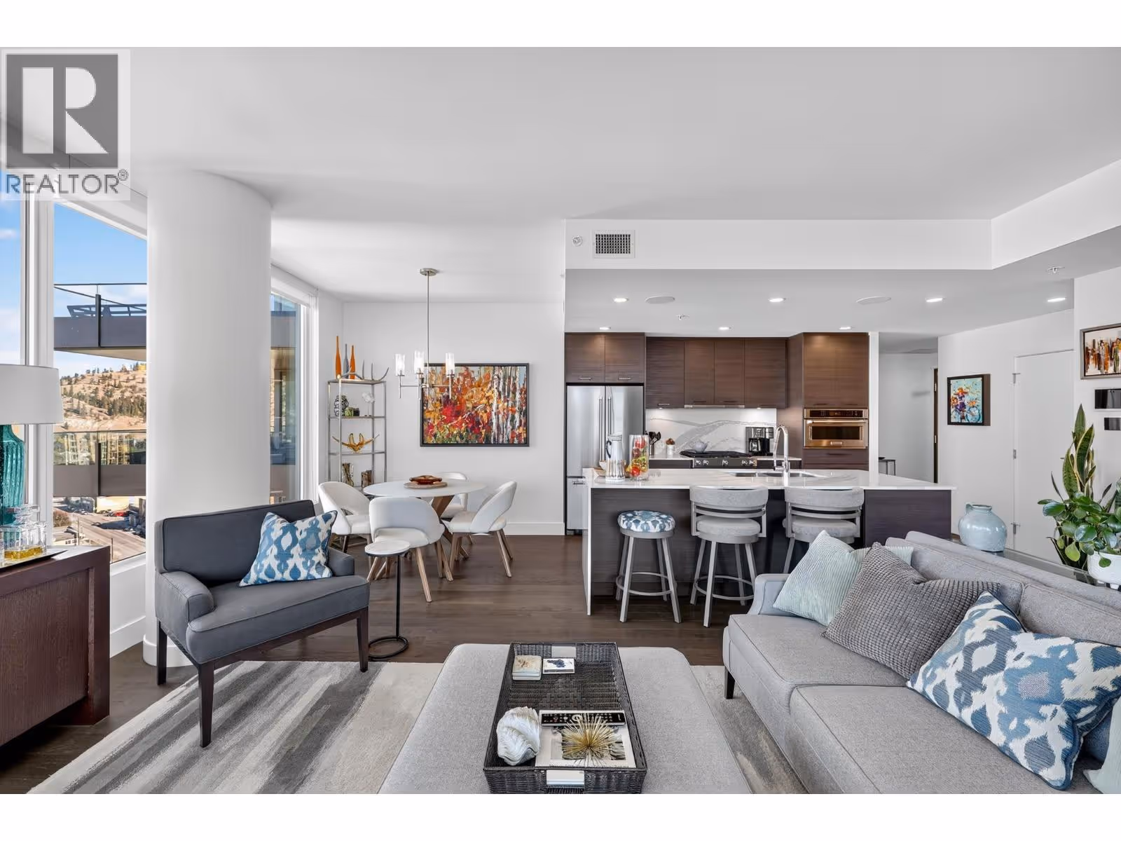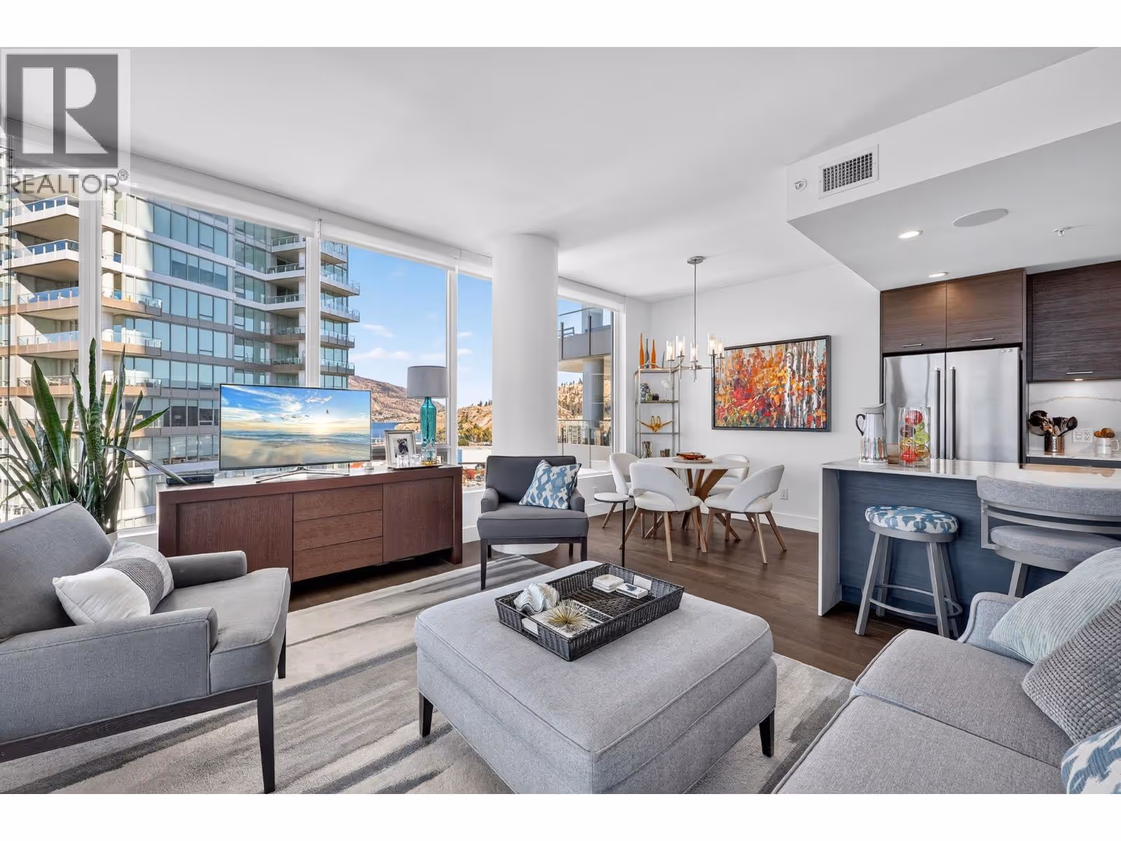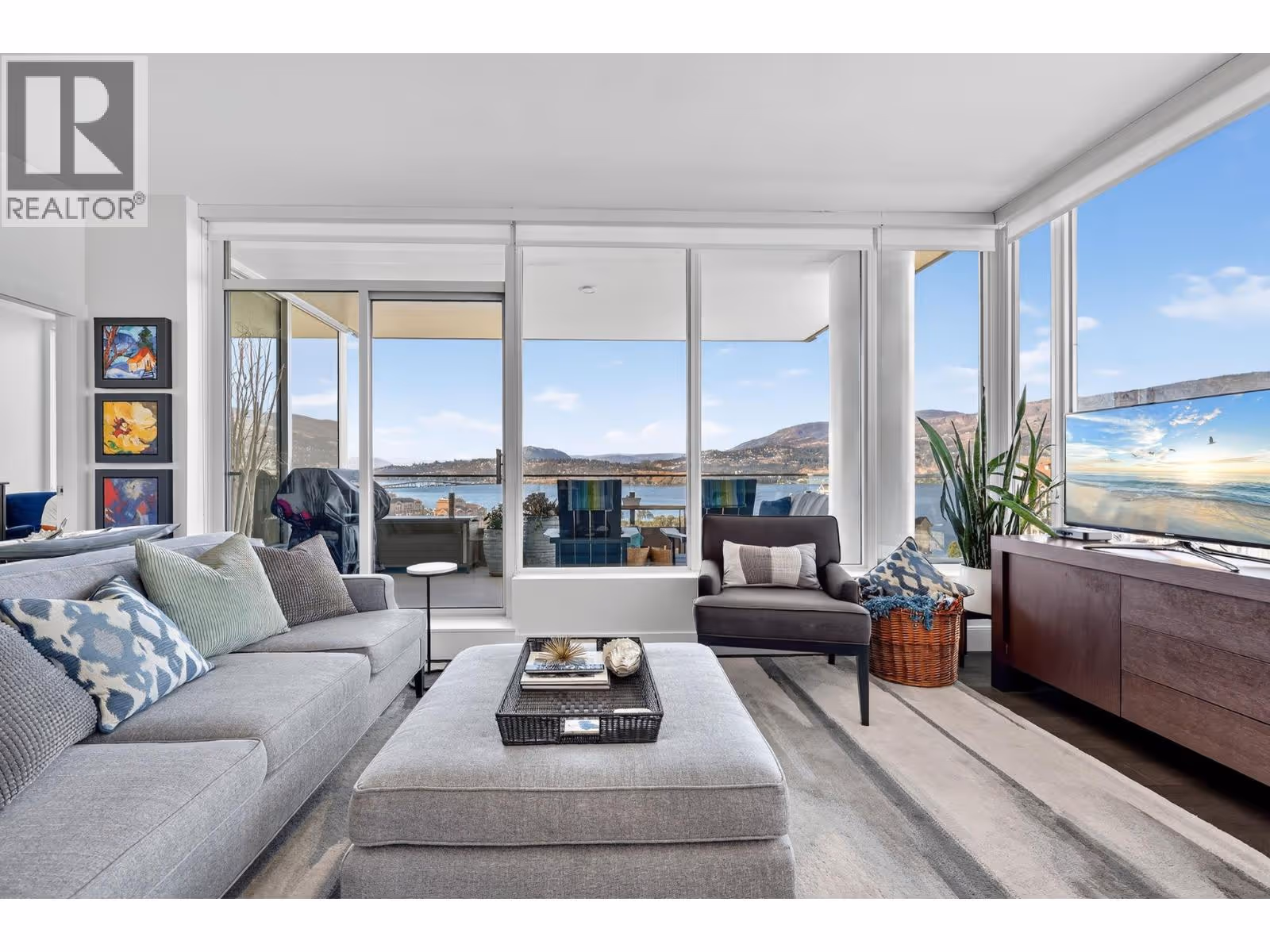 Welcome to One Water – Downtown Kelowna’s premier address for luxury urban living. This nearly new 2-bedroom, 2-bathroom condo sits high on the 16th floor, showcasing breathtaking 180° panoramic views of Lake Okanagan, downtown, and the surrounding mountains. Designed with sophistication in mind, the open-concept layout features floor-to-ceiling windows, soaring ceilings, and high-end finishes throughout. The gourmet kitchen boasts quartz countertops, a waterfall-edge island, KitchenAid stainless steel appliances, a gas 5-burner cooktop, soft-close cabinetry, and an under-mounted sink. Enjoy the privacy of a split-bedroom design and unwind on the spacious covered deck with a natural gas BBQ hookup. Another feature of this stunning home is the Control4 entertainment system, which includes a built in sound system and allows control of lights, thermostat, and door lock from your phone or a wall mounted iPad. Additional highlights include in-suite laundry, secured underground parking with EV charging, and a storage locker. One Water offers resort-style amenities: lap and leisure pools, hot tub, pickleball courts, fitness and yoga studios, fire pits, outdoor BBQ/lounge areas, pet zone, business centre, guest suite, car wash bay, and ample guest parking. Ideally located within walking distance to Kelowna’s vibrant waterfront, beaches, marina, restaurants, shops, and entertainment. Rentals and pets welcome – Okanagan living at its finest! (Up to 2 Large breed dogs allowed) (id:58842)