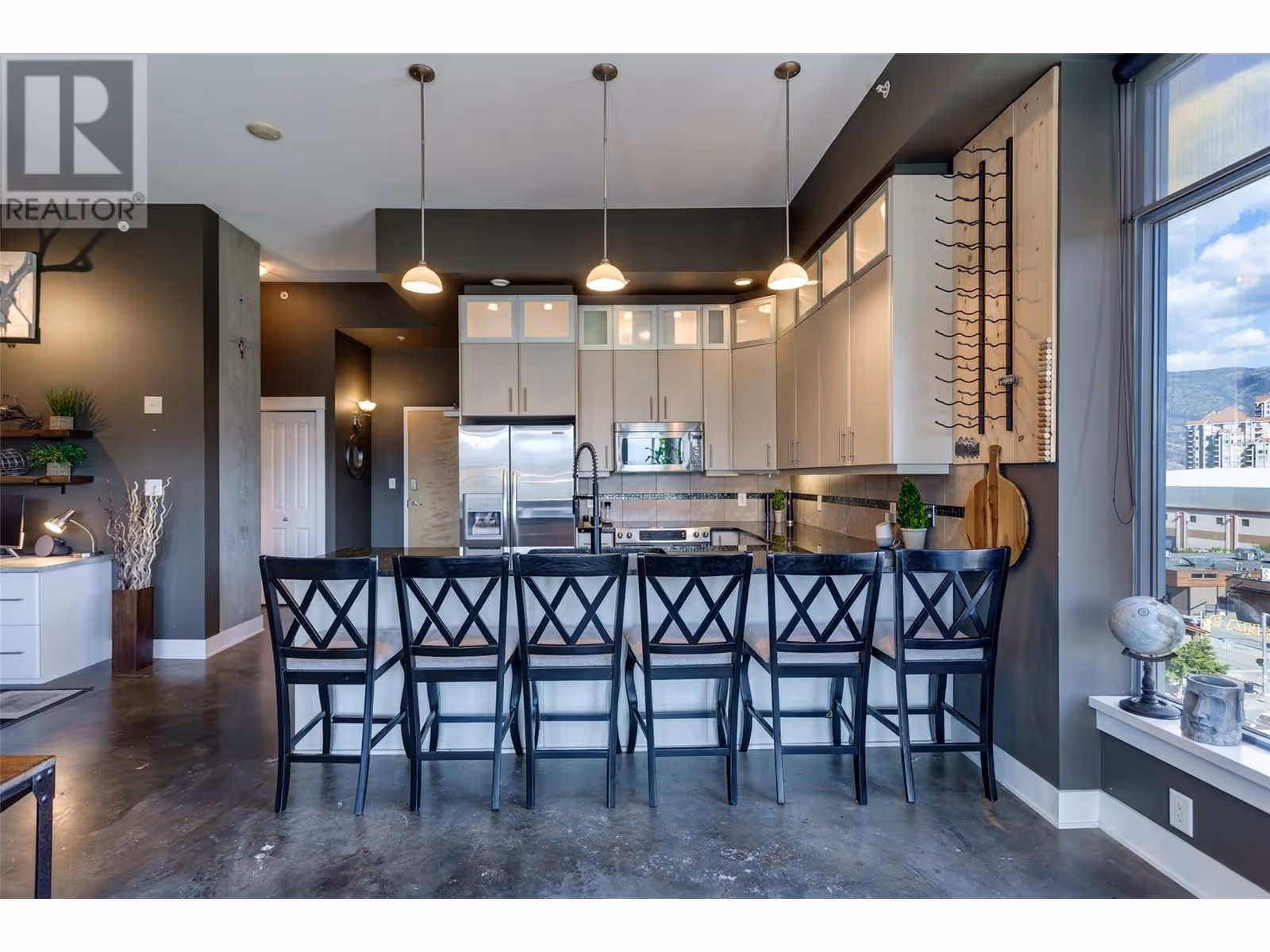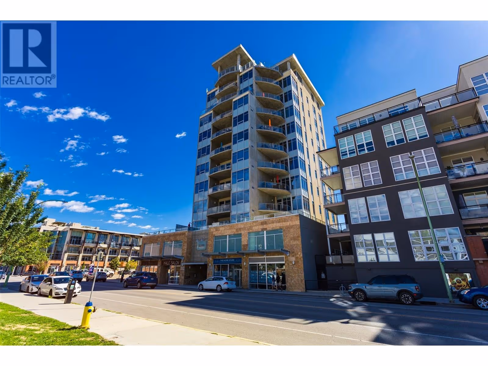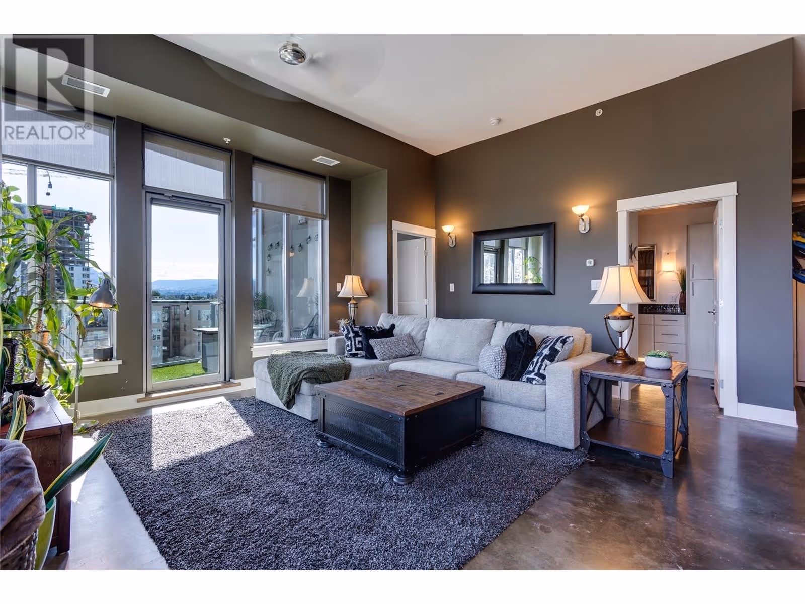 Welcome to elevated urban living in one of Kelowna’s most sought-after concrete high-rises. This bright and airy open-concept condo features soaring 11-foot ceilings and floor-to-ceiling windows that showcase panoramic city, mountain, and peek-a-boo views of the lake. Located on the quiet side of the building, the unique northeast exposure offers both morning sunrises and evening light. The interior blends modern style with industrial character, highlighted by exposed concrete and structural pillars that create a bold architectural statement. Thoughtful touches include a Murphy-Bed and workspace in the Den/Office area, a fitness room, secure bike storage, a storage locker, and one of the most desirable underground parking stalls in the building. Situated in the heart of Kelowna’s vibrant Cultural District, you’re steps to the waterfront, parks, dining, shopping, entertainment, and more. A rare opportunity to enjoy urban sophistication with nature and lifestyle at your doorstep. Don't miss out on your opportunity to own this amazing condo! (id:58842)