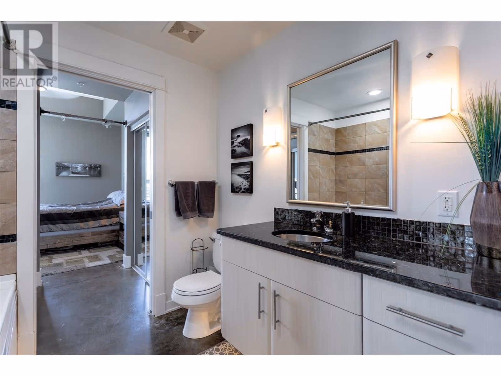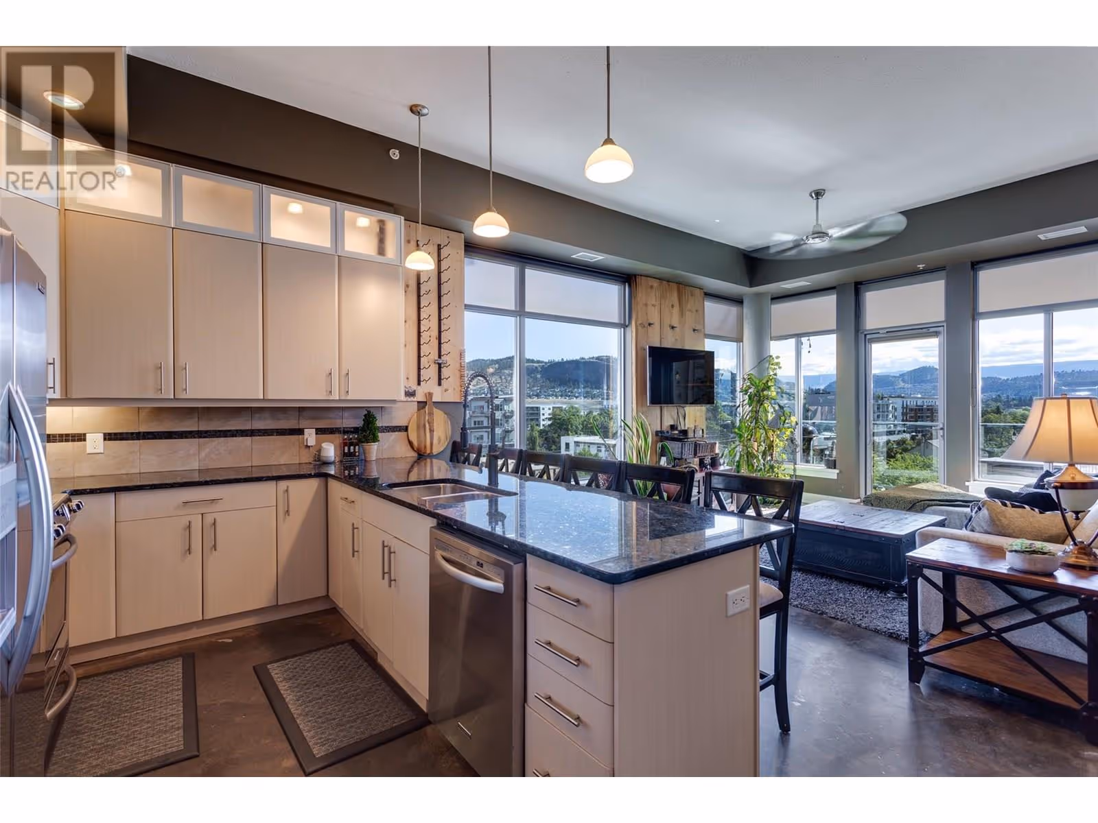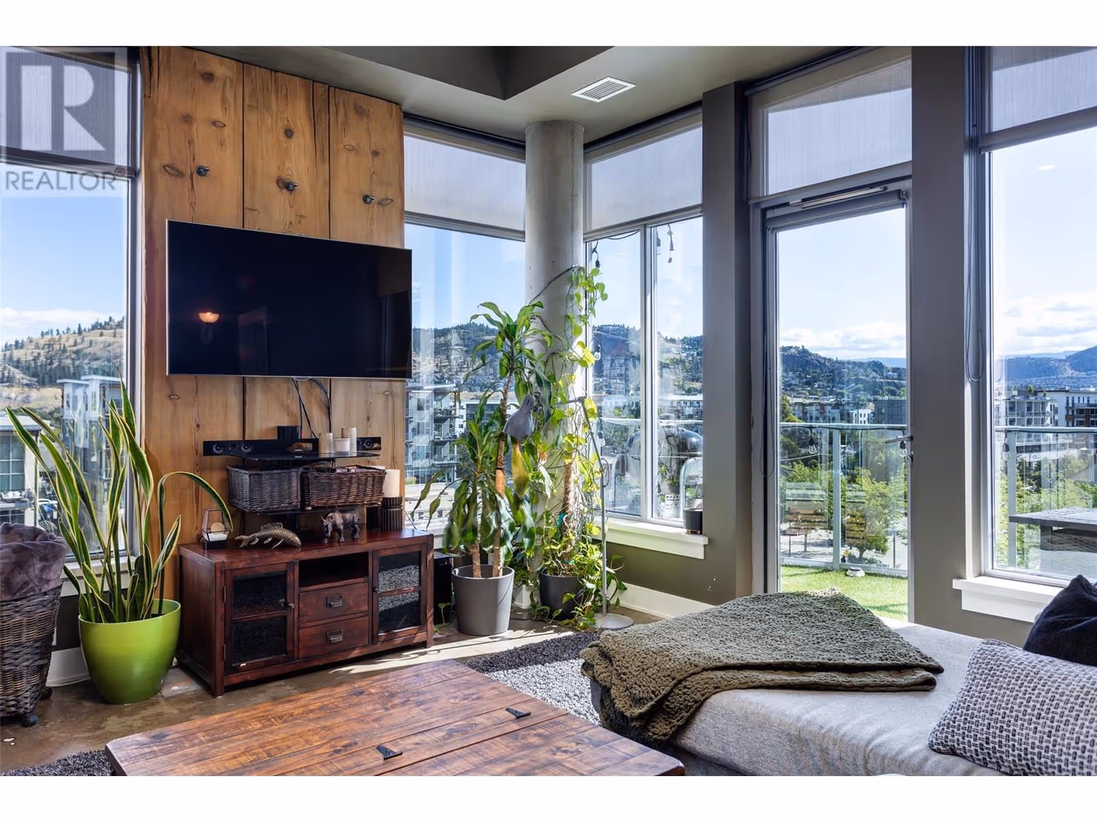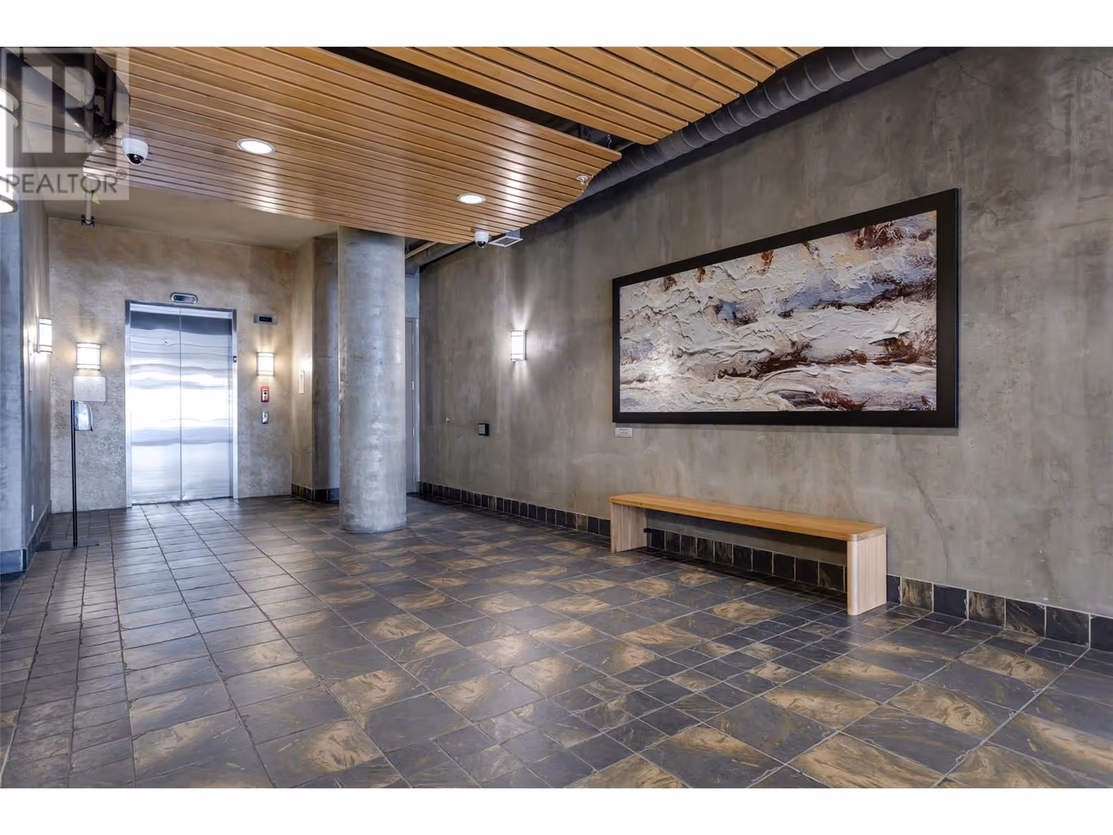 Welcome to elevated urban living in one of Kelowna’s most sought-after concrete high-rises. This bright and airy open-concept condo features soaring 11-foot ceilings and floor-to-ceiling windows that showcase panoramic city, mountain, and peek-a-boo views of the lake. Located on the quiet side of the building, the unique northeast exposure offers both morning sunrises and evening light. The interior blends modern style with industrial character, highlighted by exposed concrete and structural pillars that create a bold architectural statement. Thoughtful touches include a Murphy-Bed and workspace in the Den/Office area, a fitness room, secure bike storage, a storage locker, and one of the most desirable underground parking stalls in the building. Situated in the heart of Kelowna’s vibrant Cultural District, you’re steps to the waterfront, parks, dining, shopping, entertainment, and more. A rare opportunity to enjoy urban sophistication with nature and lifestyle at your doorstep. Don't miss out on your opportunity to own this amazing condo! (id:58842)