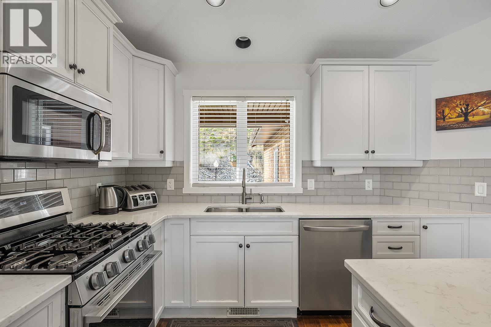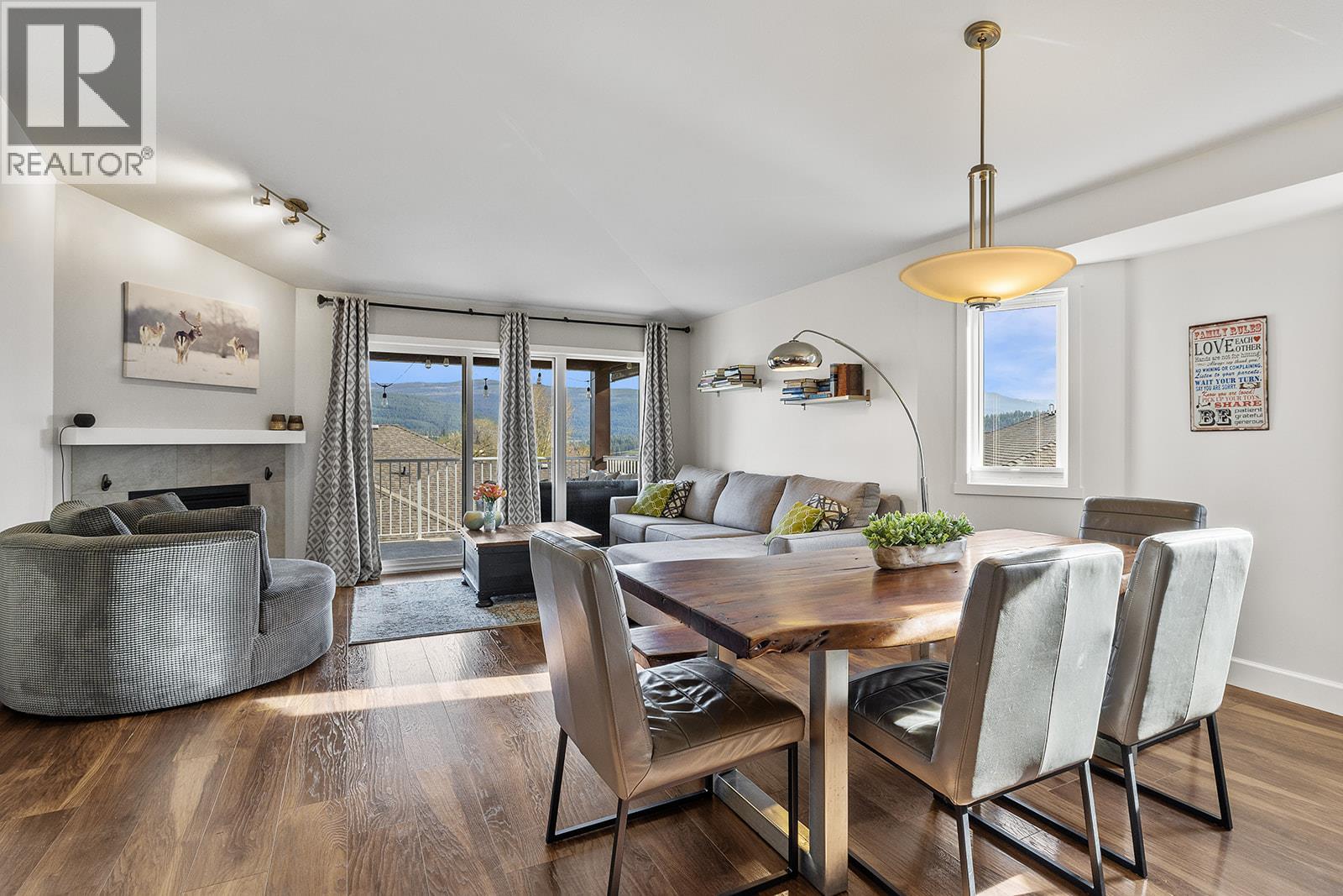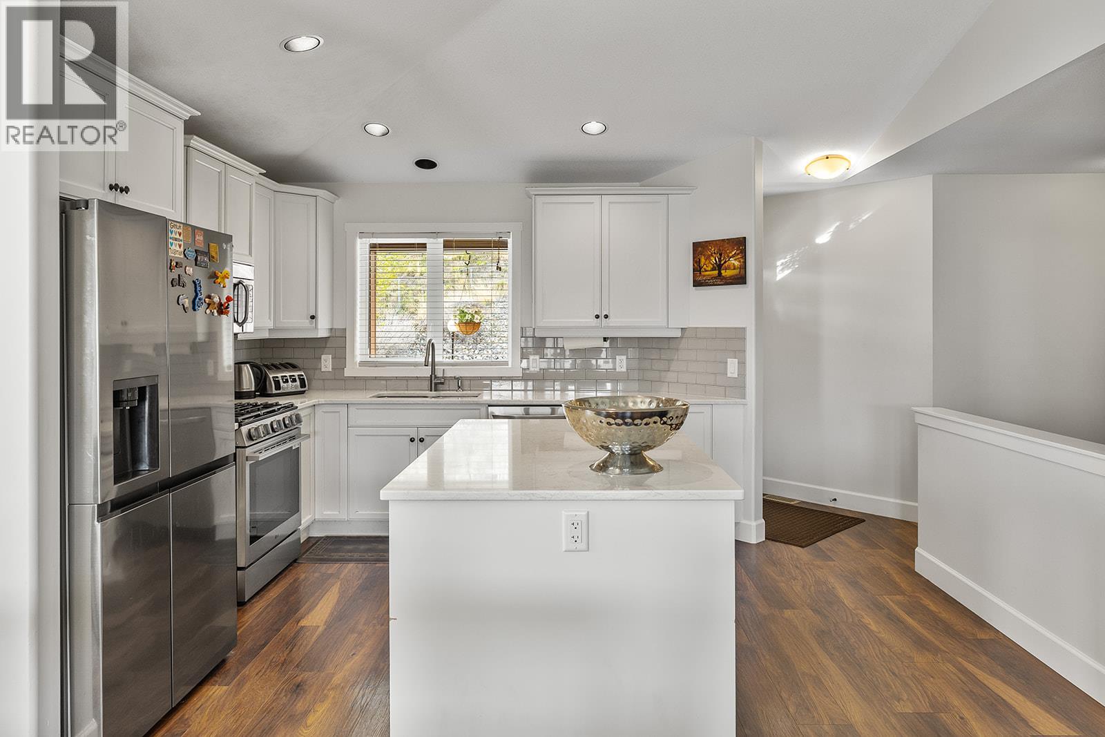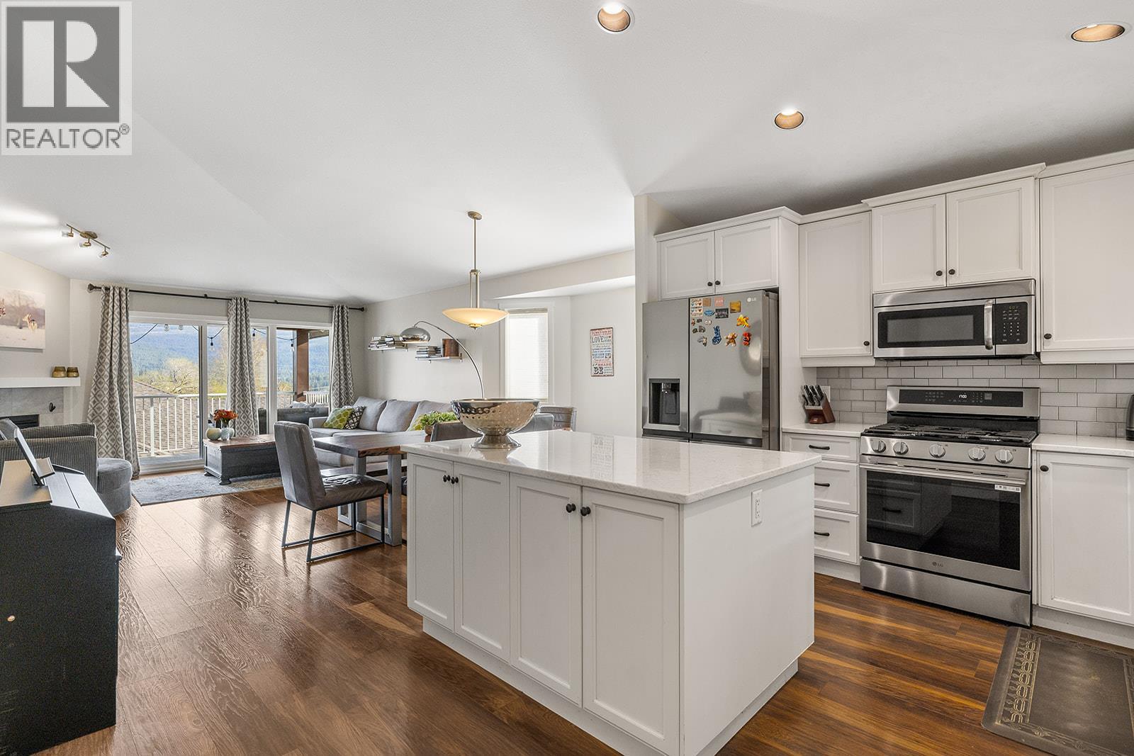 Mountain views and a cul-de-sac address in Black Mountain, this 4-bed, 3-bath walkout rancher in the Blackstone complex delivers low-maintenance living without compromise. The main floor flows through a bright living and dining area with vaulted ceilings and a gas fireplace, opening to a covered deck where the valley and mountain views take centre stage. The kitchen features quartz countertops, a gas range, and an island, built for the way you actually cook and entertain. The primary suite includes a full 4-piece ensuite, with a second bedroom, full bath, and main floor laundry rounding out the main level. Downstairs, the fully finished walkout basement, with its own separate side entrance, adds two more bedrooms, a large rec room, full bath, and generous storage, ideal for guests, teens, or a home office. Outside is a fully fenced landscaped yard with underground irrigation, stone and vinyl exterior, and a double attached garage with two additional uncovered stalls. Steps away from Black Mountain Golf Course, parks, hiking trails, schools, and transit. No thru street. Move-in ready. (id:58842)