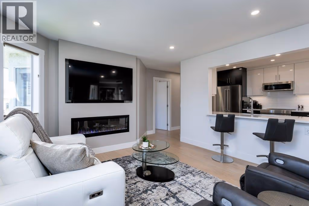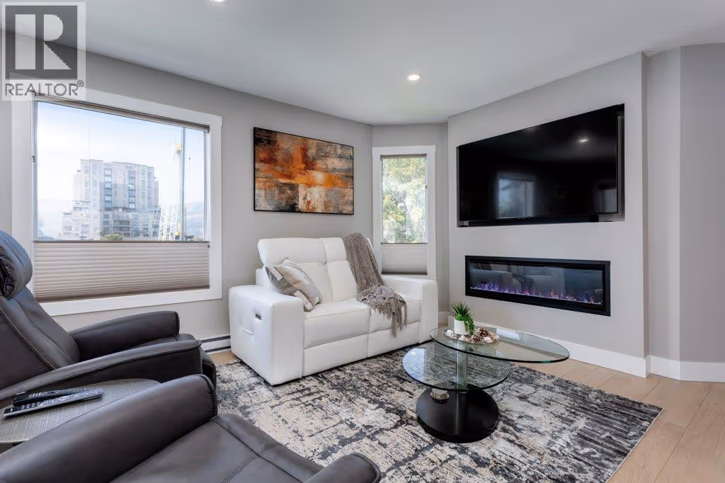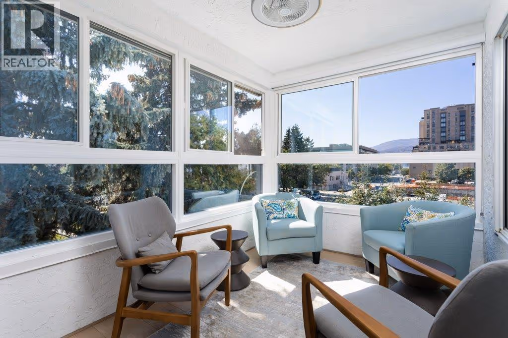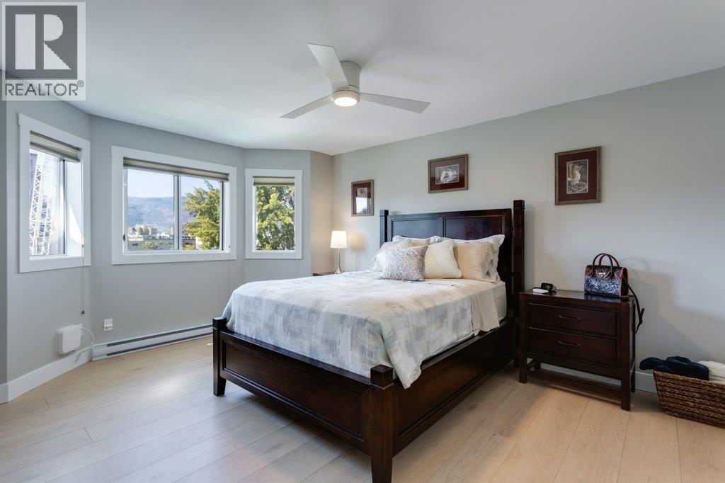 Top Floor, Corner, No expense spared in the total renovation of this larger than most 2 bedroom + 2 bath + Sunroom split plan condo in the heart of downtown Kelowna. The pictures tell the story. Nothing has been overlooked in the high-end renovation of this west-facing top-floor home. High-gloss, soft-close cabinets, all new stainless Kitchenaid appliances, including: induction range, wine fridge, quartz countertops, linear fireplace and wide-plank laminate flooring. Quiet corner unit with great light-filled rooms and added usable sq. footage with an enclosed sunroom. This condo is in an excellent location close to everything downtown has to offer and is move-in ready. Additional storage off the lobby (locker 309). Parking is conveniently located(#36) a second stall is available from strata ($30/month), plus on-site visitor parking and a car wash area. Social room is off the elevator on the 2nd floor, Gym off the elevator on the 3rd floor. BBQ area, and great sundeck off the back of the elevated first floor. Don't miss this opportunity to live in style downtown for a great price! This is a 55+ building and pets are not allowed. (id:58842)