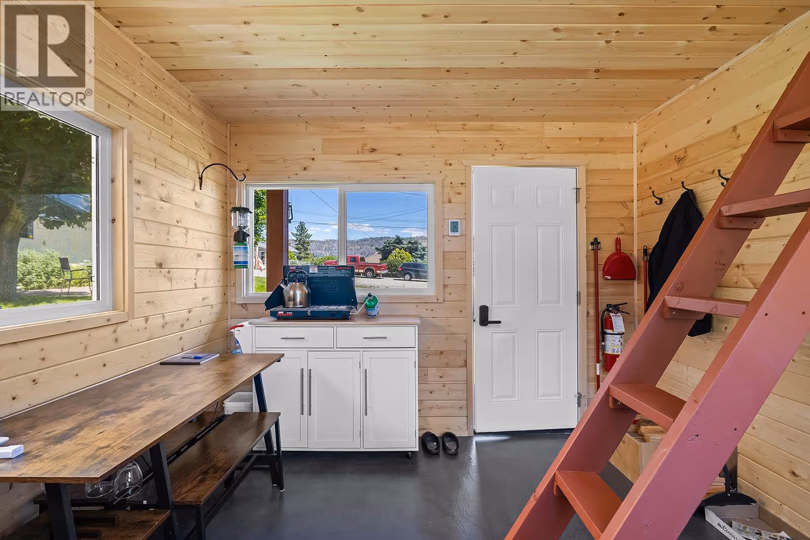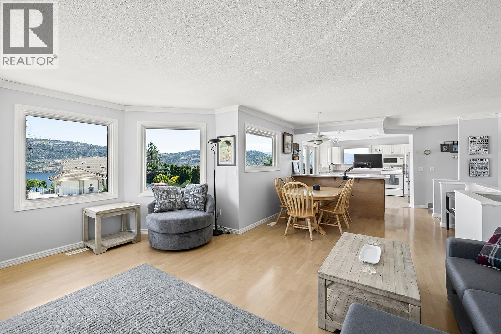 Massive lakeviews define this beautifully updated 4 bed, 3 bath, 2,260 sq. ft. home. The main level offers 3 bedrooms and 2 bathrooms, a bright living space with updated lighting, new kitchen flooring, a new fridge and dishwasher, plus a wraparound deck that showcases panoramic views stretching across Okanagan Lake. The primary bedroom includes a large closet and 4-pce ensuite. The lower level has been fully renovated with its own laundry, new floors, new kitchen, and fresh paint. Recent updates include full exterior paint, giving the home a fresh, modern look. Additional features: double garage, underground irrigation, fenced dog run, and a brand new cabin, with a sleeping loft and a WETT Certified wood burning stove. This move-in ready property combines income flexibility, updated living spaces, and some of the best lake views the Okanagan has to offer (id:58842)