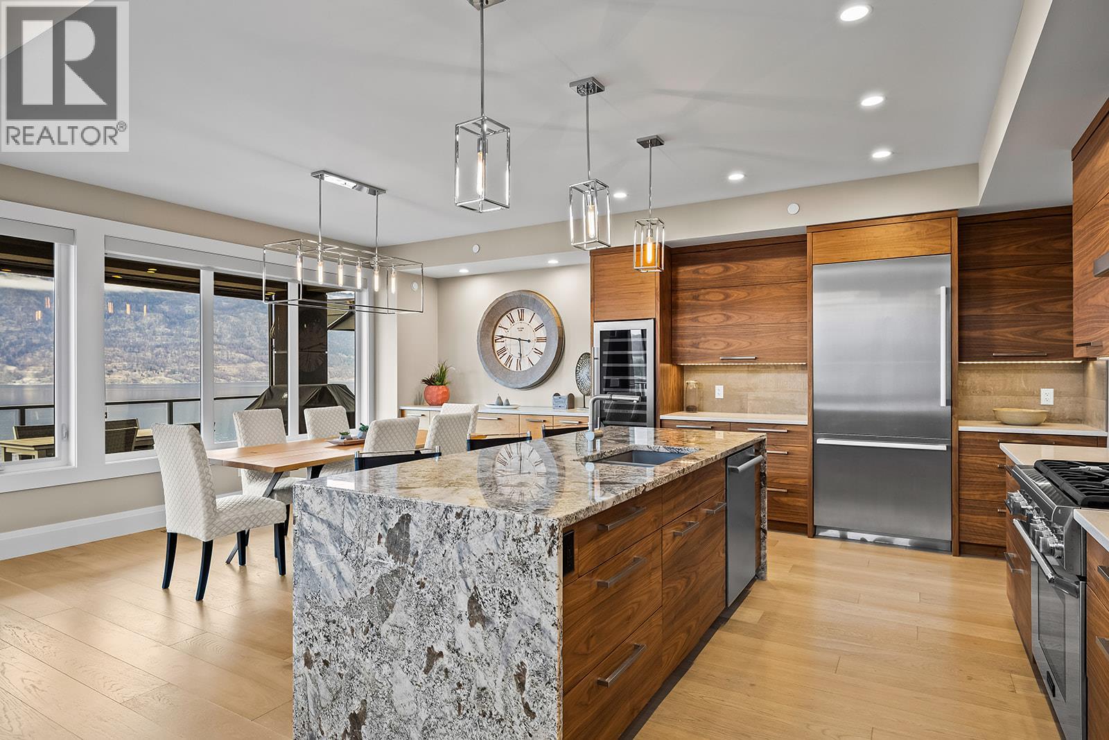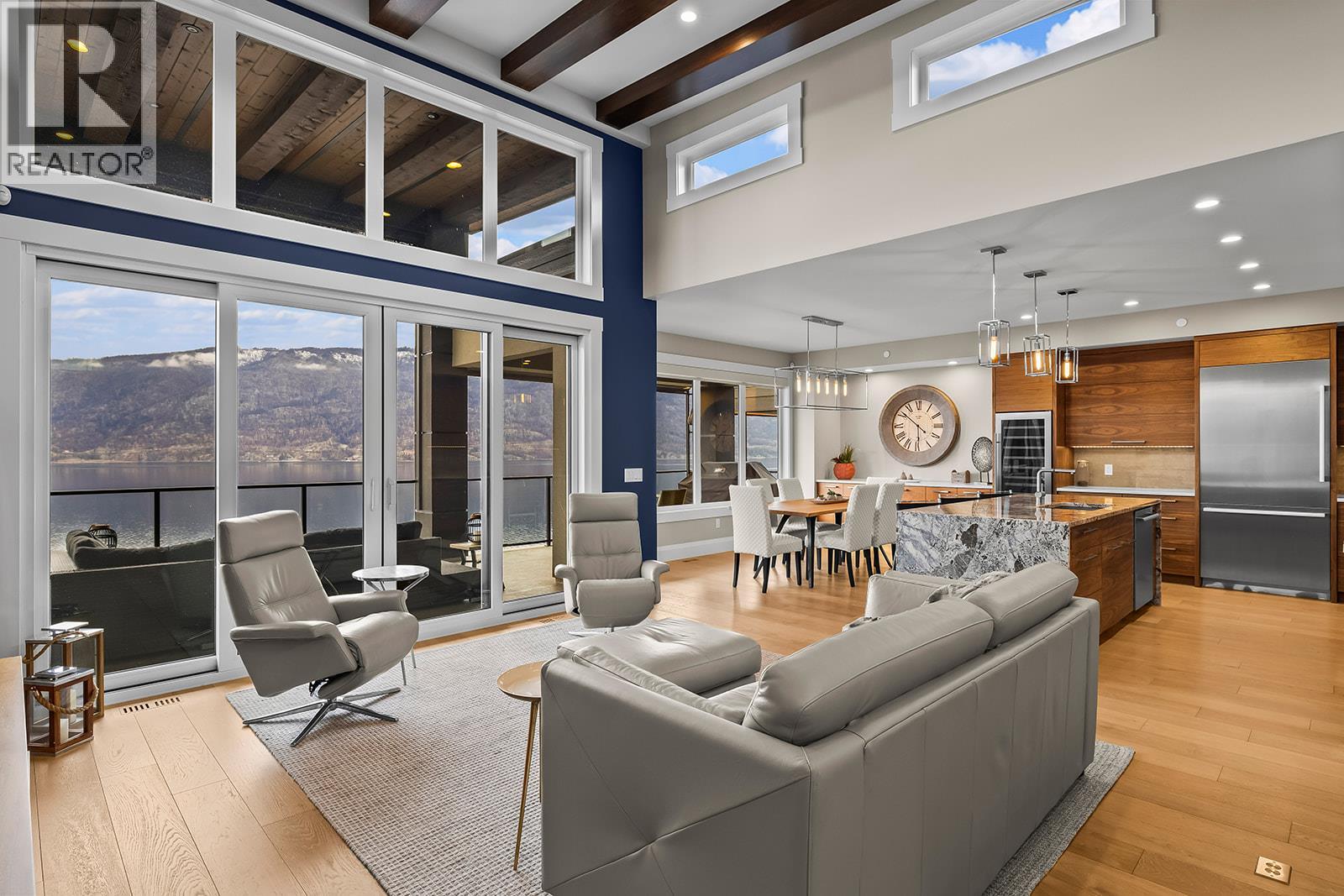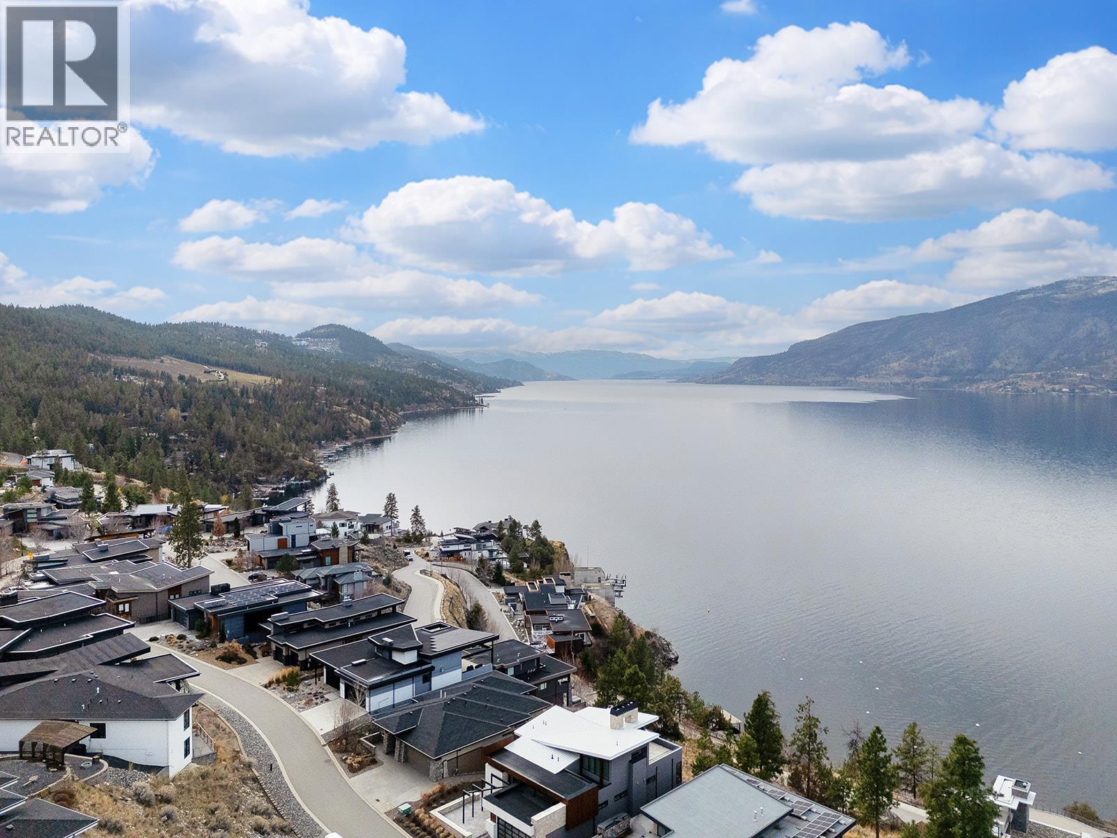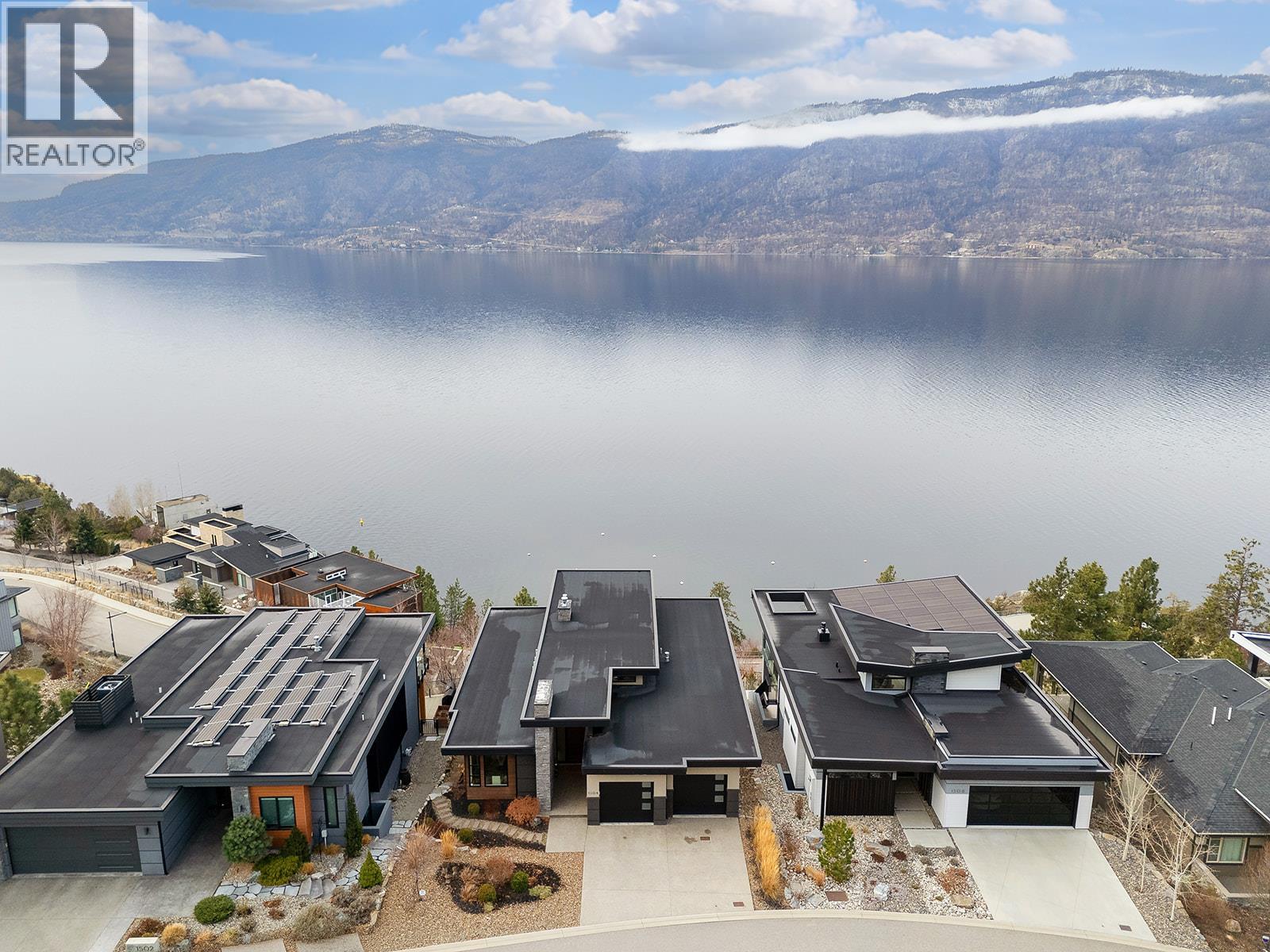 Don't miss out on this stunning home with breath taking views of the lake and mountains in this exclusive Lakestone waterside in lake country. This home has barley been lived in and is in pristine condition. The moment you enter the front door, you're embraced into a space where luxury meets comfort. The panoramic lake view stretches from the bridge in the south to Fintry in the north. Enjoy the main floor great room , with cedar beams, cozy fireplace, professionally designed kitchen with Thermador appliances, stone countertops, dedicated wine fridge and custom horizontal grain walnut cabinetry. The architectural details continue with striking beams leading out to the large deck designed for entertaining, and enjoying the vibrant sunsets. The primary suite on the main floor has a lavish ensuite with oversized walk-in shower, soaker tub, and wiring for hot tub on the aggregate covered deck . The lower level offers a spacious rec. room with a wet bar, 2 additional bed rooms and 2 full bathrooms. The state of the art amenities center in Lakestone include 2 pools, 2 fitness facilities, basket and pickle ball courts, shared dock, endless walking and hiking trails, and a quick walk to the lake access. (id:58842)