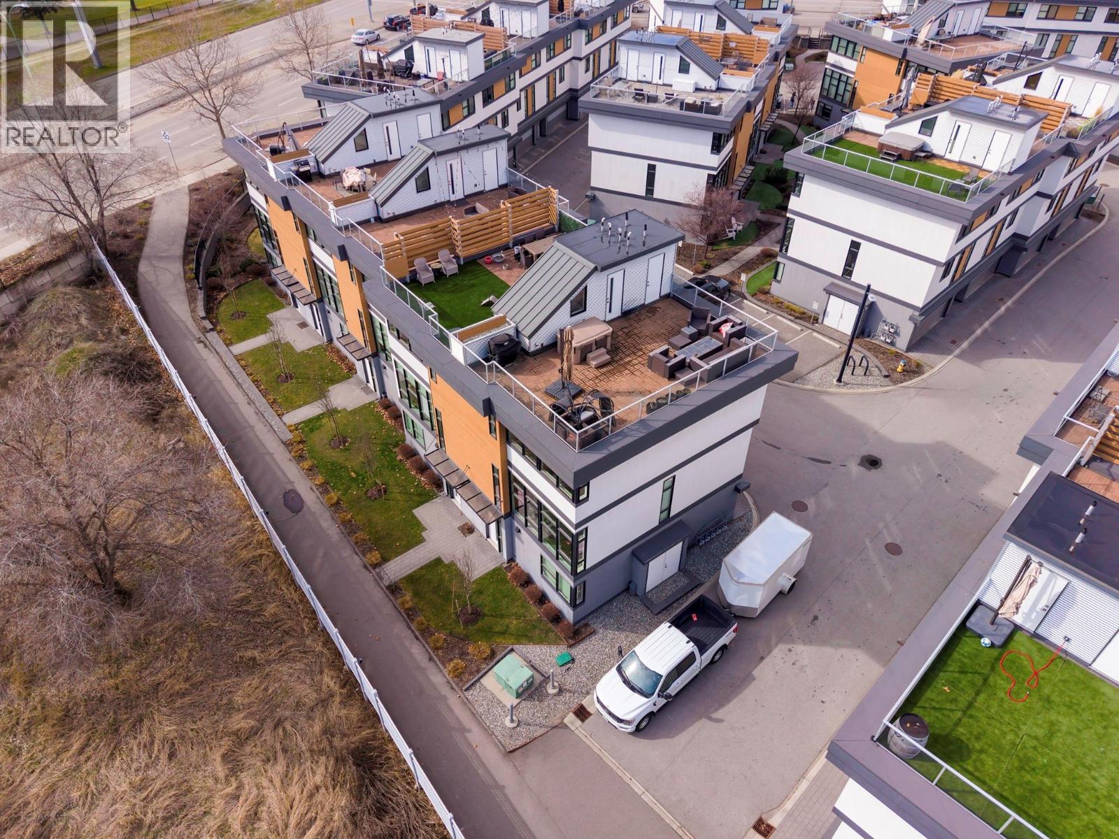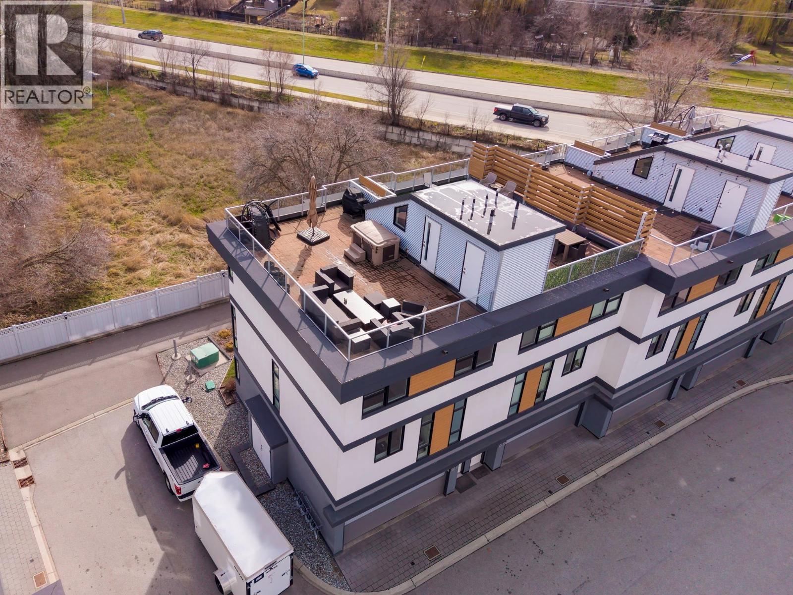 Best location in the development. This 3-bedroom end-unit townhome sits in the quietest, most private position, elevated and set apart with greenspace out front and no direct views in from other units. Southeast exposure brings in excellent natural light, with views from both the living room and primary bedroom. The open main floor features floor-to-ceiling windows, power blinds in the living room, and clean, modern finishes throughout. The kitchen is well laid out with a full stainless appliance package including gas range and steam dryer, plus upgraded window coverings already in place. End-unit design adds four extra windows, creating a brighter, more open feel than interior units. Upstairs, the 588 sq.ft. rooftop patio offers a true outdoor living space with city and mountain views, plus a more functional layout unique to end units. Upgrades include anextended garage built to fit full-size trucks, hands-free skirted toilets, and a newer high-end Eco Spa hot tub. Visitor parking is directly across, with additional room in front of the garage for easier access and maneuvering. Built with geothermal heating and cooling, LED lighting, and quality insulation for efficient year-round comfort. Central location with quick access to downtown Kelowna, Knox Mountain, breweries, restaurants, shops, and the waterfront. One dog or one cat allowed. Award-winning development with 3 Gold Tommie Awards and 2 Silver. (id:58842)