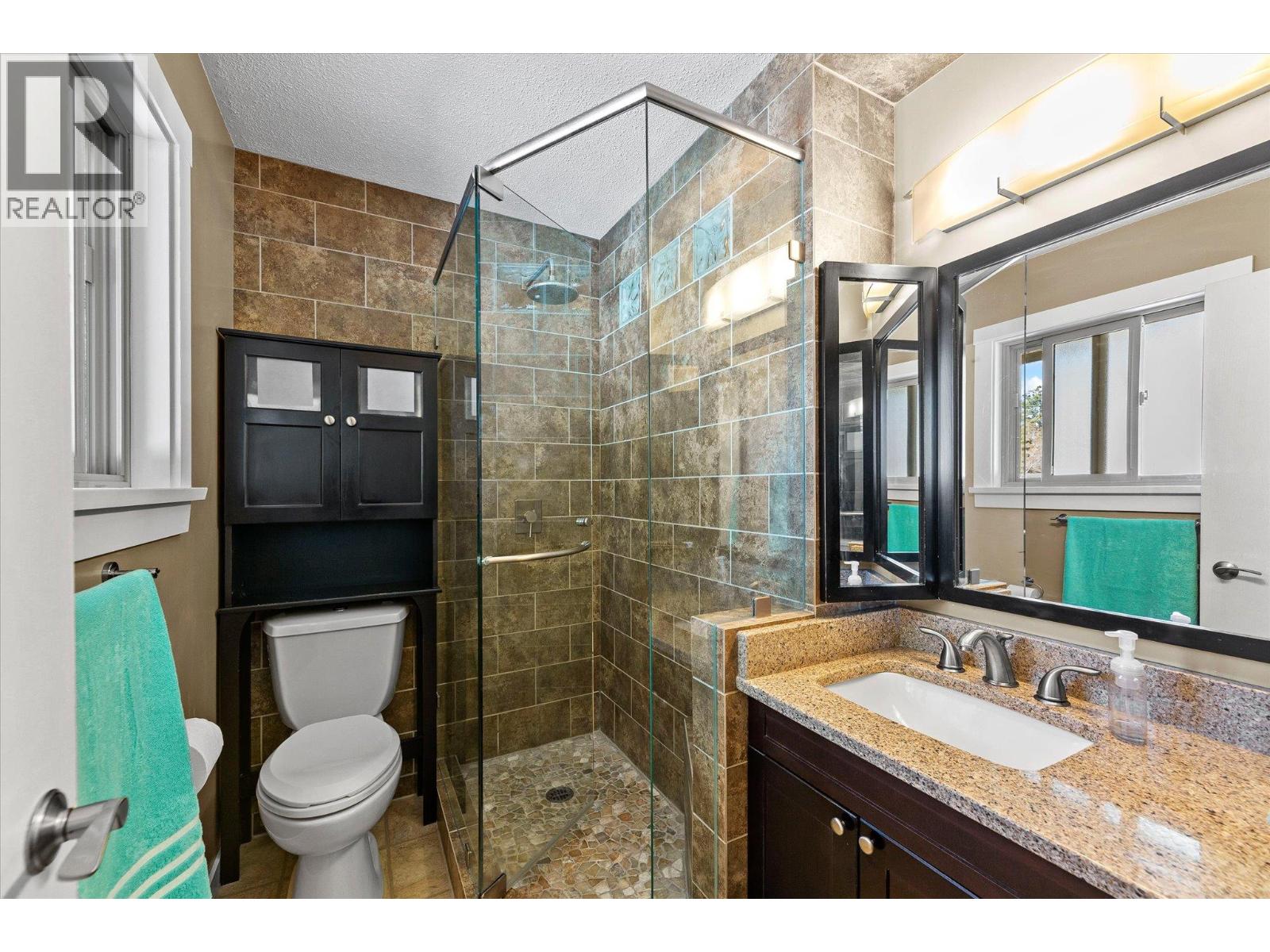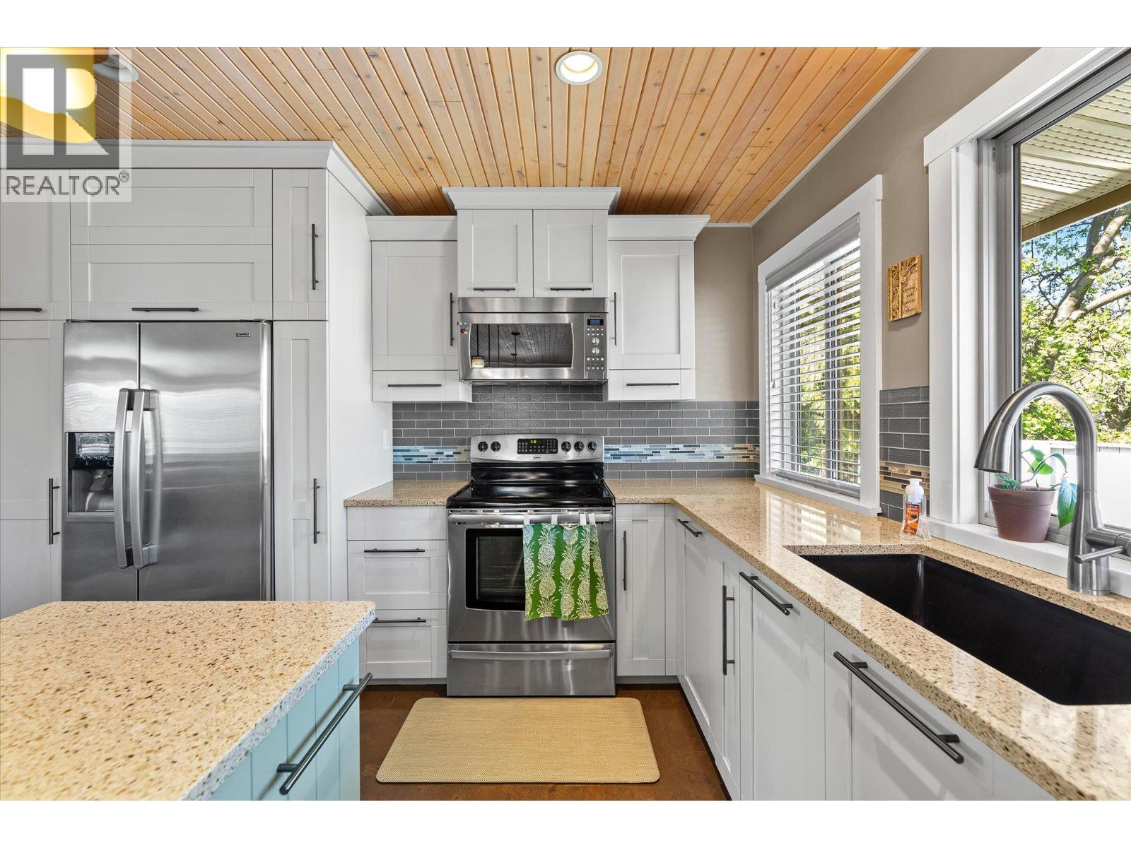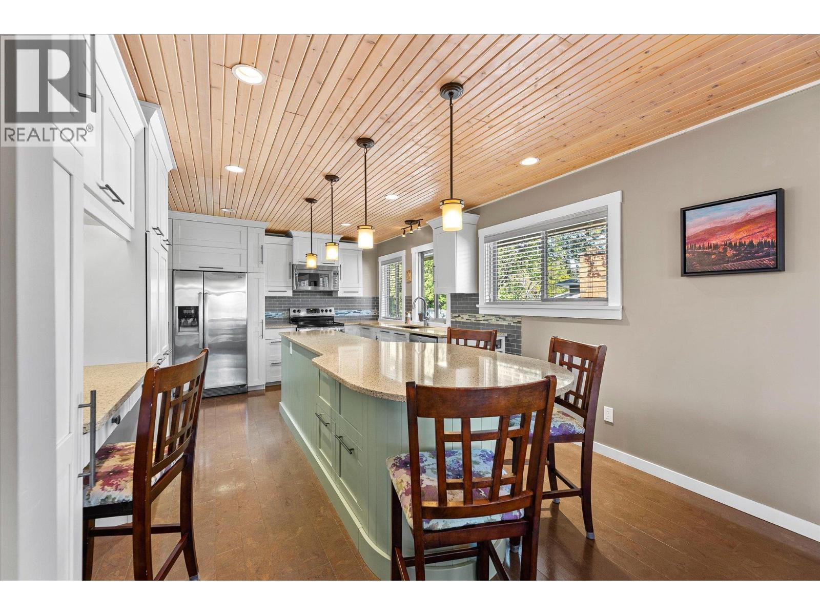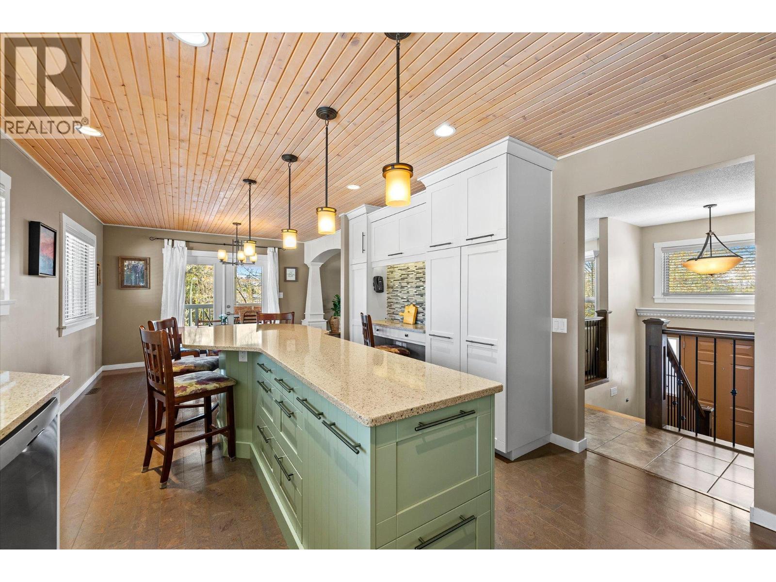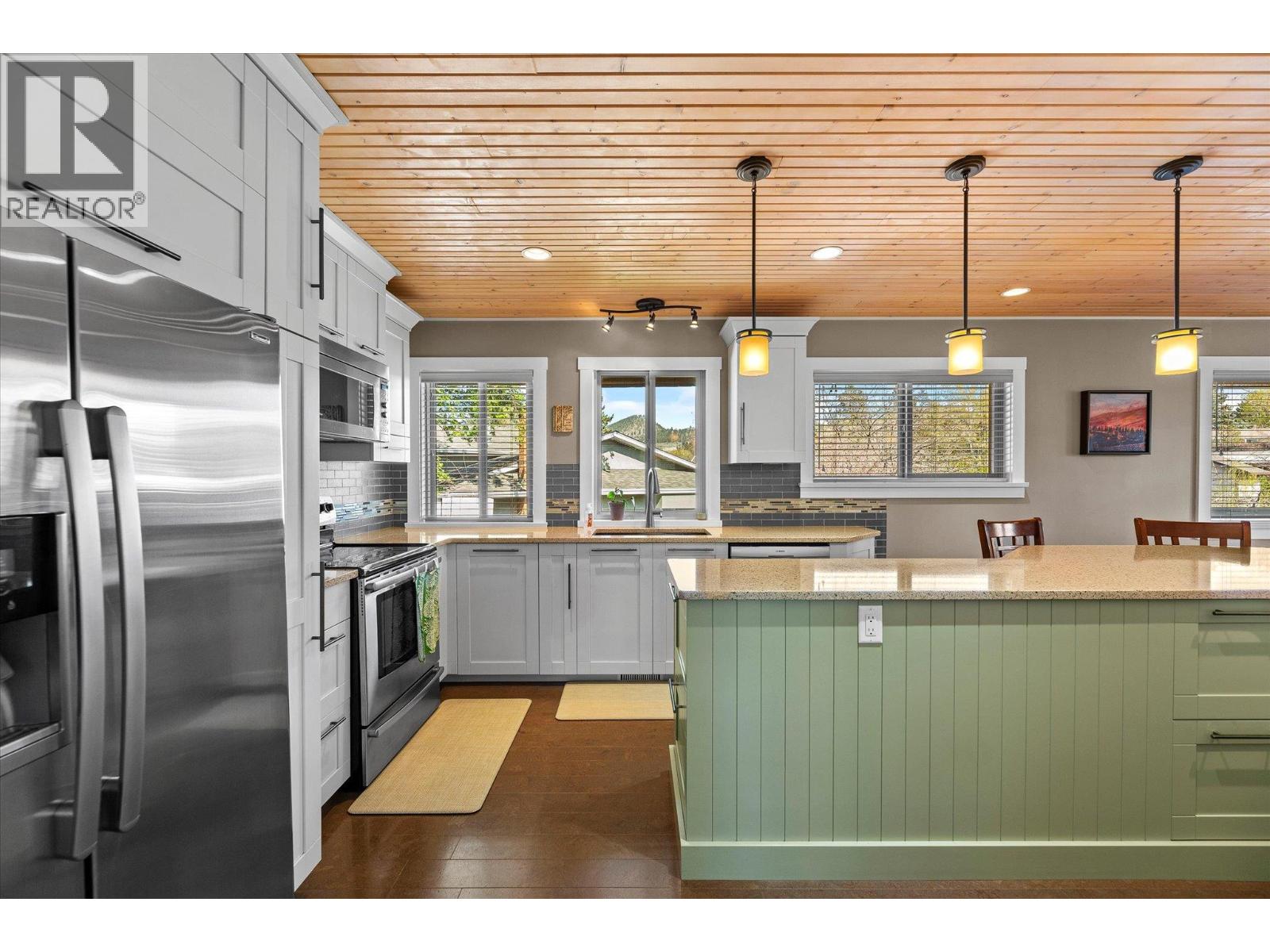 lenmore Family home loaded with value. Located with great access to schools, parks, Rail Trail, downtown access to the water front boardwalk and more. This 5 bedroom, 3 bath home includes a private 2 bedroom in-law suite/ summer kitchen complete with full kitchen, 3 piece bath and shared laundry. The main level has 3 spacious bedrooms, a 4 piece main bath and 3 piece en-suite with tile and glass shower. Entertain friends and family around the quartz counter top island in the remodeled kitchen with access to the Dining area, Living room with Gas Fireplace and double French doors to the covered patio. The lower level has a generous sized family room with wood burning fireplace, entry to the 2 bed suite, laundry room, and storage space. The low maintenance yard is completed with underground irrigation to flower and garden beds and your own private putting green to practice your ""short game"". There is also a great outdoor patio area which makes a perfect oasis space to read a book or entertain with friends. Lots of parking on the half moon driveway with a covered carport. This home has been maintained and cared for over the years. Glenmore listing at its best. (id:58842)