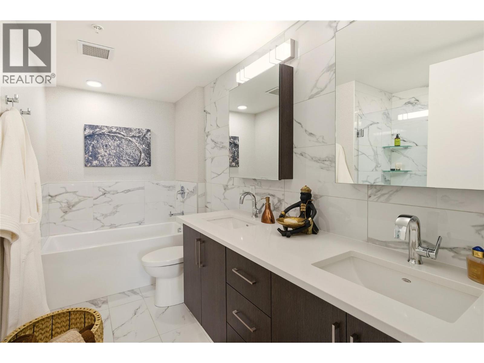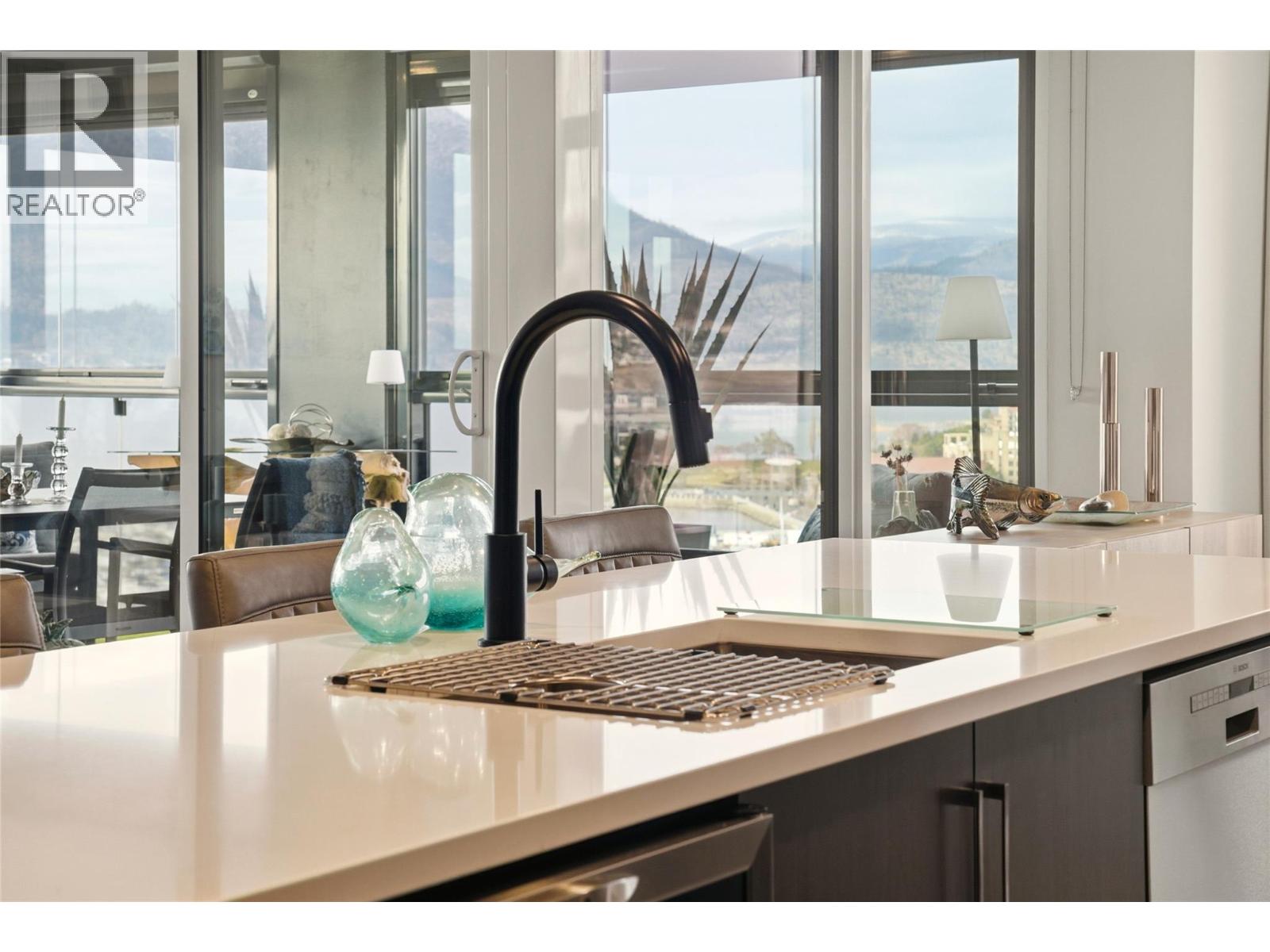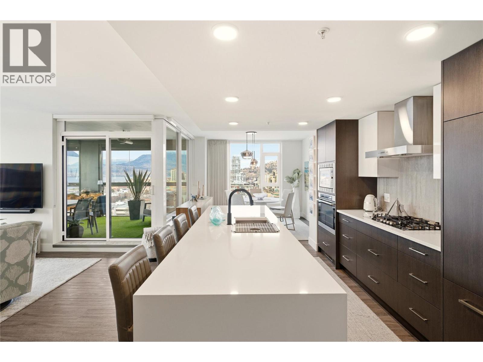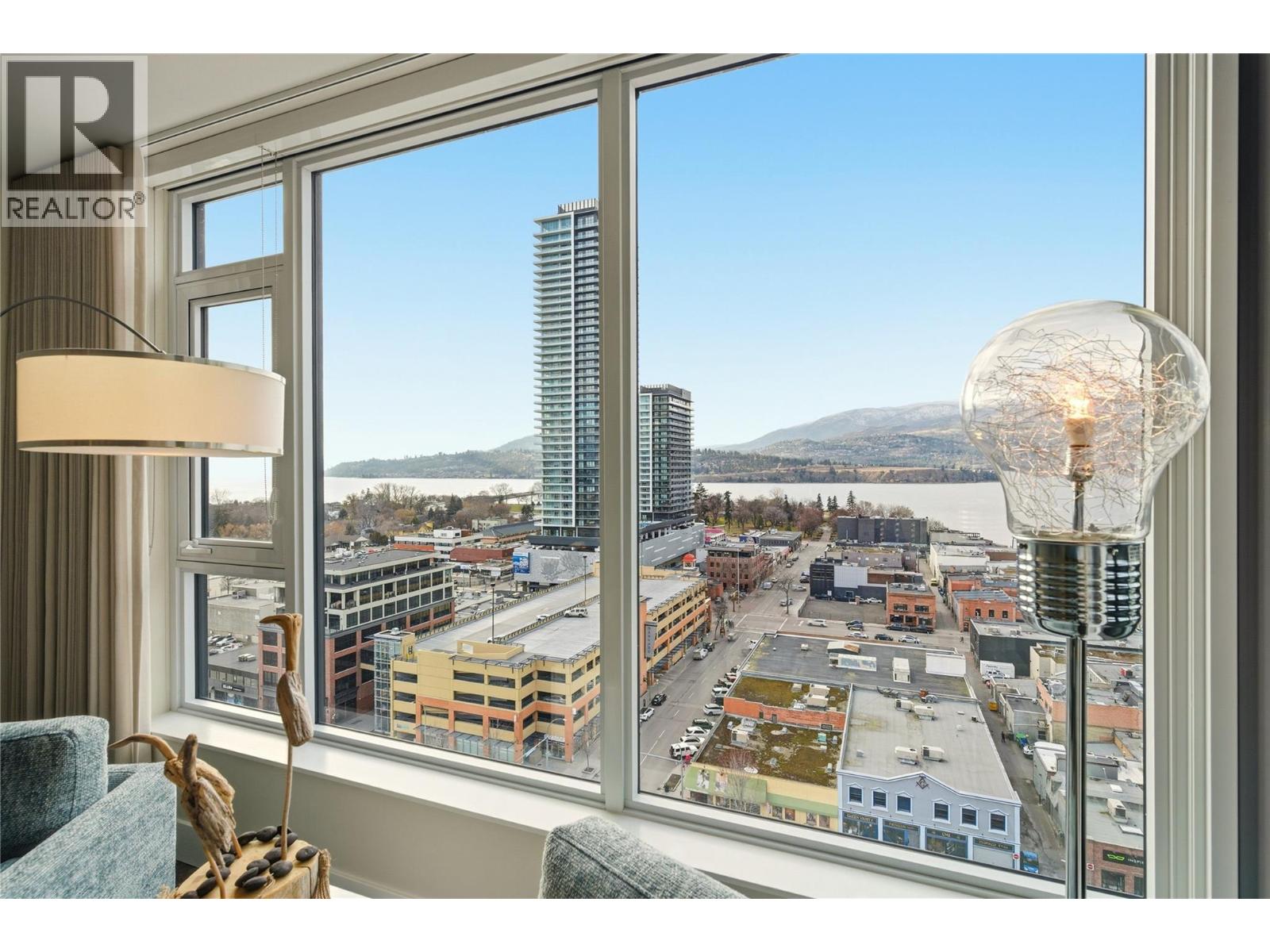 Perched on the 16th floor, this exceptional corner unit situated in the prestigious Ella building showcases luxury high-rise living at its finest. With sweeping lake, mountain, city, and Yacht Club views framed by floor-to-ceiling windows, every room captures the beauty and energy of downtown Kelowna from above. This exclusive 2 bedroom + den, 3 bathroom layout offers ultimate privacy and comfort, with both bedrooms featuring their own ensuites. The unit is in impeccable condition and has been extensively elevated with over $100,000 in premium upgrades, far beyond original developer standards. There is true indoor-outdoor living with the 11’ x 19’ terrace that is enhanced by a custom Lumon glass enclosure. Fully open for summer evenings or have closed for the winter while using the heaters for year-round enjoyment and a seamless extension of your living space. The chef-inspired kitchen features quartz counters, high-end appliances, and sleek European-style cabinetry. Additional highlights include two storage lockers (one being 7’ x 10’), a stunning wine room, thoughtfully designed built-in closets, striking feature walls by Plutos, high-end drapery, and three artistic motorized patio sun shades. There is a guest suite, pet wash, bike facilities, EV charging, and an on-site community director. This must be experienced in person to appreciate the craftsmanship and detail throughout in Kelowna's most sought after building. Contact for the full upgrade list. (id:58842)