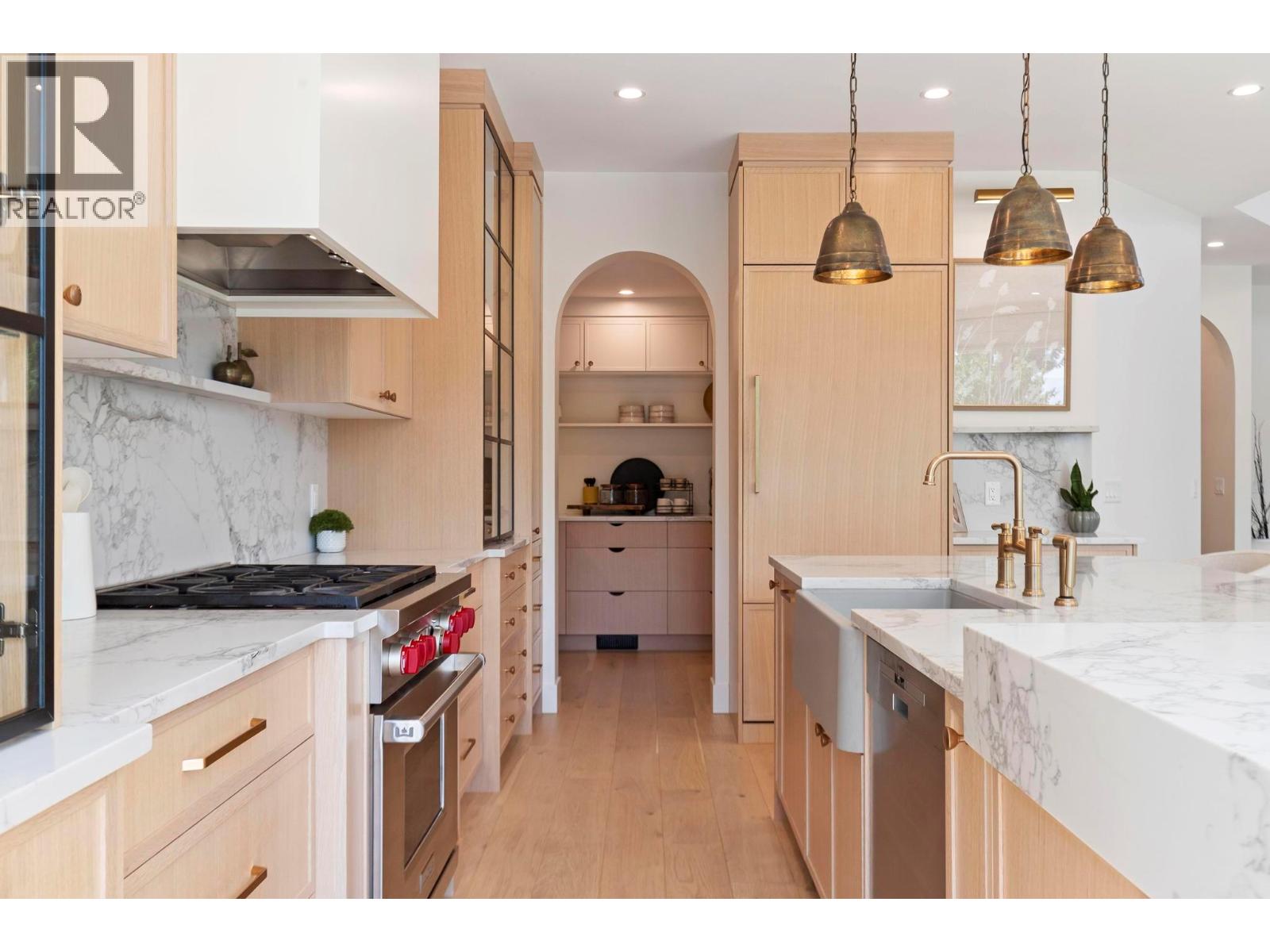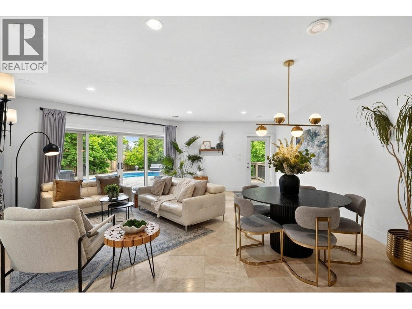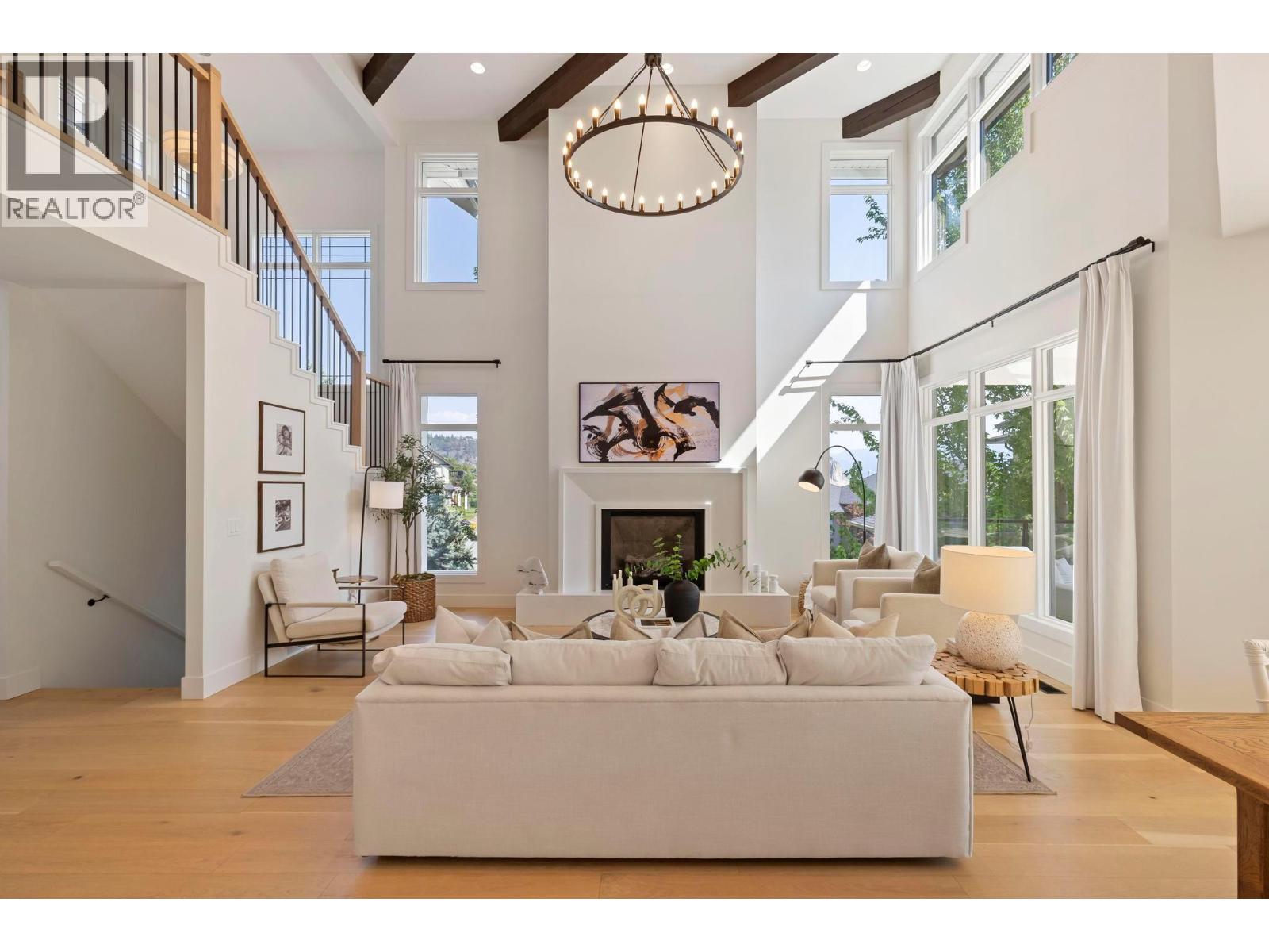 Tucked away on a quiet cul-de-sac in Kelowna’s prestigious Glenmore neighbourhood, this Modern Mediterranean masterpiece was reimagined in 2023 by an award-winning design team. Offering over 5,000 sq ft, it blends refined elegance with multigenerational functionality. The grand living room features soaring 18-foot vaulted ceilings, wide-plank white oak flooring, wood beams, graceful archways, and timeless European-inspired finishes. The bespoke chef’s kitchen is a showpiece with a JennAir integrated refrigerator seamlessly built into custom white oak cabinetry, six-burner Wolf gas range, quartz countertops and backsplash, plus a spacious walk-in pantry. A main floor office with custom built-ins overlooks the private backyard. Upstairs, 4 generous beds include a luxurious primary retreat with private balcony, spa-inspired ensuite with soaker tub, walk-in shower, and walk-in closet. The resort-style backyard features a new privacy fence, saltwater pool, hot tub, stamped concrete patio, gas fire pit, lush landscaping, and a basketball court that converts to a winter skating rink. A heated triple garage and RV parking, complete the package. The thoughtfully updated walkout basement features restored Italian tile, media room, gym, and a flexible 1 or 2 bed suite ideal for guests, family, or income potential. Integrated Sonos sound throughout. Breathtaking mountain and sunset views. Minutes to downtown, top schools, parks, and shopping, this is luxury Glenmore living at its finest. (id:58842)