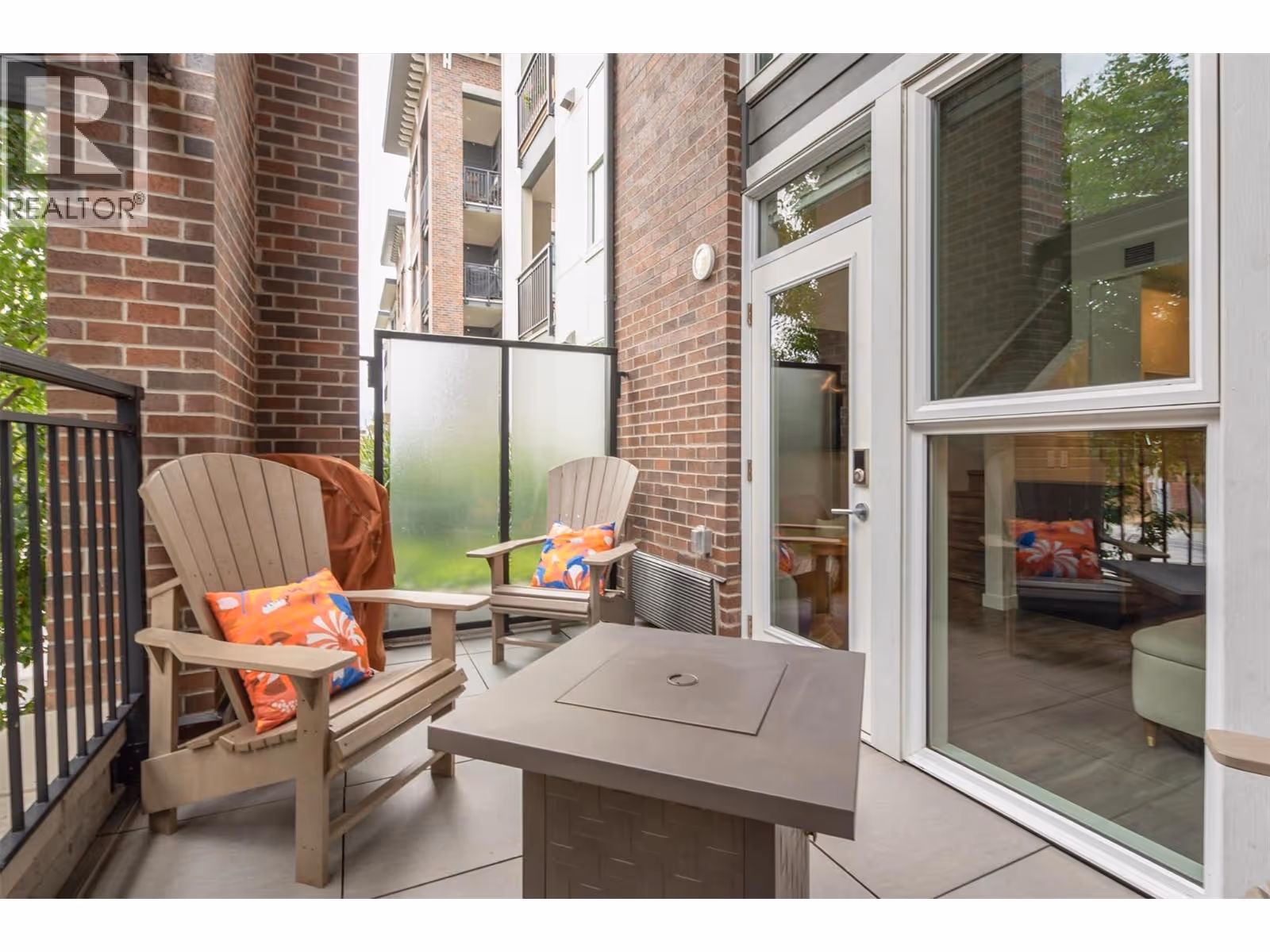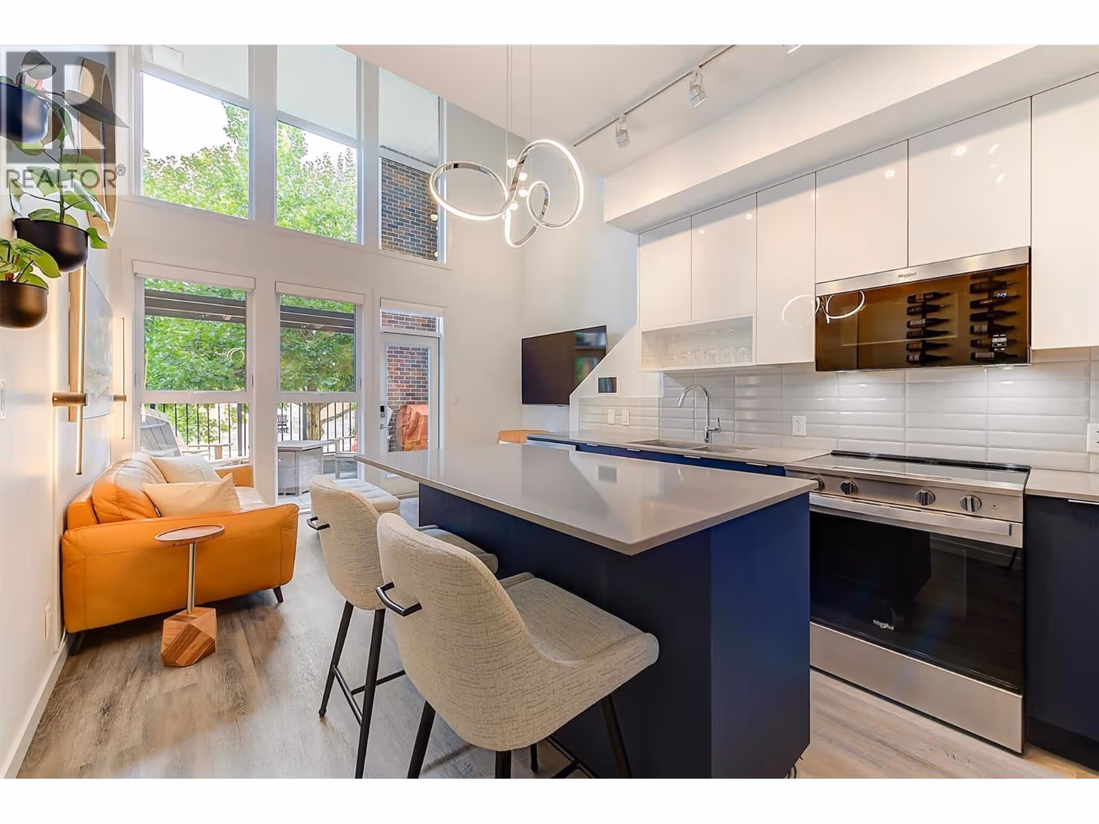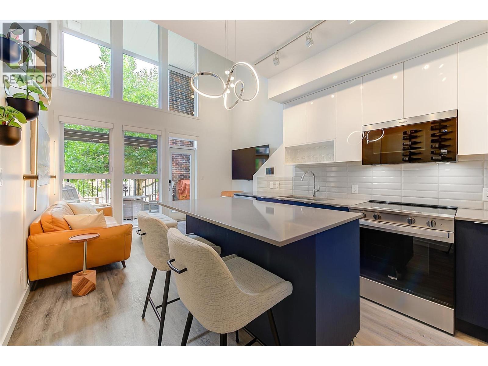 Bright, Urban Chic Loft-style condo at Central Green! This 2-bedroom, 2-bathroom home offers entry on both levels with towering 18 ft ceilings and impressive oversized floor to ceiling windows allowing the natural light to flood your living space. The open layout showcases a sleek kitchen with contemporary dual tone cabinetry, stainless steel appliance package, light quartz countertops, a moveable island with eating bar capability, all flowing into a cool, luxe living area with elegant modern lighting, perfect for entertaining day or night. Step out to the east-facing terrace with a beautiful brick facade and black accented frosted glass privacy panels to enjoy your morning coffee as the sun rises or enjoy a fresh Okanagan evening. The Lofted primary bedroom overlooks the main living area below and offers ample closet space, a 3pc ensuite bath & laundry while the main floor second bedroom is ideal for guests, crafts, a home office, or a studio. Practical perks include a secure underground parking stall, plus a convenient, same floor, storage locker. Central Green is situated beside the prestine Family & Pet friendly Rowcliffe Park. You’ll enjoy a running loop, off-leash dog park with small dog area, playground, and beautiful green space right outside your door. THIS all within walking distance to beaches, schools, shopping, dining, and Kelowna’s vibrant downtown easily accessible by transit out front OR steps away via the Bertram Pathway & the new Bertram Multiuse Overpass! (id:58842)