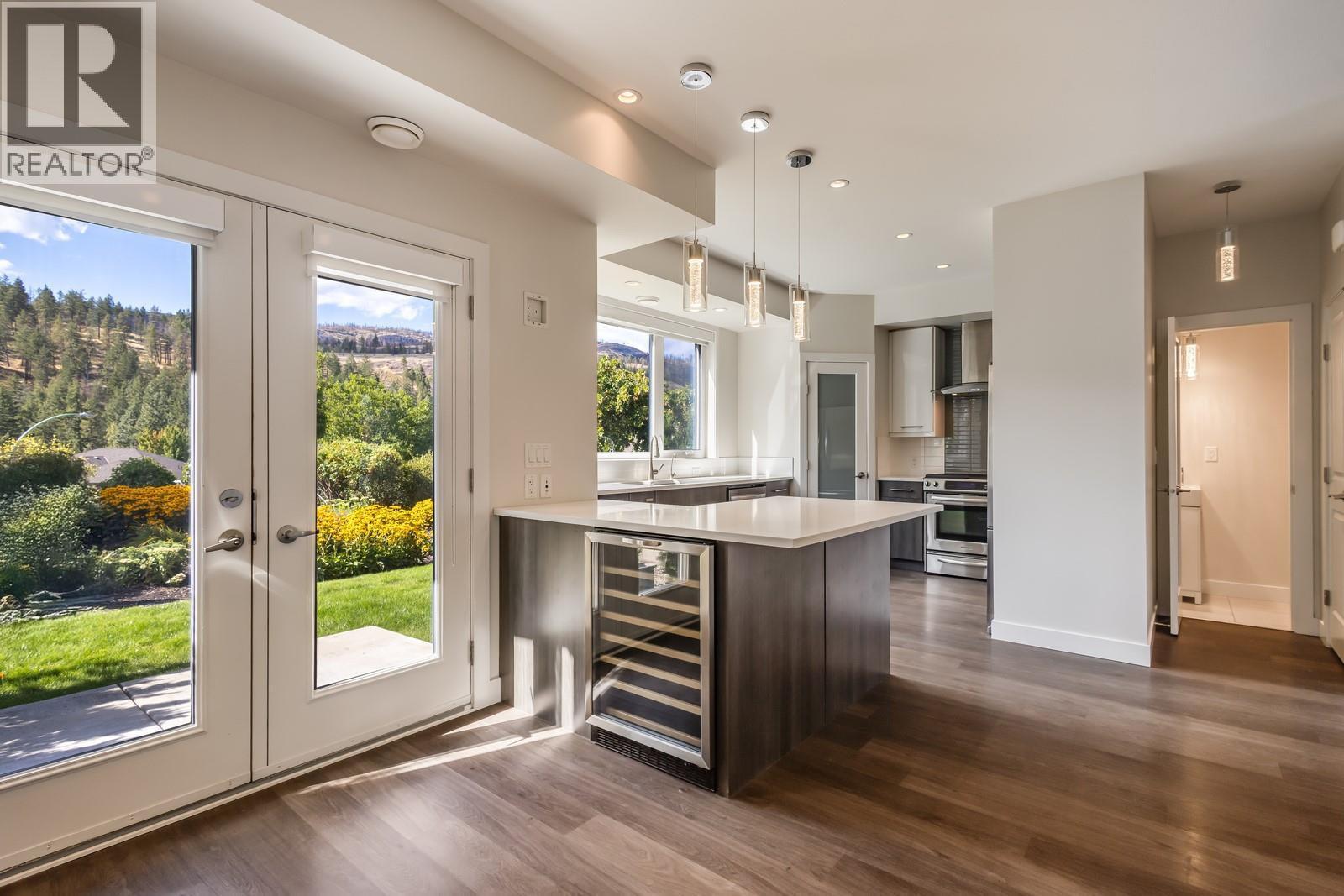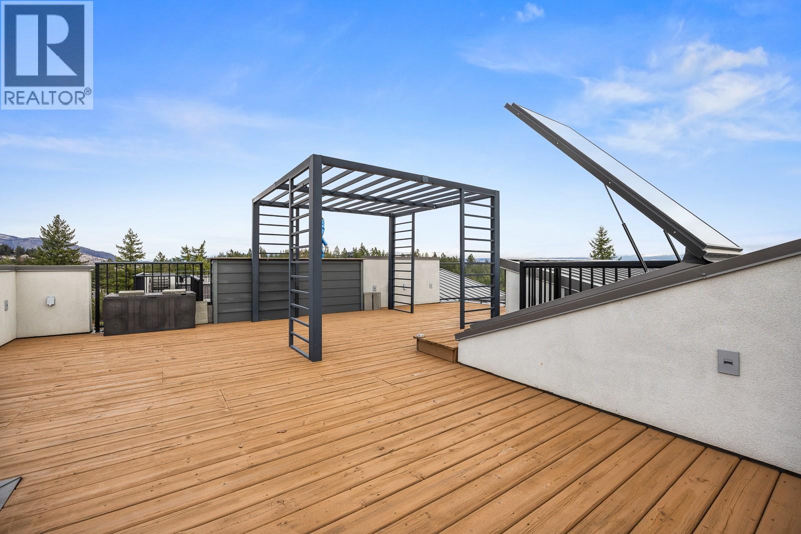 Modern design. Endless views. A rooftop vibe that’s next-level. Welcome to one of the most coveted end units at Peak Point—a sleek 3-bed, 4-bath townhome with a smart 3-level layout, versatile bonus room & five incredible patio spaces that deliver seamless indoor-outdoor living at every turn. Each level offers both style and function—from the bright, open-concept main floor with high ceilings, gas fireplace & dual dining areas, to the spacious entry-level bonus room with its own full bath—perfect as a home office, guest suite, gym, or media room. The kitchen is bold & modern, featuring a gas range, built-in wall oven, beverage fridge, pantry & full stainless steel appliance package—made for hosting or stylish everyday living. But the true showstopper? The rooftop patio—a total vibe with panoramic lake & mountain views, gas & water hookups & pergola. Summer nights? Sorted! Upstairs brings the wow-factor with a standout primary suite—complete with walk-in closet (built-ins included) & a sleek, spa-inspired ensuite. Two more bright bedrooms—one with its own patio— and a full bath complete the top floor. Bonus points: high-efficiency Navien tankless water heater, rare double garage with two bay doors & double driveway. All of this, just steps from Rose Valley Regional Park, scenic trails & Rose Valley Elem.—plus a short drive to WK Multi-Sport Dome, shopping & downtown Kelowna. Hot tubs allowed. 2 pets welcome (no size restrictions). This is the lifestyle you’ve been waiting for! (id:58842)