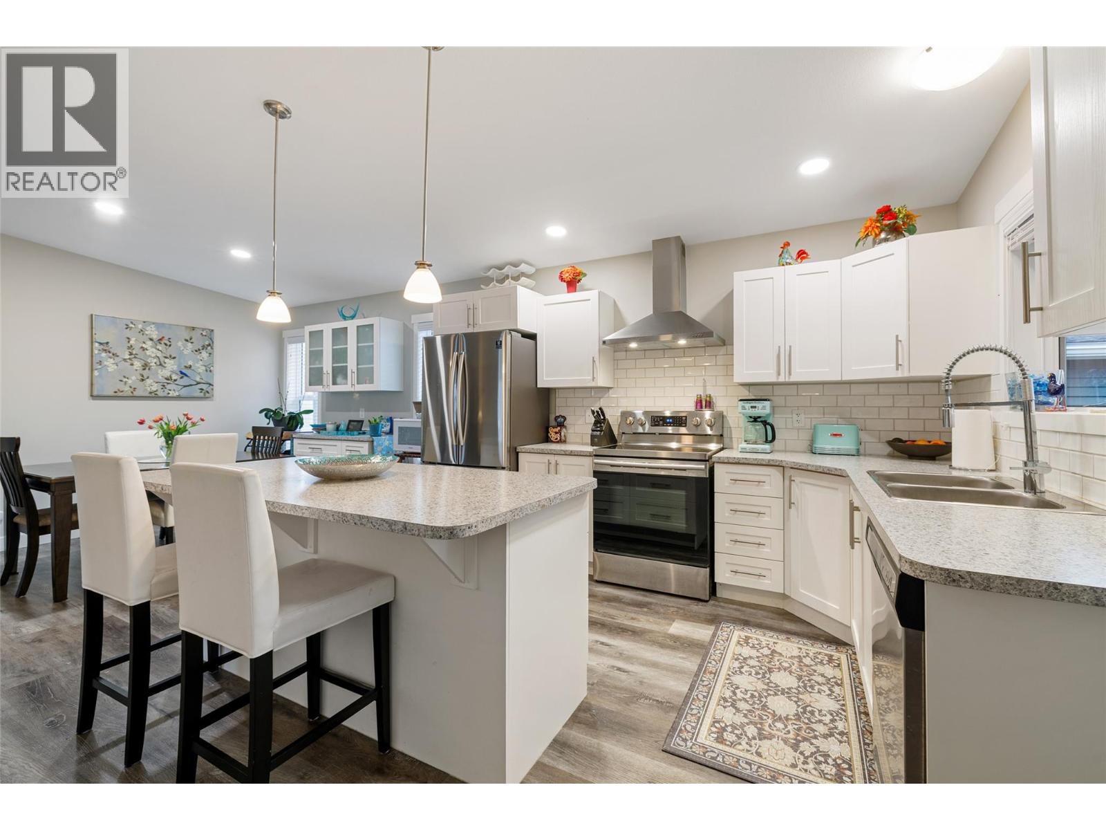 Rare, large landscaped corner unit with only one adjoining neighbour (in the back) and a fully fenced yard. 4 parking spots and a garage. Fully fenced back yard that includes fruit tress, and flower beds throughout, and pets allowed(with some restrictions). Enjoy indoor-outdoor living with a large covered deck perfect for relaxing or entertaining overlooking a small, easy-care lawn that’s great for kids or pets to play. Inside, the home is filled with natural light thanks to oversized windows and a bright, open floor plan. You’ll find two generous bedrooms plus a flexible den, ideal for a home office, guest room, or hobby space. The spacious primary suite includes a walk-in closet and a beautifully appointed ensuite featuring dual sinks and a deep tub/shower combo designed for comfort and style. This home is perfectly located just minutes from the beach, Downtown Kelowna, scenic hiking trails, local wineries, craft breweries, restaurants, and more. A rare find in a sought-after location (id:58842)