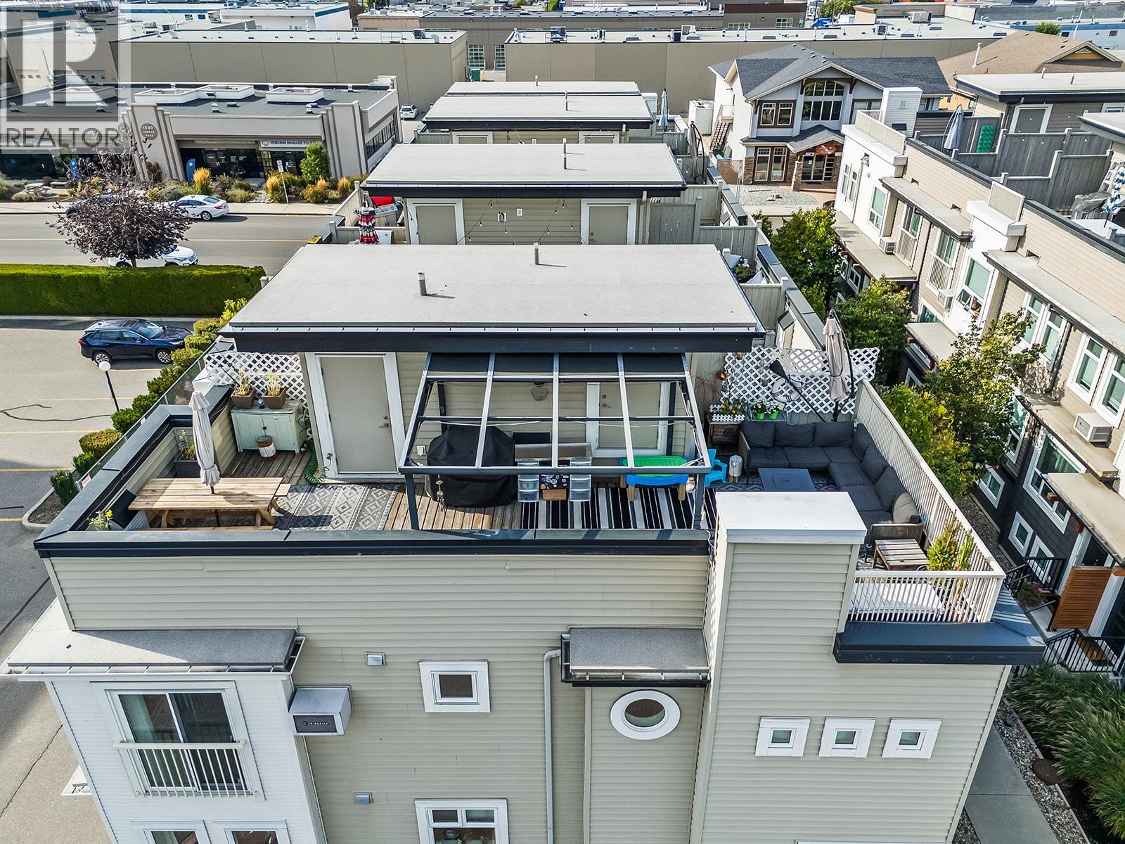 Welcome to The Dwell, a sought-after brownstone-inspired townhome development offering modern living in a prime location! This private end-unit boasts 2 bedrooms, 2 bathrooms, a large and private 434 square foot rooftop patio and a spacious 364 sq. ft. tandem garage with extra storage. Enjoy Kelowna’s best amenities at your doorstep—Orchard Park Mall, shops, medical offices, Parkinson Rec Centre, and Mission Creek Park are all within walking distance. Love cycling? This central location is perfect for commuting on two wheels! Many transit stops are also within close proximity. Step outside to your rooftop patio with it's 360 degree view, perfect for soaking up the sun or hosting BBQs under the covered gazebo. Plus, Barlee Park with it's playground and community garden are just around the corner. Pet lovers rejoice—this pet-friendly home allows two dogs (any size!), two cats, or one of each. Recent upgrades include a new dishwasher and stove with a transferable warranty. (id:58842)