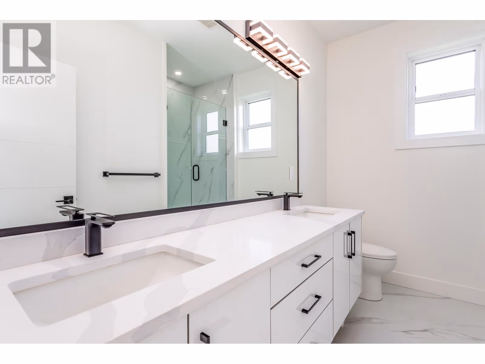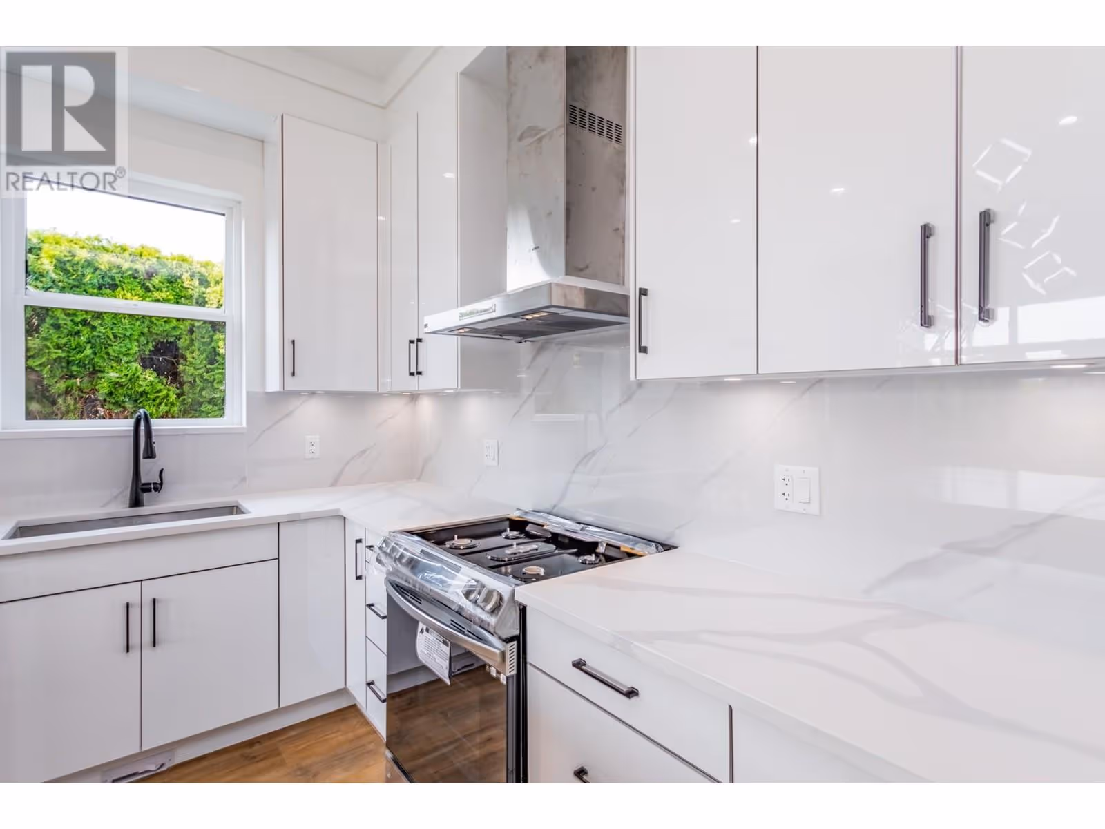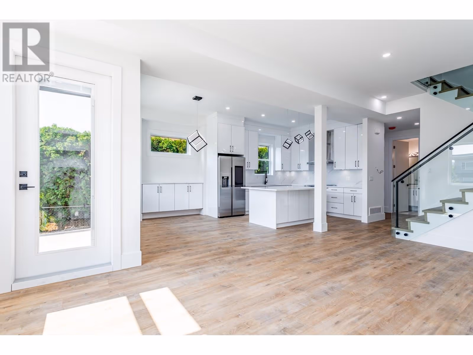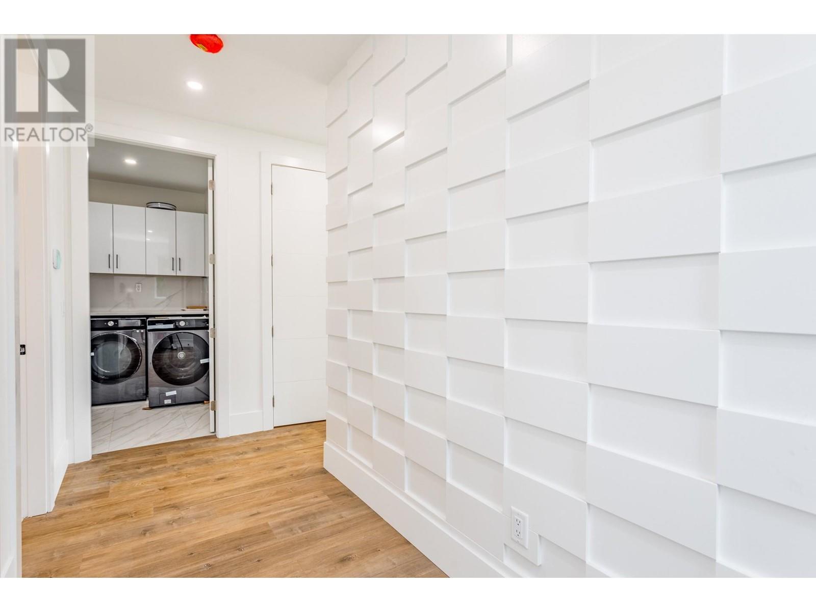 Welcome to this stunning modern new built half duplex located in the sought-after neighborhood of North Glenmore. This quality-build move in ready home features five bedrooms, five bathrooms, and includes 1 bedroom legal suite, offering rental income. The main home boasts of 4 bedrooms on the top floor, 2 of the bedrooms with ensuites and walk in closets. Enjoy the modern and sleek design with quartz counters, laminate flooring and a spacious kitchen with large island, perfect for entertaining! The attention to detail shows thru feature walls and quality finishes throughout the home. Beautiful professionally manicured fenced backyard and irrigated. Attached double garage with enough parking for at least four more vehicles in the driveway. This centrally located property is close to schools, shopping, the airport, UBC and an array of amenities. Additional features include built in vacuum system and comes with 2-5-10 year warranty. NO GST Payable. (id:58842)