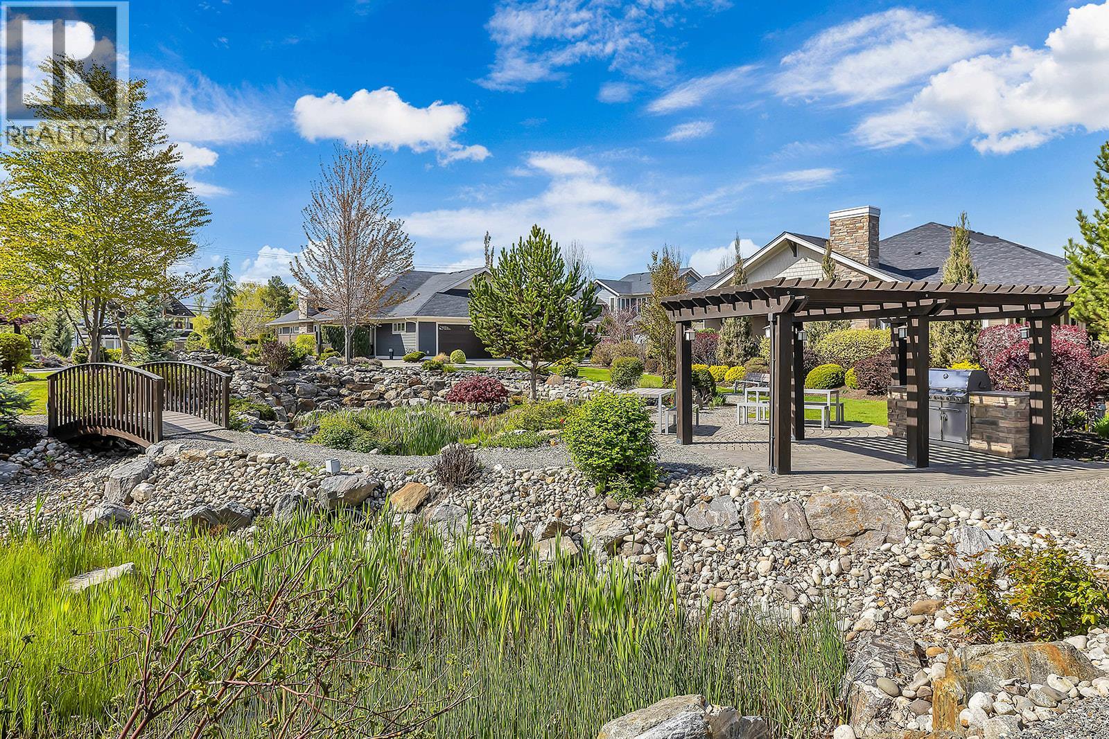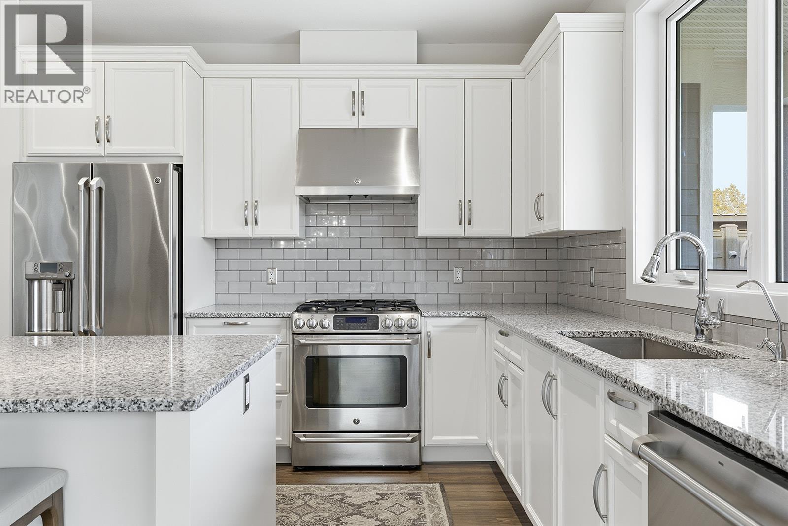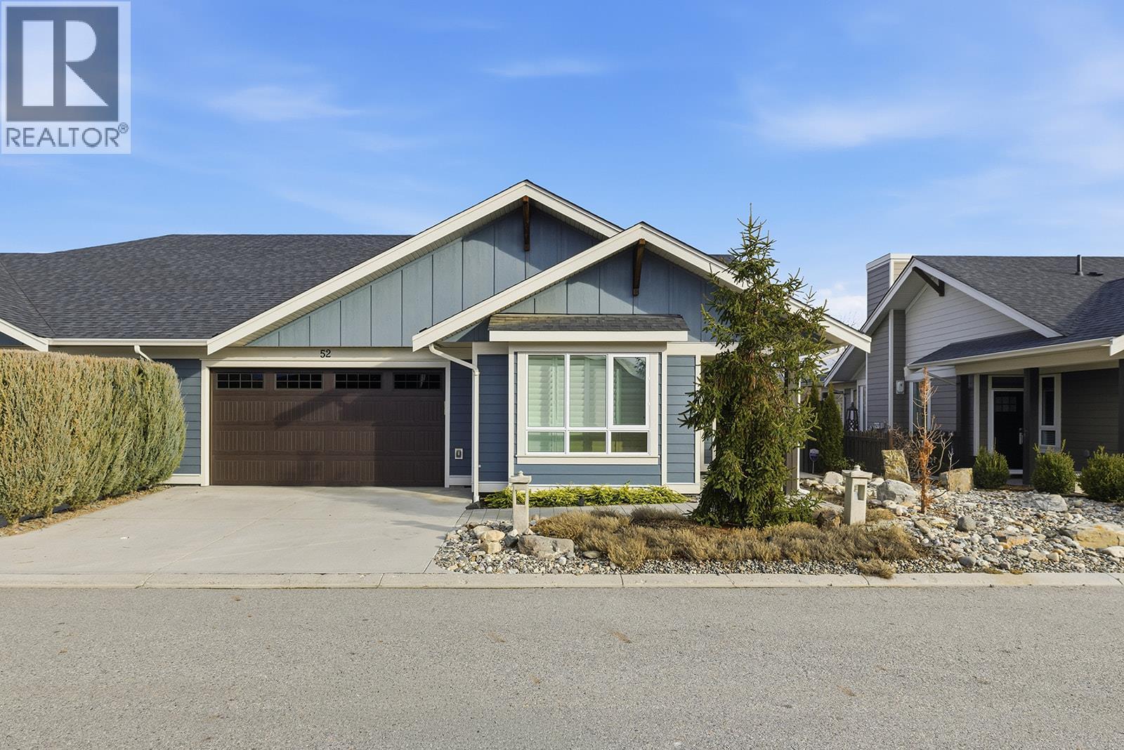 Low maintenance single-level townhome. High quality community! Fantastic opportunity to enjoy low-maintenance, stress-free, single-level living in the sought-after Gable Craft Community. Approx. 1395 sqft of single level living connects the open concept kitchen, dining and living areas with easy flow to the patio through glass sliding doors. The kitchen features granite countertops, GE stainless steel appliances, laminate flooring and in the centre of the living room is a gas fireplace set into a rock feature wall. The primary bedroom includes a 4 piece ensuite with a walk through closet, while the second bedroom sits near another full 4 piece bath. Laundry is set in its own room and a double car garage adds everyday function. Outside, enjoy a private stone block patio, fenced yard, small low maintenance lawn and space to garden along the fence line, plus a front porch, covered entry and driveway parking. Pet friendly and peaceful yet central, set across from Mission Creek Golf Course and steps to the Greenway. A smart option for first time buyers, downsizers or anyone seeking connection and easy living. (id:58842)
