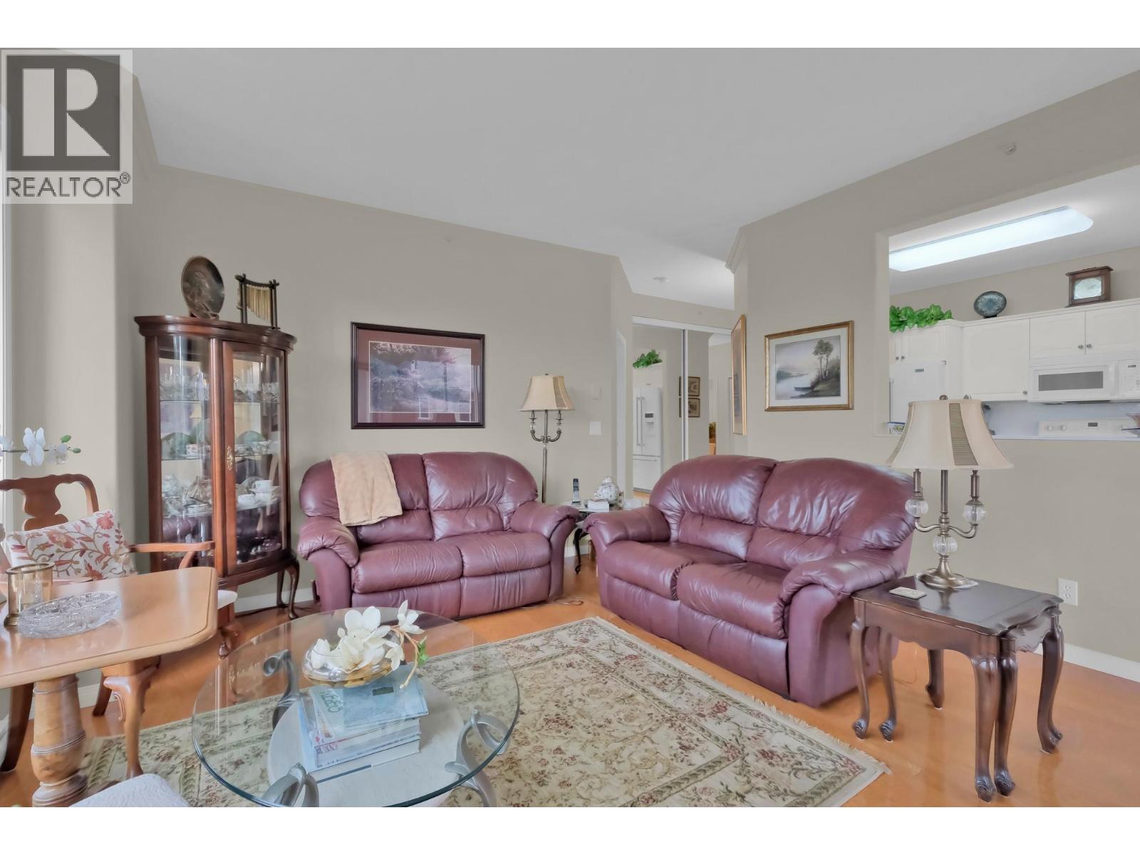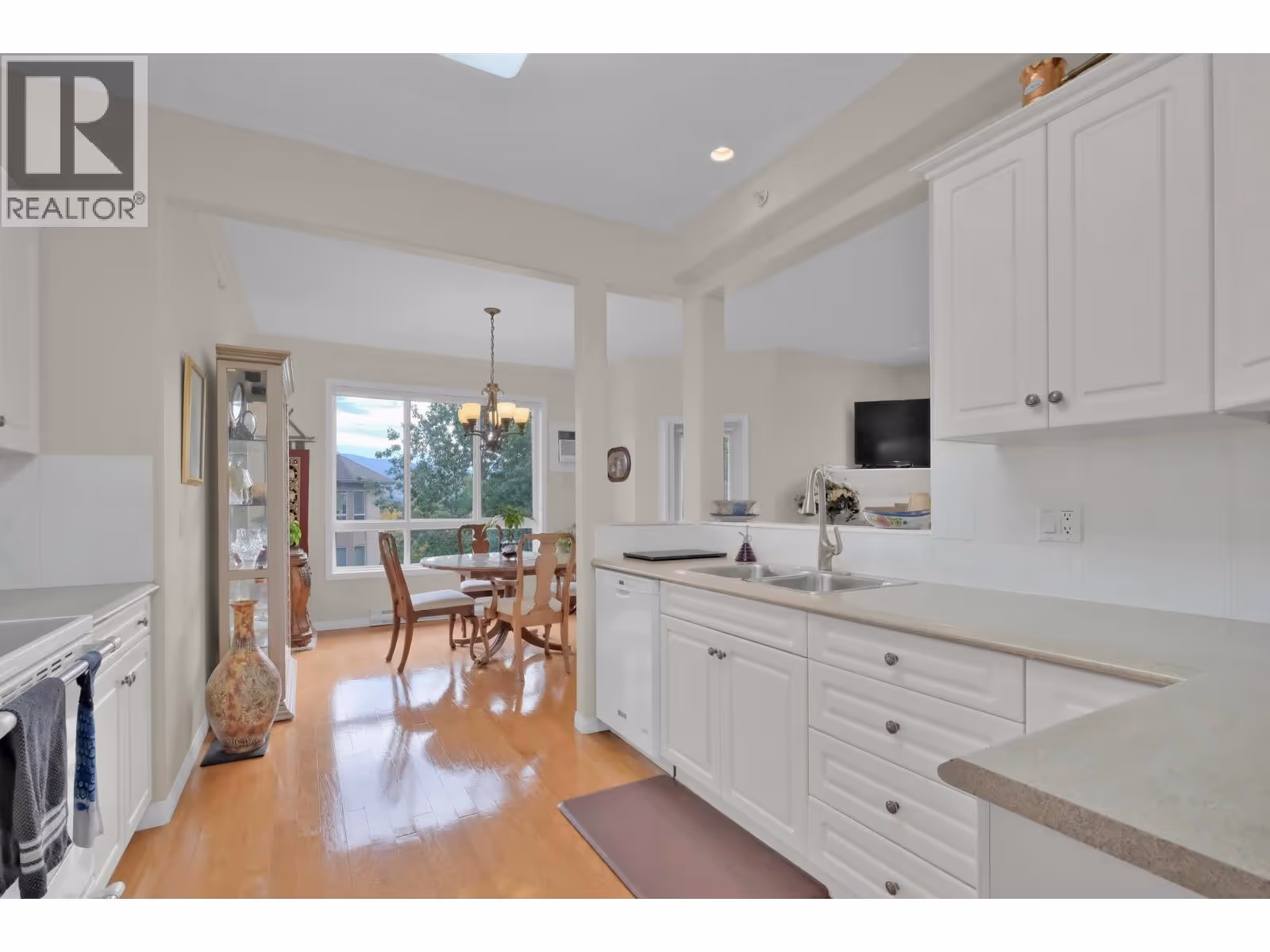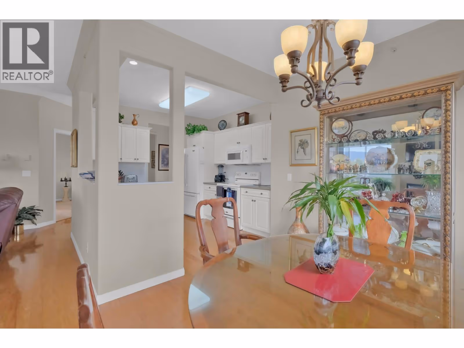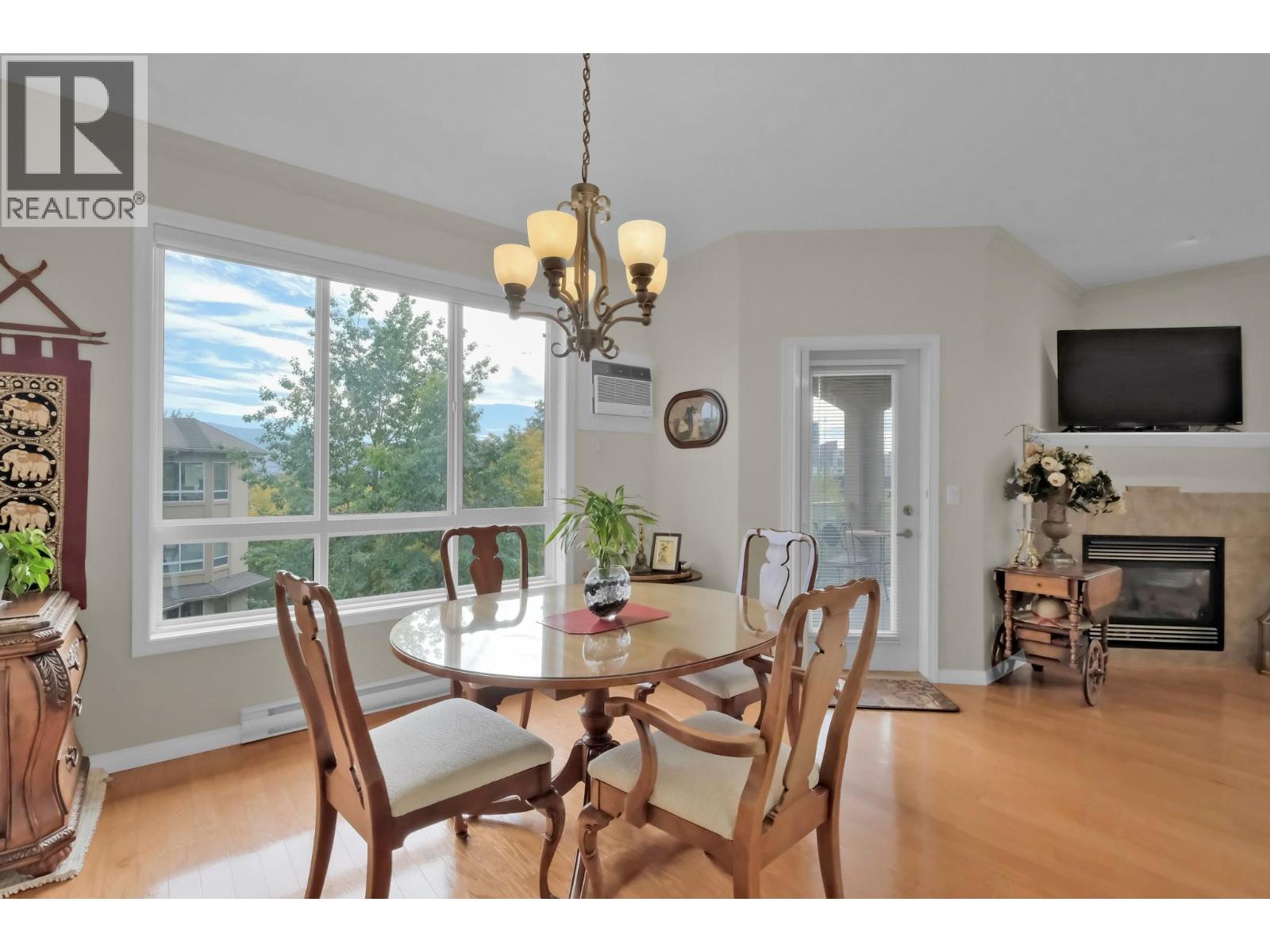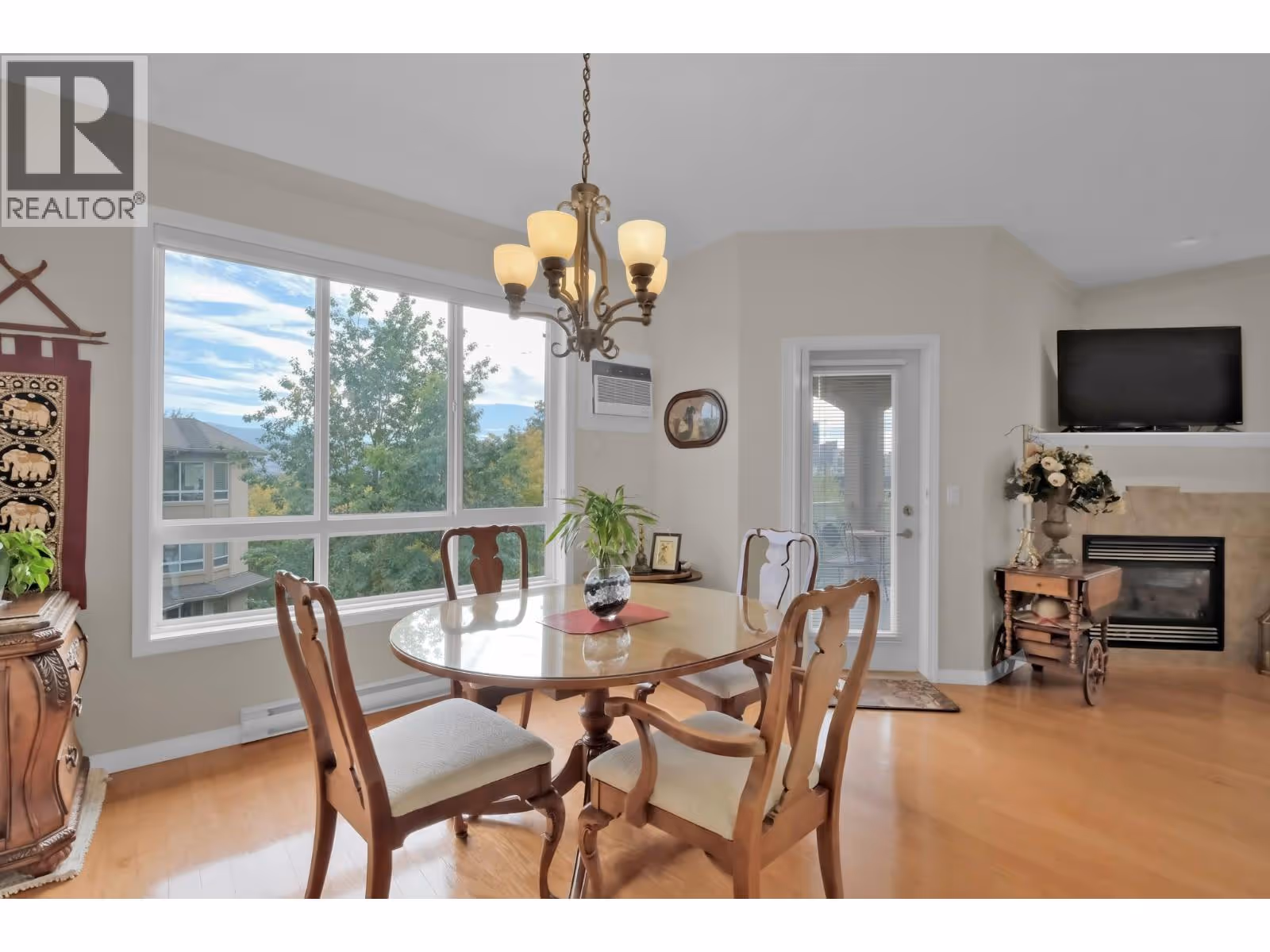 TOP FLOOR CORNER UNIT! Enjoy 1,250 sq. ft. of bright, open living space in a highly sought-after split bedroom layout. Filled with natural light from expansive windows, this home showcases real hardwood floors, mountain views, and Hunter Douglas blinds throughout—including the large covered balcony. The primary bedroom offers custom built-in closet organizers, while the second bedroom features a murphy bed, ideal for guests plus a home office. Added touches include a phantom screen door, newer A/C, updated appliances, a stand-up freezer, and gas bbq. Cozy up to the gas fireplace in winter or host summer barbecues on the balcony, with gas included in your strata fees. The storage locker is conveniently located just down the hall. Meadowbrook Estates is sought after for its resort feel. Whether you like lounging poolside in the sun or having some laughs over a game of pool with friends in the newly remodelled clubhouse, it's a perfect place to call home. Amongst the amenities are 3 guests suites with low nightly rates, bike & tire storage room and a gym. Meadowbrook is centrally located, just a stone’s throw away from transit, shopping, recreation & the rail trail. (id:58842)