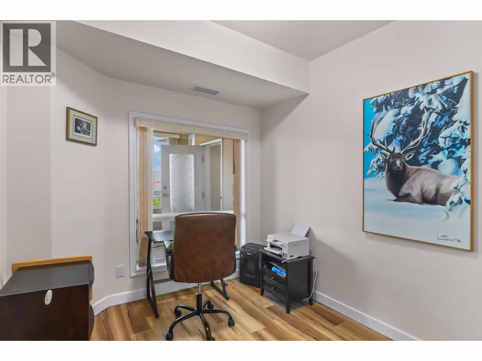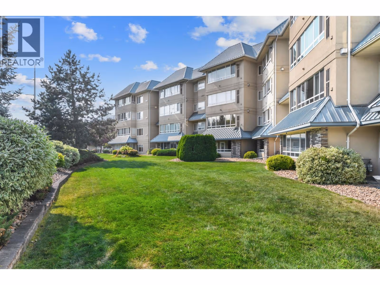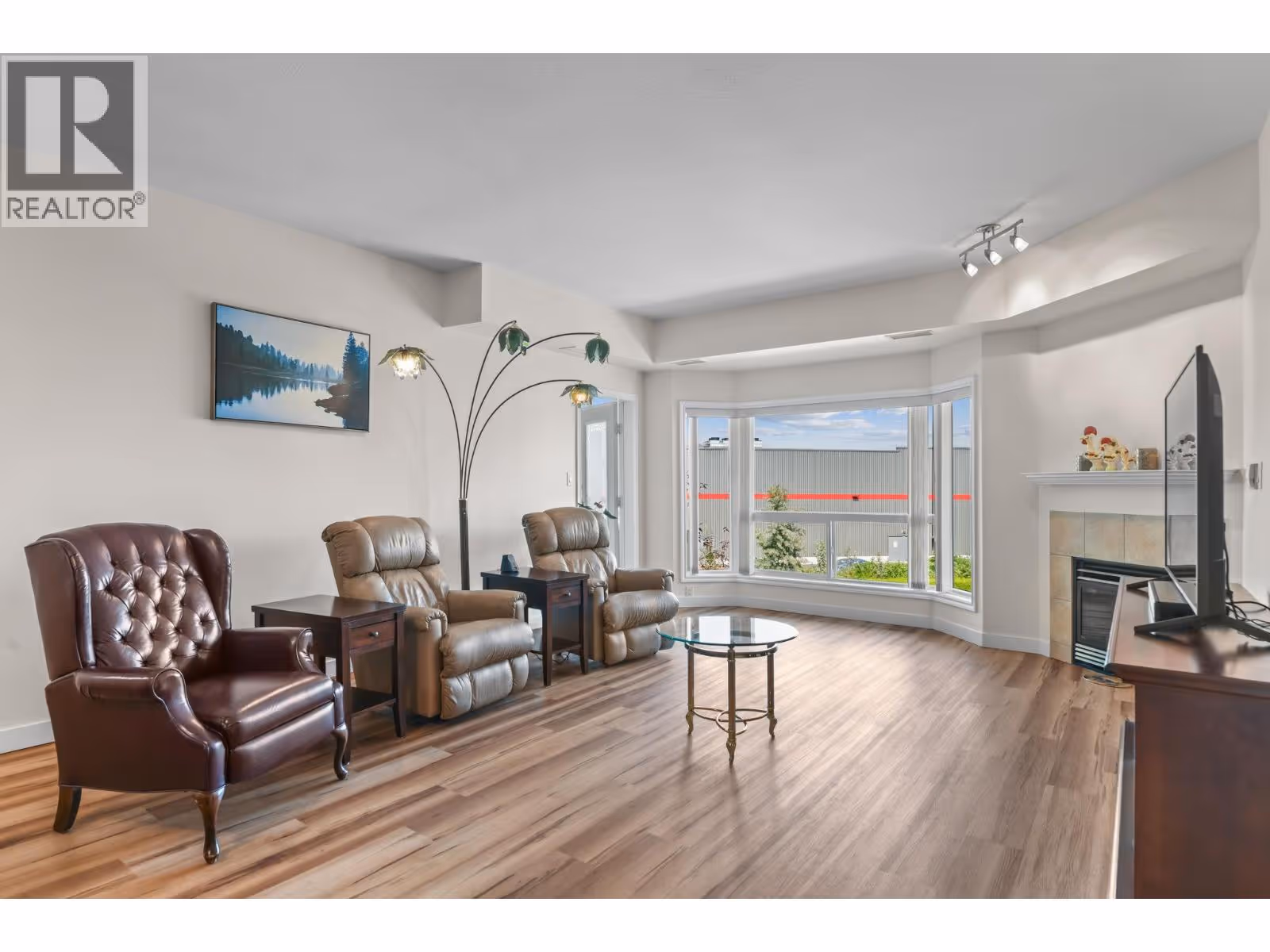 • Top-Floor 2 Bedroom + Den | 1,411+SF | Bright, Spacious, Move-In Ready • Stunning renovated living space, this bright and spacious home features new windows throughout; new flooring, baseboards, quartz counters, a huge kitchen island, new dishwasher, new modern light & bathroom fixtures. Gas fireplace. The open-concept layout is perfect for entertaining, while the den provides flexibility for an office, dining or guest space. The bonus enclosed sunroom offers another 150+ sf of living area which is not included in total square footage. No age restrictions. Pet friendly - 1 cat or 1 dog (16"" max at shoulder). 1 underground parking stall with private secured storage locker + extra outside parking. Great amenities include clubhouse, BBQ plaza for outdoor entertaining, beautiful gardens, a woodworking shop & bike storage. Secure building in a quiet yet central location—walk to Mission Creek Park and shopping. Move-in ready and sure to impress! Quick possession available. Call for a showing today. (id:58842)