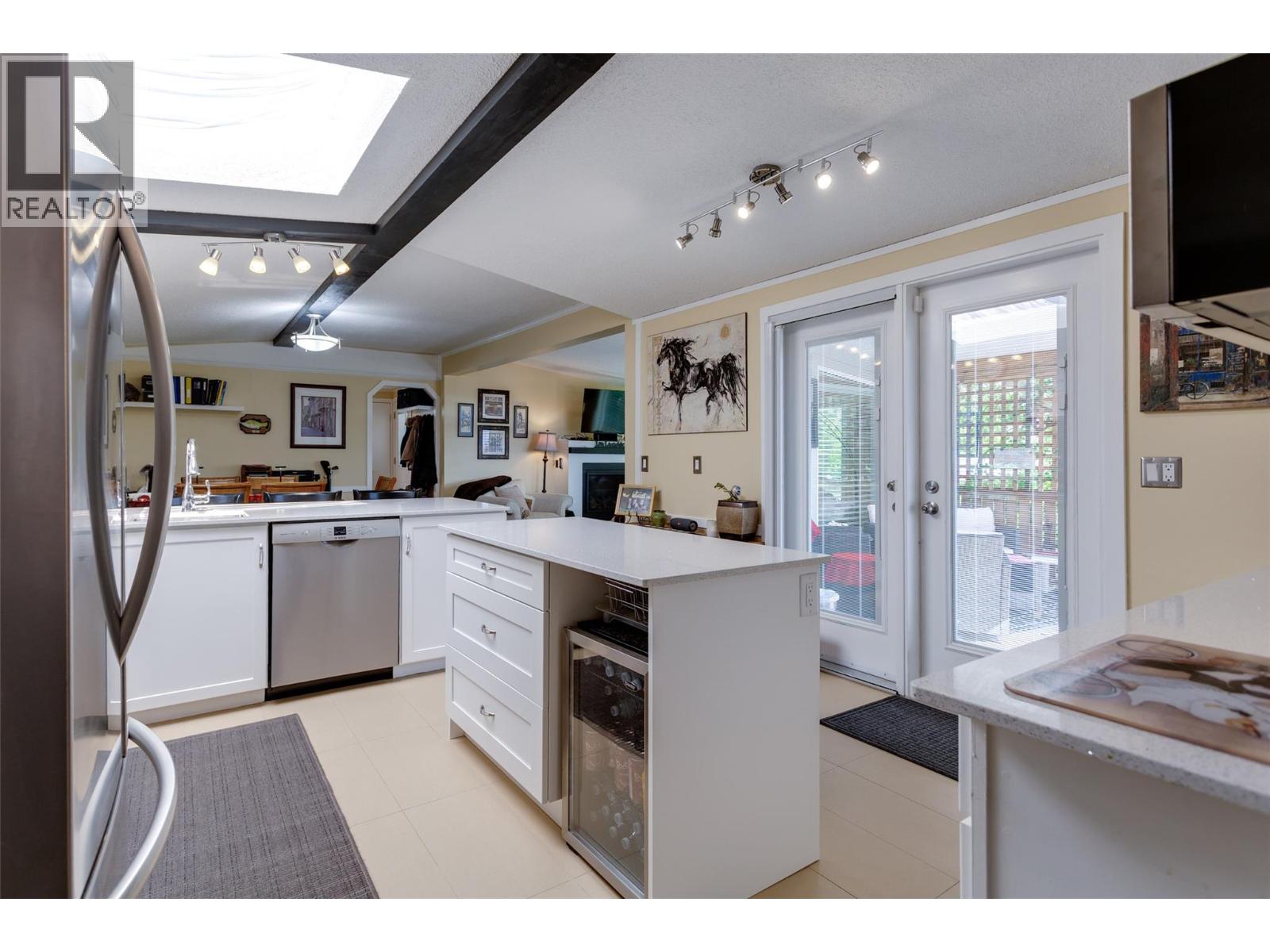 Welcome to this pristine and beautifully updated 2-bedroom, 2-bathroom home in Berkley Estates. Families Welcomed. Perfectly situated at the end of a quiet no-thru road, this home offers privacy with only one neighbor and stunning views of the mountains and a peek-a-boo lakeview from your oversized, partially covered south-facing deck—ideal for outdoor dining and relaxing. Inside, you'll find a thoughtful layout with bedrooms at opposite ends for added privacy. The spacious primary suite boasts a full ensuite bathroom with a luxurious jacuzzi tub. Enjoy the modern, fully updated kitchen featuring quartz countertops, a large island, stylish backsplash, newer cabinetry, stainless steel appliances, and ample pantry storage. The generously sized dining and living rooms are flooded with natural light and centered around a cozy gas fireplace—perfect for entertaining or quiet evenings in. Updates included: A/C & Hot Water Tank 2019, Roof & Windows 2015, Vinyl Flooring 2025, S/S Dishwasher & Microwave 2023, Tile & Freshly Painted 2023–2025, Poly-B Plumbing replaced 2025. Parking for 3 vehicles, Workshop: Included out back.Located just minutes from shopping, wineries, golf courses, and local services, Berkley Estates offers a vibrant and convenient lifestyle. 2 pets per household. Pad Rent is $610.00 per month (Includes water) Lease expires 2037. Don't miss this rare opportunity to own a move-in-ready home in a prime location with all the major updates already done! Measurements taken from I-Guide. (id:58842)
