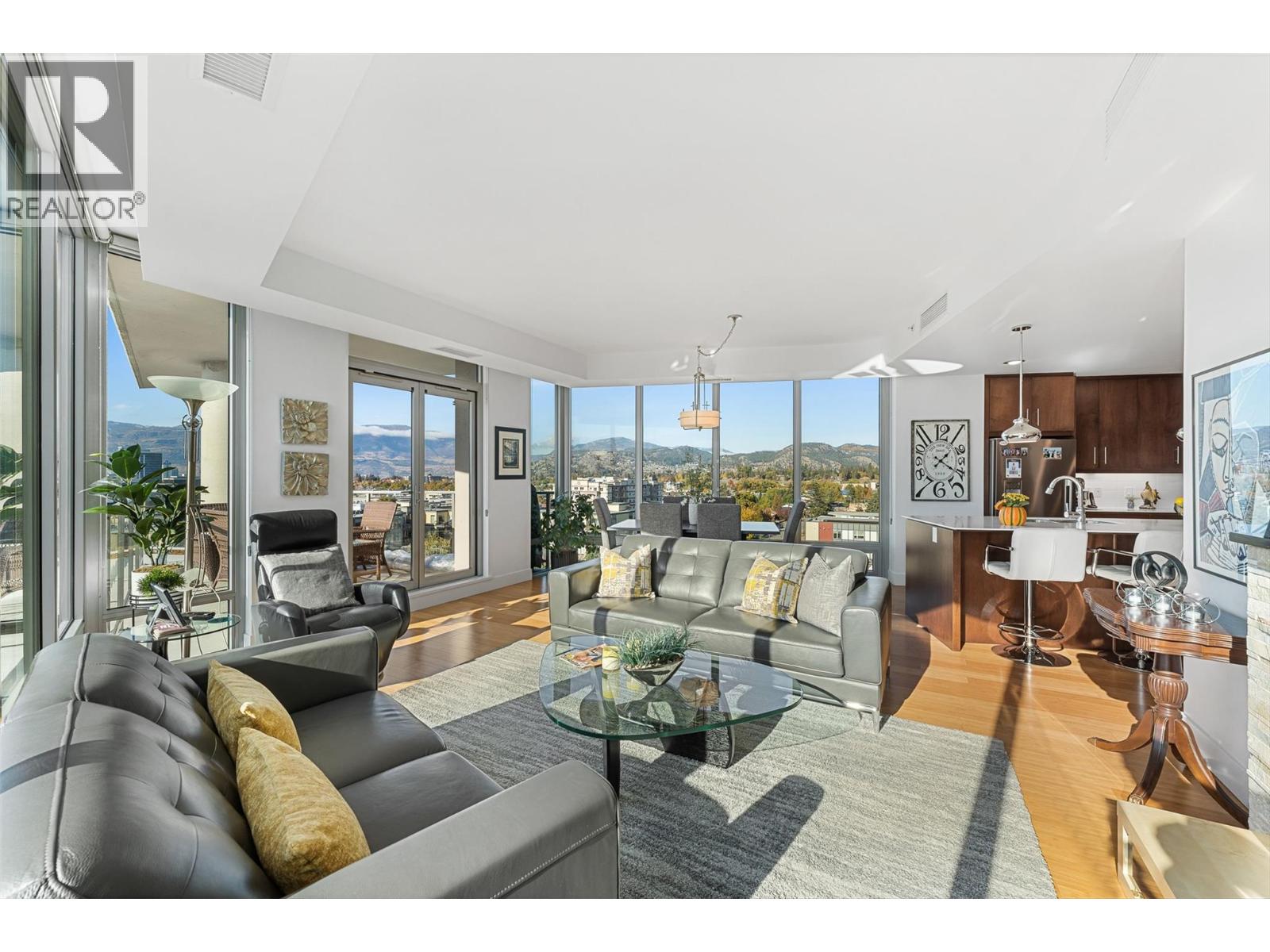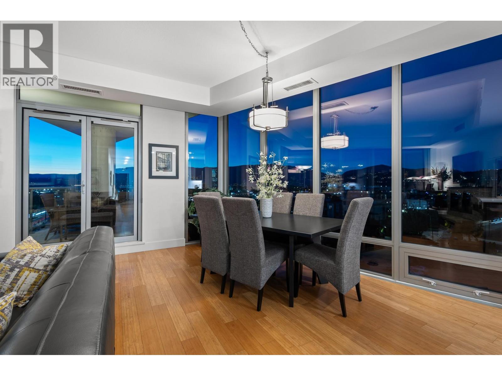 This desirable corner residence captures panoramic views of Kelowna’s cityscape, mountains, and shimmering lake views. Floor-to-ceiling windows fill the open-concept living space with natural light, creating a seamless connection between the indoors and the stunning Okanagan landscape. The kitchen is beautifully appointed with rich toned wood cabinetry, quartz countertops, a large island with seating for three, and premium appliances including a Fisher & Paykel fridge and Whirlpool range. Entertain effortlessly in the adjoining dining area beneath a contemporary chandelier, or relax in the living room beside the sleek linear fireplace framed by a stone and quartz finish. The primary suite is a private retreat with a walk-in closet, spa-inspired ensuite featuring two vessel sinks and a spacious glass shower plus direct access to a covered deck with northwest-facing city and mountain views. A second bedroom and full bath provide an ideal setup for guests. Two covered decks extend the living space outdoors—perfect for morning coffee or sunset gatherings—with gas hookup and glass railings to maximize the view. Additional features include in-suite laundry with built-in cabinetry, hardwood flooring, and ample storage throughout. Residents enjoy resort-style amenities, including a rooftop heated pool, hot tub, and fireplace patio, a fitness studio with sauna and steam rooms, underground parking with wash bays and a dog wash station, plus two private guest suites for visitors. (id:58842)