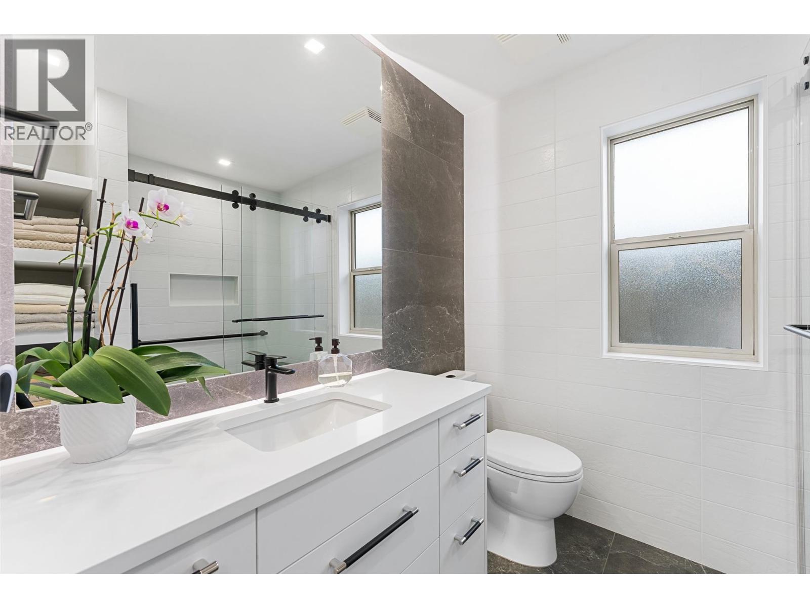Steps from Dilworth Mountain Park, this rancher-style walkout sits on 0.27 acres of natural landscape. The main level offers open-concept living with vaulted ceilings, hardwood floors, and an updated kitchen featuring white Calacatta quartz countertops, a Dynasty gas cooktop, and a spacious island. Double doors lead to a large paver stone patio perfect for summer entertaining. The primary suite includes a private deck, walk-in closet with built-ins, and a three-piece ensuite with heated tile floors and a tiled walk-in shower. Two additional bedrooms and an updated four-piece bath complete this level. The lower level offers a state-of-the-art media room with projector screen, surround sound, and a wet bar. The rec room offers room for a games table, lounging, or guest accommodations, a fully updated three-piece bath with walk-in shower and built-in bench adds spa-inspired comfort. Two large storage rooms, and walkout access to the covered lower patio connects you to the natural beauty of the property. Updated all bathrooms, laundry recently renovated, updated kitchen quartz countertops, plantation shutters. New roof, new landscaping, all new pavers around house and decking, extensive garden lighting, new high-end fencing, automatic dusk til dawn lighting, new Heat Pump, Air Conditioner, new AprilAire humidifier. Three-car heated garage with epoxy floors and NuLine garage cabinets (included). Neighbours only on one side creates added privacy. (id:58842)