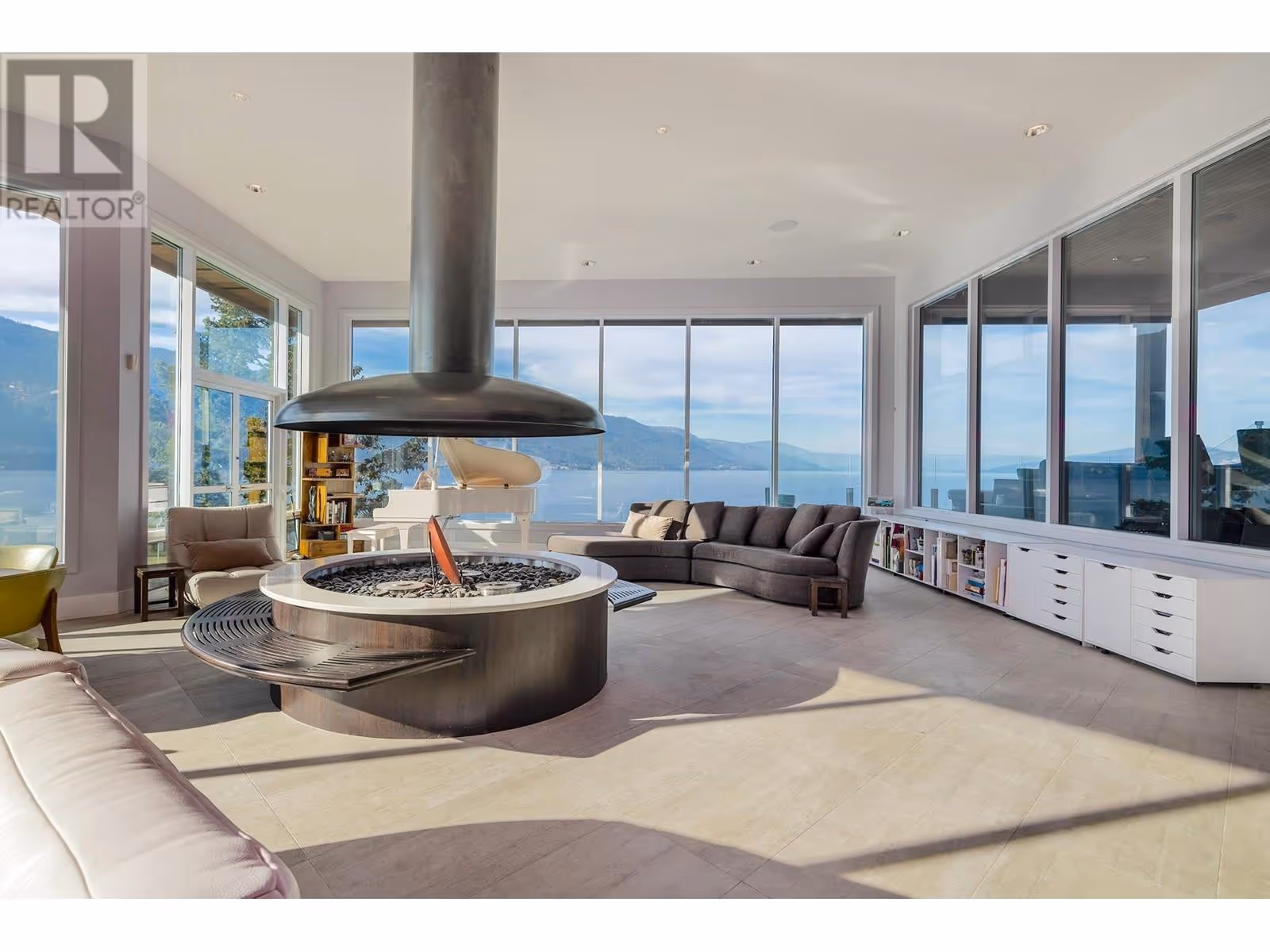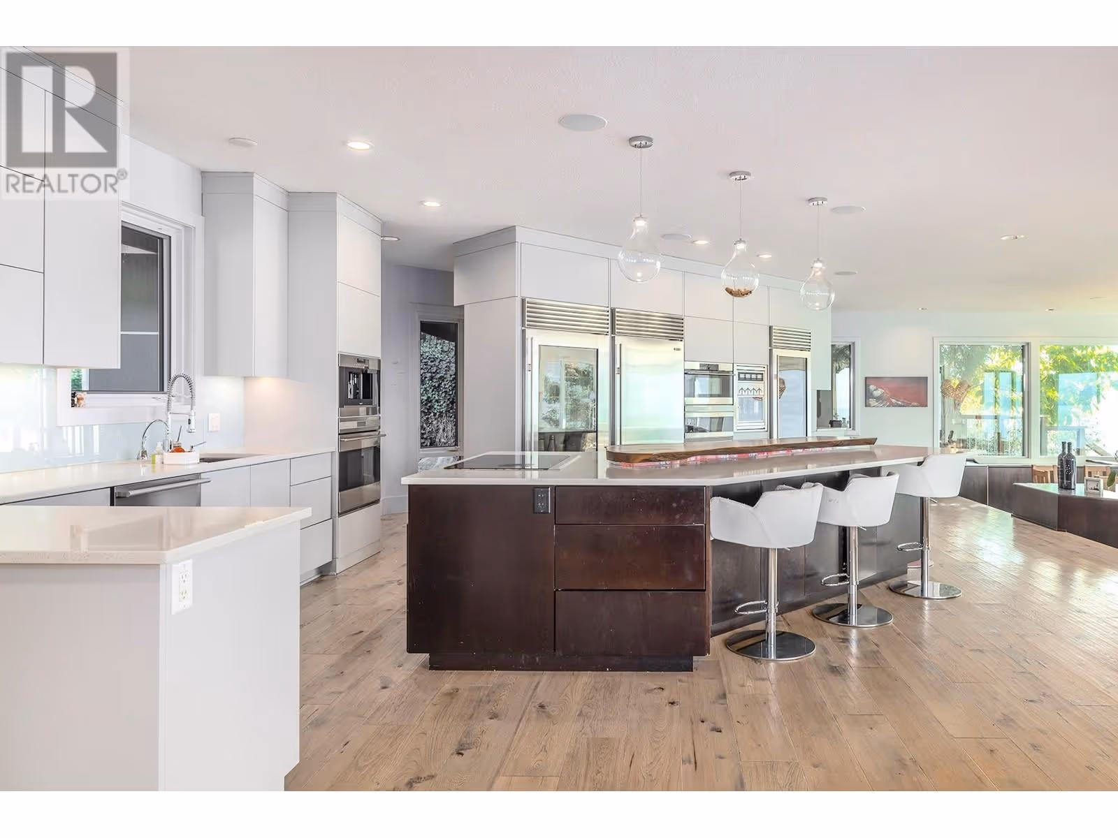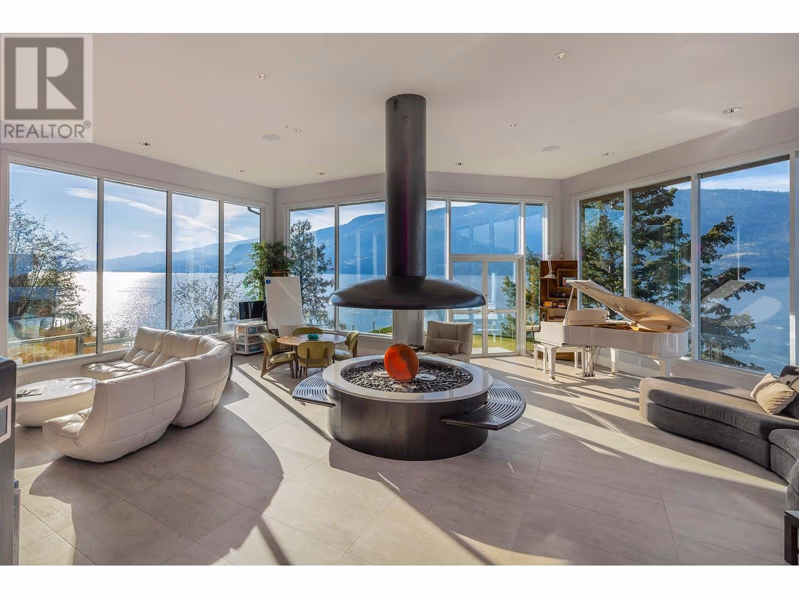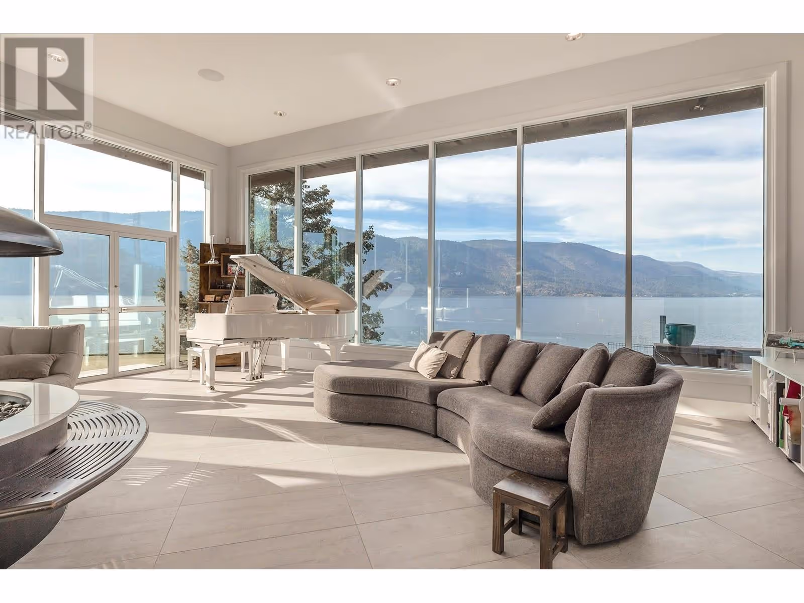 A Seamless Blend of Architecture and Nature with Panoramic Lake Views Perfectly integrated into the landscape, this stunning lakeside home captures the essence of Okanagan living—ideal as a summer escape or year-round retreat. With two spacious levels, approx. 2,000 sq. ft. of patio space, and a private wharf, it's built for lakeside enjoyment. Inside, a sun-filled, modern interior features floor-to-ceiling windows that frame breathtaking views. The chef’s kitchen boasts an illuminated live-edge island, Wolf appliances, a wine fridge, and Dacor wine station. A unique circular open fire pit anchors the living room, while the expansive wraparound patio offers glass railings, multiple lounging areas, and a mini putting green. The lower level includes four bedrooms, a luxurious primary suite with 6-piece en suite, a gym, home theatre, office, and patio with hot tub. At the water’s edge, an aluminum dock includes a boat lift and dual Sea-Doo lift. The four-car tandem garage includes an extra-tall bay for RV or boat storage. A separate two-bedroom in-law suite, connected via hallway, offers excellent privacy. Located in McKinley Landing, just minutes from Kelowna International Airport, UBCO, Okanagan Golf Club, and downtown Kelowna. (id:58842)