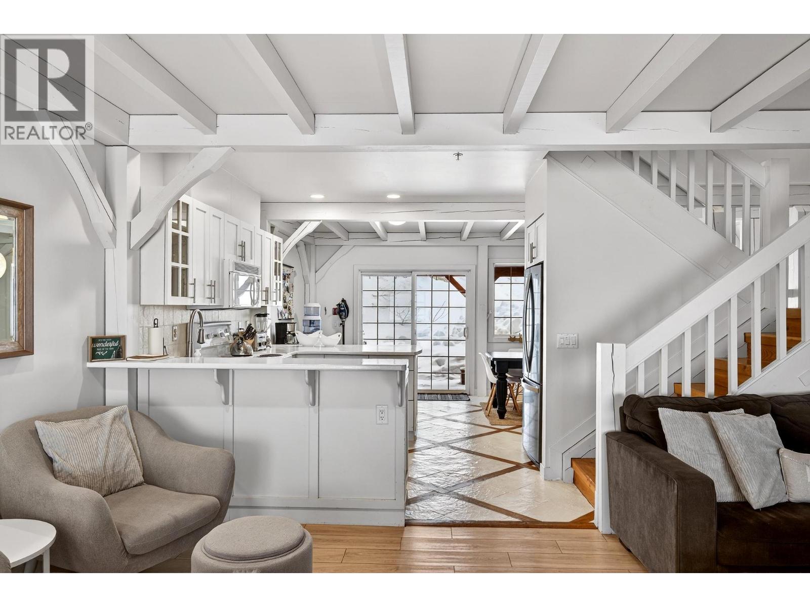 This stunning townhome at Black Bear II showcases exceptional post-and-beam architecture with a whitewashed finish that sets it apart from anything else on the mountain. Spanning three levels, this three bedroom, three bathroom home complete with a loft comfortably sleeps 8 to 16, making it ideal for families, friend groups, or savvy investors seeking strong rental revenue. The main floor is designed for gathering, featuring a cozy living room with gas fireplace, kitchen with dual breakfast bars, and a dining area that seats eight. Step outside to the covered ground-level patio perfect for the BBQ or head to the front balcony where a private hot tub awaits with sweeping views of the valley and surrounding mountain range. The upper levels offer an oversized primary suite, two additional generous bedrooms, and thoughtful storage throughout — including a spacious boot room at the entry, dedicated ski lockers, and owner lock-off storage for those who choose to rent. Two underground parking stalls are located directly in front of the unit door for seamless convenience. With effortless ski-in, ski-out access and just a short walk to the Village, this property delivers the complete Big White experience. Whether you're carving turns by day and unwinding in the hot tub by night, or maximizing your investment with rental income, this is a must-see mountain retreat. (id:58842)