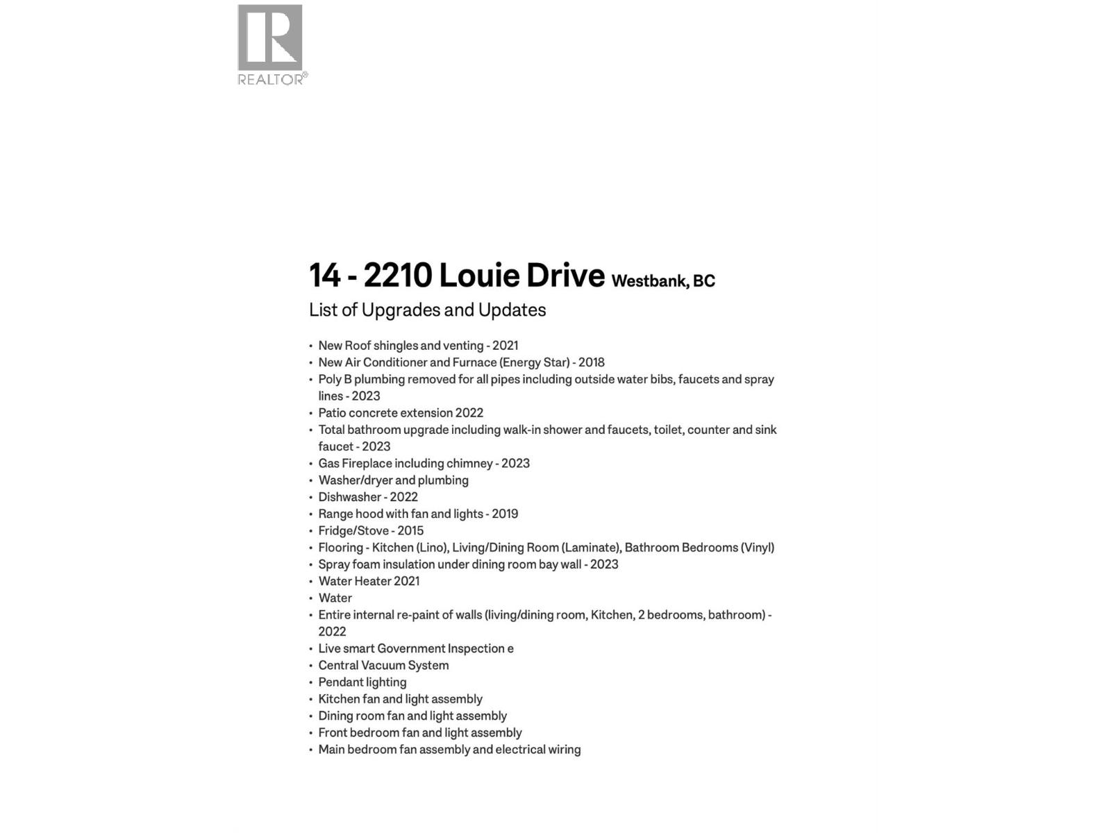 Welcome to GRANDVIEW TERRACE, a highly sought after, no age restriction, community that is close to golf, restaurants, shopping, transit and more. Enjoy one level living and don't wait on this renovated and well cared for home in central West Kelowna that is perfect for first time home buyers and empty nesters alike. This home maximizes space with a great open kitchen with eating area, 2 big bedrooms and a spacious living room that easily transitions to the park like backyard so you can enjoy relaxing on your extended patio, with hot tub hookup, and tinkering in the garden. See feature sheet for all recent upgrades that includes pex plumbing (No Poly B), gas fireplace, AC, HWT, roof, bathrooms, flooring, appliances, paint, lighting. Lease is prepaid, low Strata Fees that includes landscaping, irrigation and snow removal, plus there is no GST, PTT, Spec tax & no foreign buyers' tax! Location really can't be beat: close to transit, amenities, shopping, restaurants, coffee houses & the 2 Eagles Golf Course and Driving Range as well as easy walks to Walmart, Superstore, Starbucks, London Drugs & multiple restaurants and medical services. Parking includes one covered spot plus a second spot. There is also plenty of visitor parking available. RV parking lot in the complex on an application basis. Rentals allowed with restrictions. A maximum of 2 pets, neither of which is to exceed 25 pounds, shall be allowed to reside per unit. (id:58842)