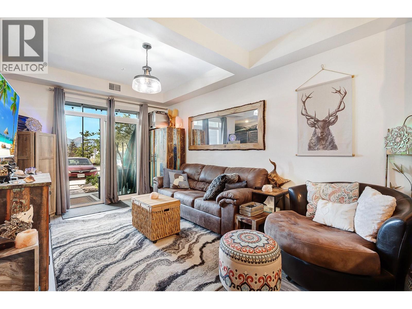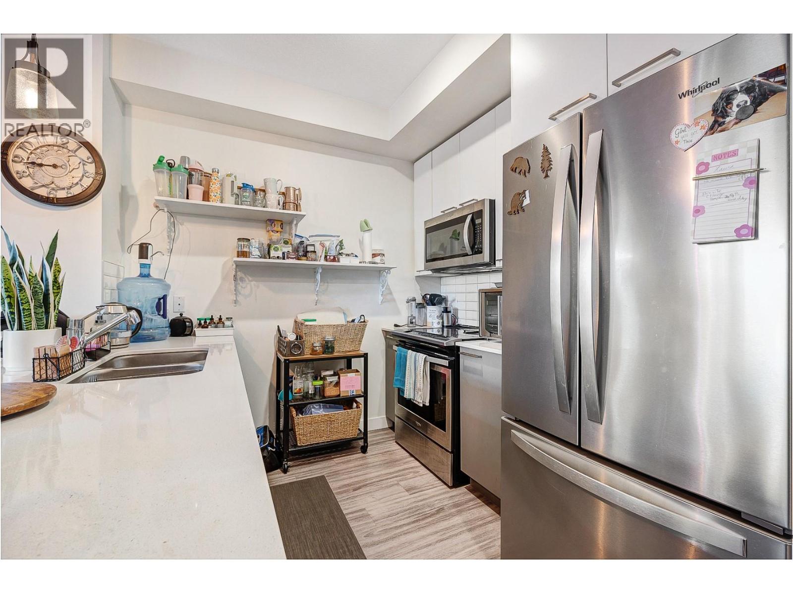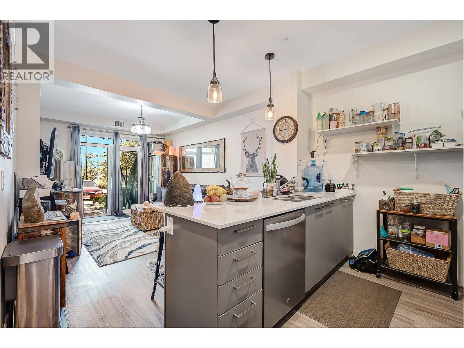 Ground Floor 1-Bedroom at NEO – Lake Views, Low Strata, Pet Friendly! Where lifestyle meets location, this ground floor 1-bedroom suite offers direct exterior access, beautiful lake and mountain views, low strata fees, and a pet-friendly policy with no size restrictions—making it ideal for pet owners, first-time buyers, or investors. Step into a sleek, modern interior featuring a white-on-white kitchen with full-height cabinetry, subway tile backsplash, quartz countertops, stainless steel appliances, and bar seating. The open-concept living area is elevated with a stylish beam and chandelier, while glass patio doors flood the space with natural light and connect to your outdoor space. The spacious bedroom & 4-piece bathroom with vanity storage provide comfort and function. Durable laminate flooring runs throughout. The complex also borders a peaceful creekside walking path, perfect for morning strolls or dog walks. Enjoy incredible shared amenities, including a rooftop patio with BBQ and panoramic views, community gardens, and efficient building systems such as LED common lighting and recirculation lines for nearly instant hot water. Located just an 8-minute walk from Gellatly Bay Aquatic Park, with beaches, dog park, zipline, pier, and waterfront paths—plus shopping, restaurants, and West Kelowna’s famous Wine Trail all nearby. This stylish, low-maintenance home is the perfect blend of lifestyle, location, and value! (id:58842)