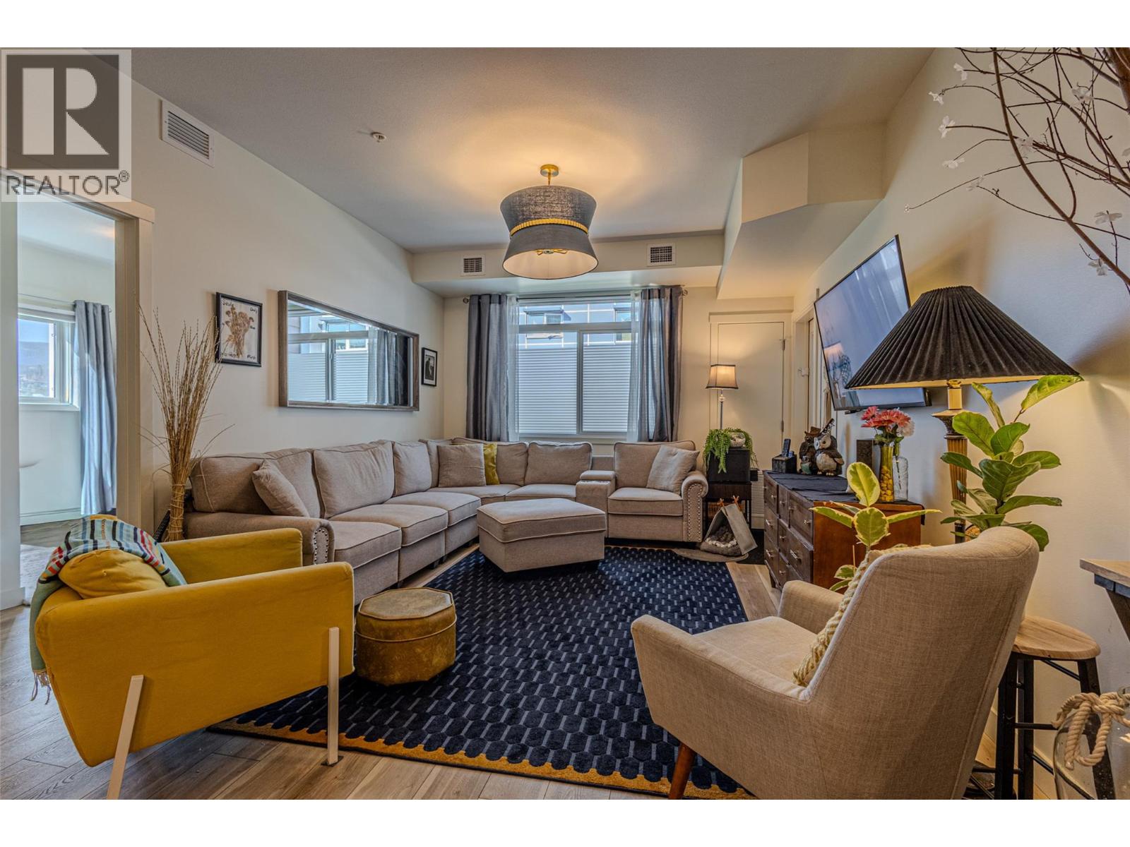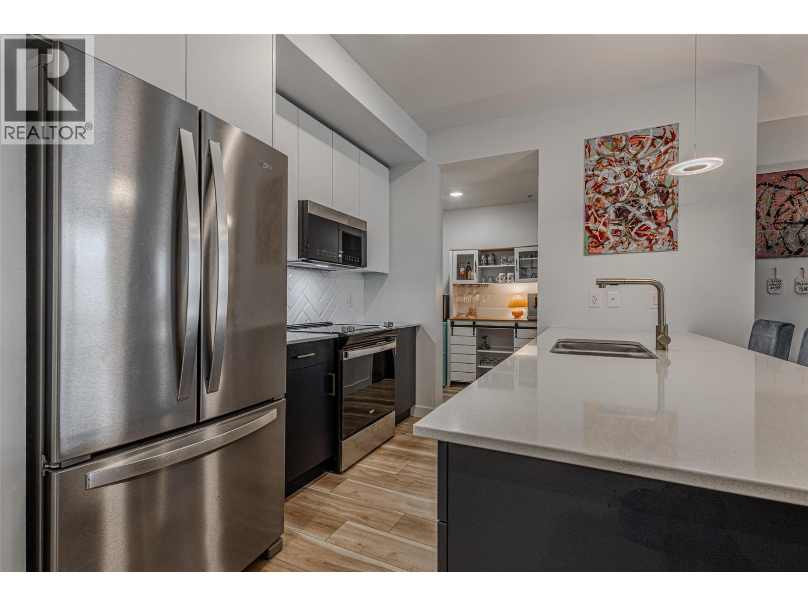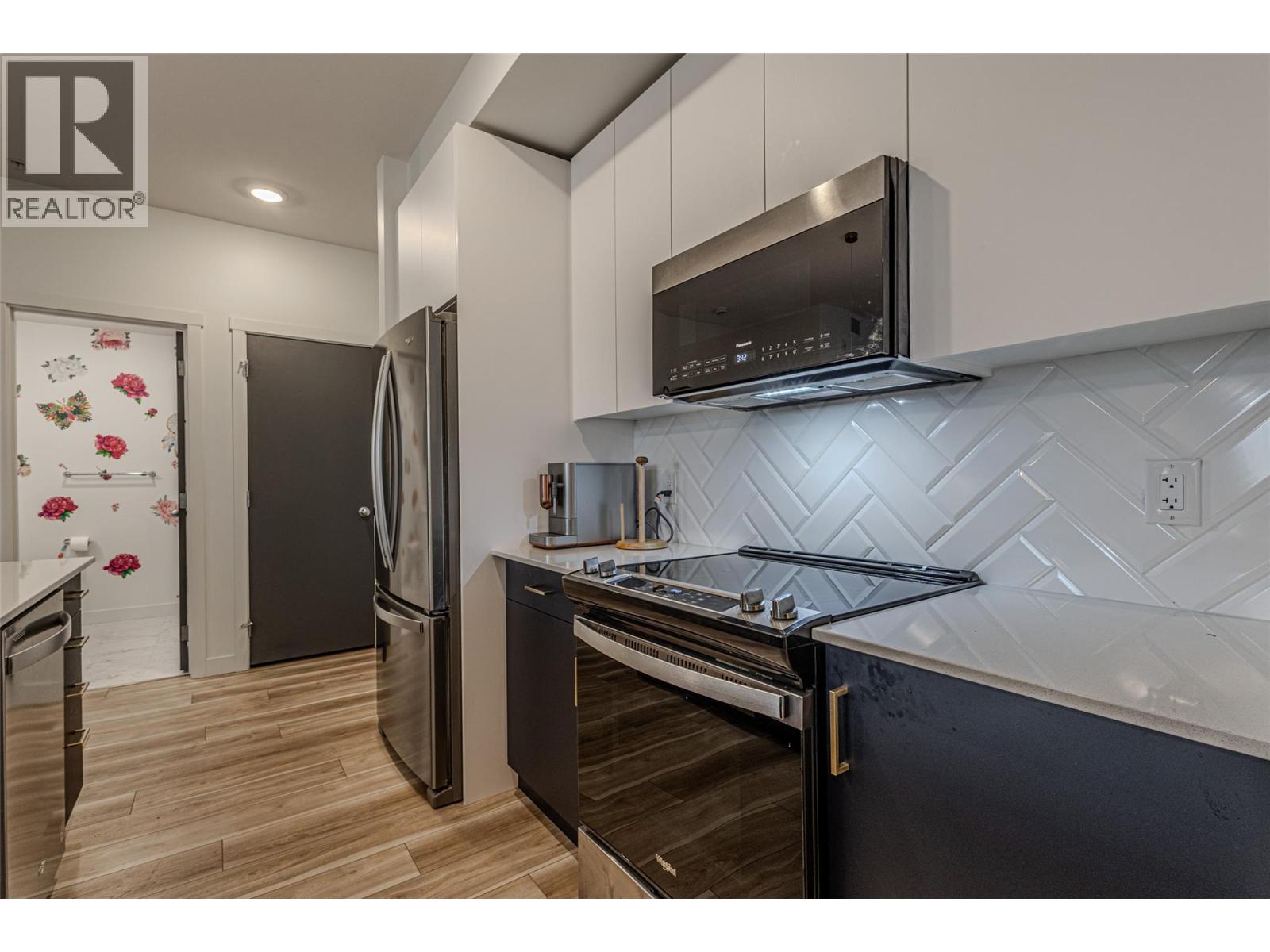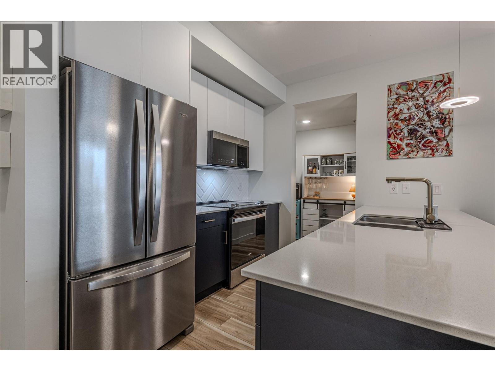 A welcoming, fully renovated, 2-bedroom, 2-bath+den in a fantastic location within the modern NEO residence! Walking distance to new park space and a paved creek feature walkway that travels through Majoros park up to shopping and amenities. Also easily walkable to the Gellatly Bay - providing an aquatic park, dog park, dock, marina, beaches and a 2km lakeside walking trail. 302 is a corner unit with views of Majoros park greenery, more privacy and an additional window with no parking lot view! Upgraded soundproof flooring and ceilings with 18cm gypcrete for comfort. Functional split bedroom, high ceilings making the space feel bright and large. Kitchen contains custom 2 tone cabinets with chevron tiling backsplash and oversized island - great for hosting! Entire unit has new vinyl flooring, lighting upgrades, shower upgrades and a walk-in-closet. Unit comes with an underground parking stall and brand new appliances. NEO residence was constructed in 2018 and certified green with solar panels reducing strata fees and the unit has a green brand-new HRV system providing heat and air conditioning reducing hydro bills. The building provides a communal large rooftop patio with panoramic views and a gas BBQ for socializing. Several community garden boxes are available. NEO is located just off the wine trail with 17 wineries and 9 dining options. Rentals allowed and pet-friendly allowing 2 dogs or 2 cats or 1 of each. Book your viewing today! (id:58842)