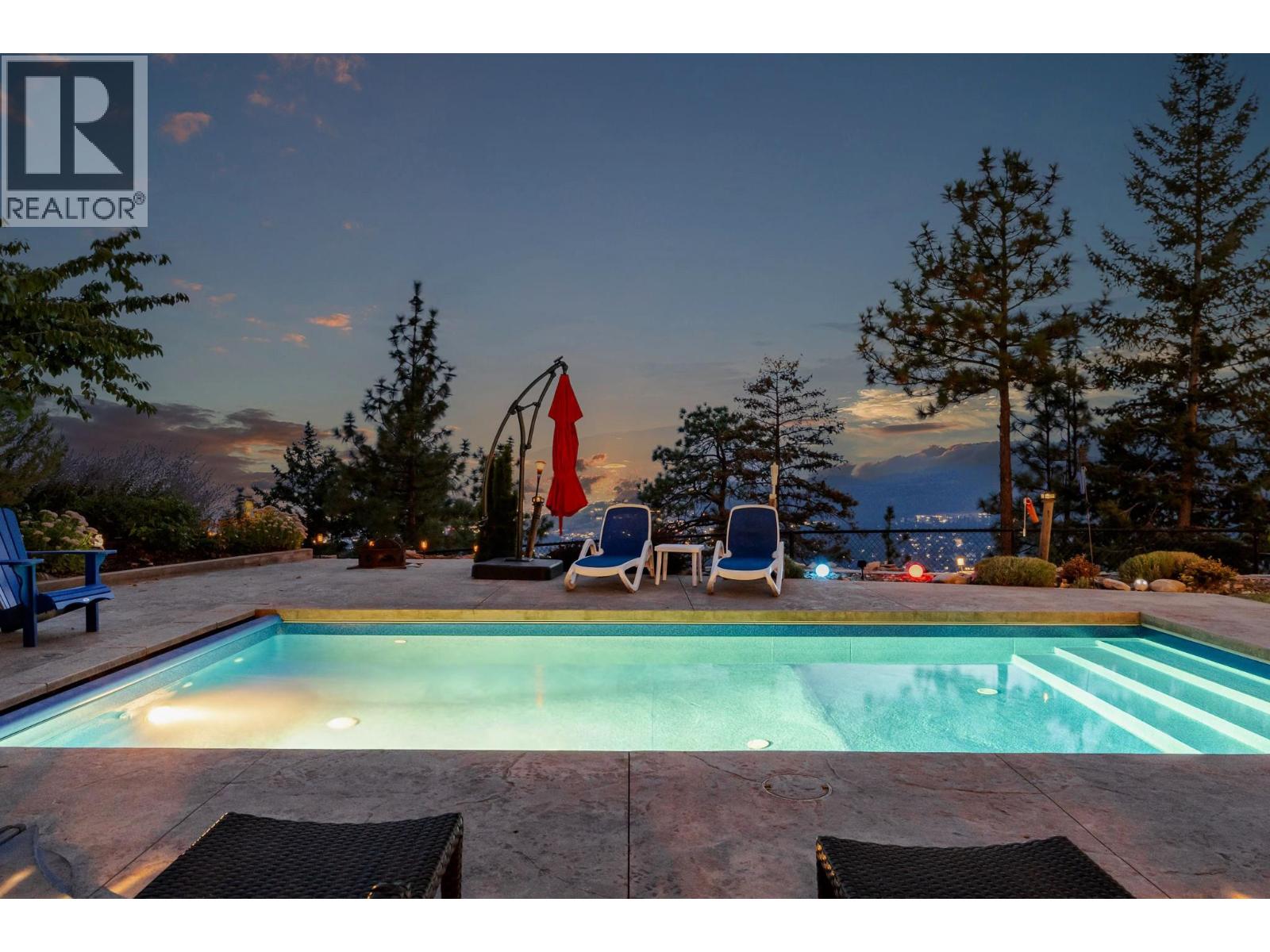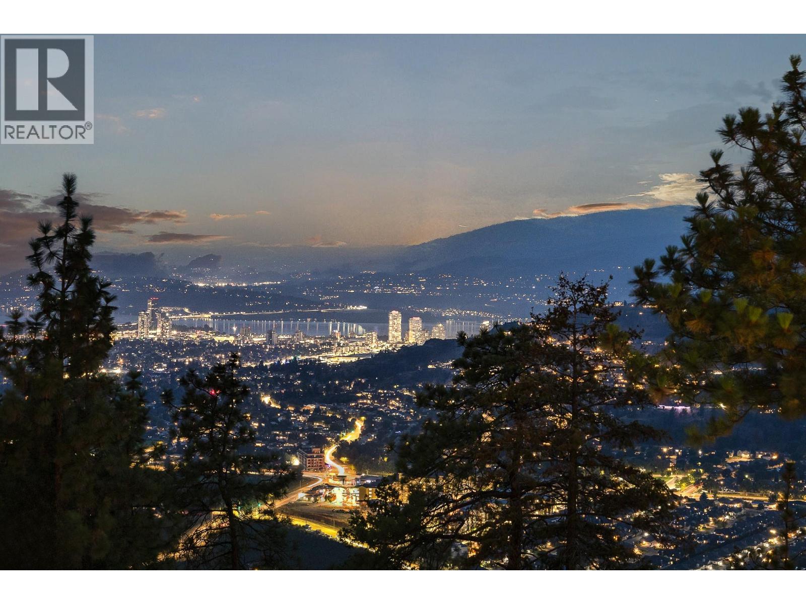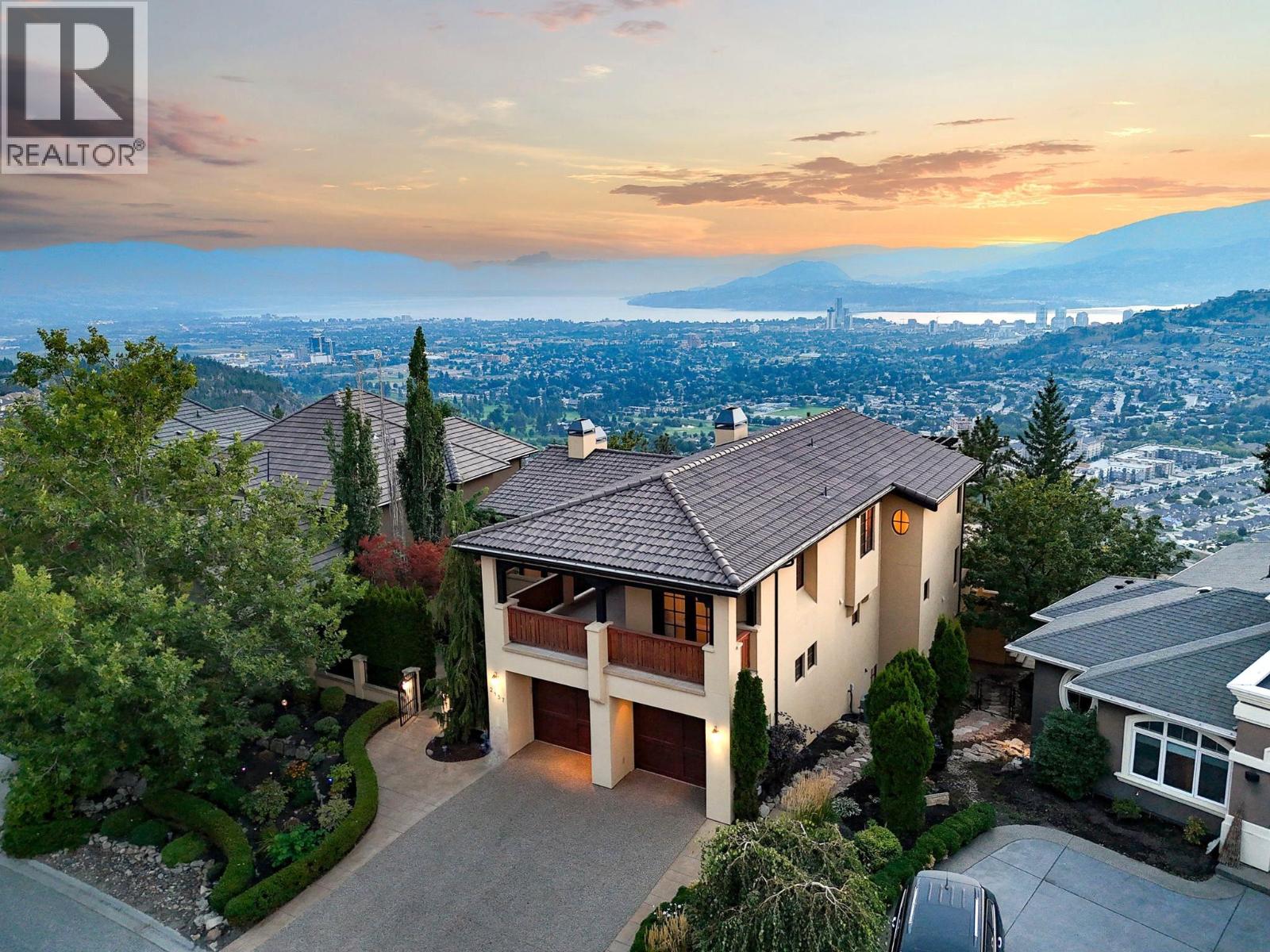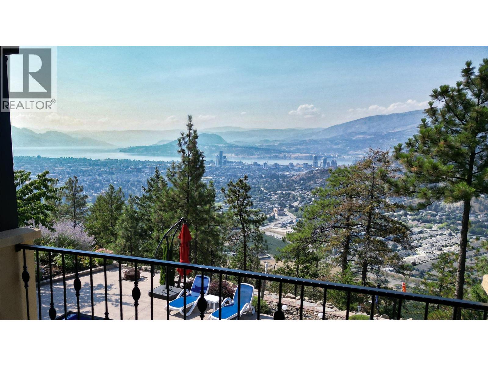 This extraordinary home on Dilworth Mountain is perfectly positioned to capture breathtaking panoramic lake, city, and mountain views. Arrive through the gated, private courtyard, where a tranquil water fountain sets the tone for the elegance within. Designed for both entertaining and everyday comfort, the home seamlessly blends indoor-outdoor living with soaring vaulted ceilings, expansive nano glass doors leading to a large deck, bringing the outdoors in. The gourmet kitchen is appointed with top-of-the-line appliances, granite counters, alder cabinetry, travertine finishes, and a pantry providing additional storage. The great room exudes warmth and relaxation with its floor-to-ceiling fireplace, exposed beams, and rich hardwood floors. Upstairs, the lavish primary suite is a sanctuary unto itself, featuring a lounge area with fireplace and French doors to a deck showing off the spectacular city and lake views. The fully equipped ensuite offers a double shower and stand-alone tub, complemented by an oversized walk-in closet, dressing room, and private laundry. A flex room off the ensuite provides space for an office/nursery and has its own private and shaded deck. The lower level boasts three bedrooms and two bathrooms, along with a cozy living room that flows directly to the pool deck. This level also includes a wet bar, fireplace, and secondary laundry. Outdoors, soak in the stunning views from any of the 5 decks/sitting areas, the sparkling pool, or by the stone fireplace. The yard is framed by lush landscaping and fruit trees, creating a private and peaceful retreat. Completing this exceptional property is a spacious double garage, offering ample room for vehicles and storage. (id:58842)