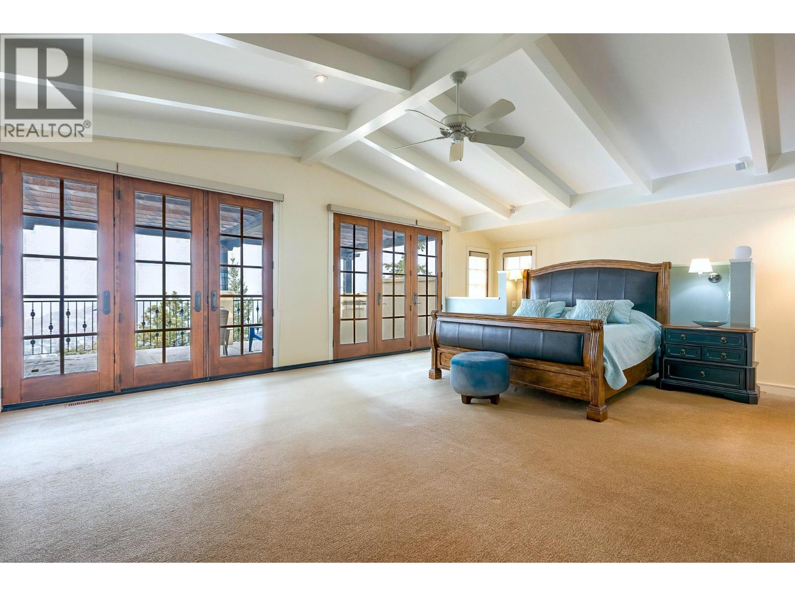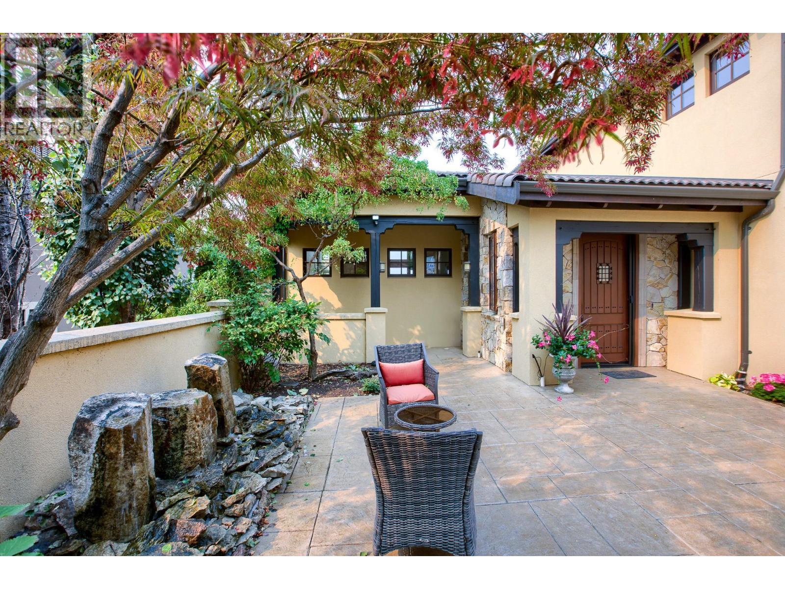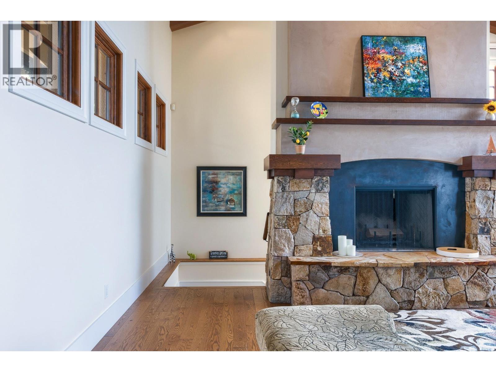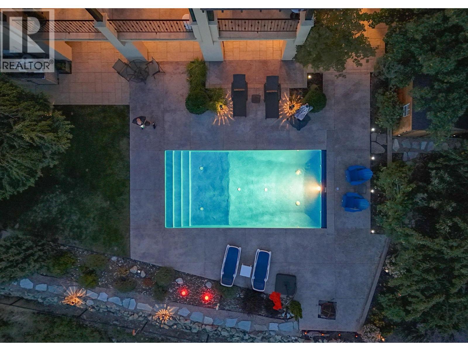 This extraordinary home on Dilworth Mountain is perfectly positioned to capture breathtaking panoramic lake, city, and mountain views. Arrive through the gated, private courtyard, where a tranquil water fountain sets the tone for the elegance within. Designed for both entertaining and everyday comfort, the home seamlessly blends indoor-outdoor living with soaring vaulted ceilings, expansive nano glass doors leading to a large deck, bringing the outdoors in. The gourmet kitchen is appointed with top-of-the-line appliances, granite counters, alder cabinetry, travertine finishes, and a pantry providing additional storage. The great room exudes warmth and relaxation with its floor-to-ceiling fireplace, exposed beams, and rich hardwood floors. Upstairs, the lavish primary suite is a sanctuary unto itself, featuring a lounge area with fireplace and French doors to a deck showing off the spectacular city and lake views. The fully equipped ensuite offers a double shower and stand-alone tub, complemented by an oversized walk-in closet, dressing room, and private laundry. A flex room off the ensuite provides space for an office/nursery and has its own private and shaded deck. The lower level boasts three bedrooms and two bathrooms, along with a cozy living room that flows directly to the pool deck. This level also includes a wet bar, fireplace, and secondary laundry. Outdoors, soak in the stunning views from any of the 5 decks/sitting areas, the sparkling pool, or by the stone fireplace. The yard is framed by lush landscaping and fruit trees, creating a private and peaceful retreat. Completing this exceptional property is a spacious double garage, offering ample room for vehicles and storage. (id:58842)