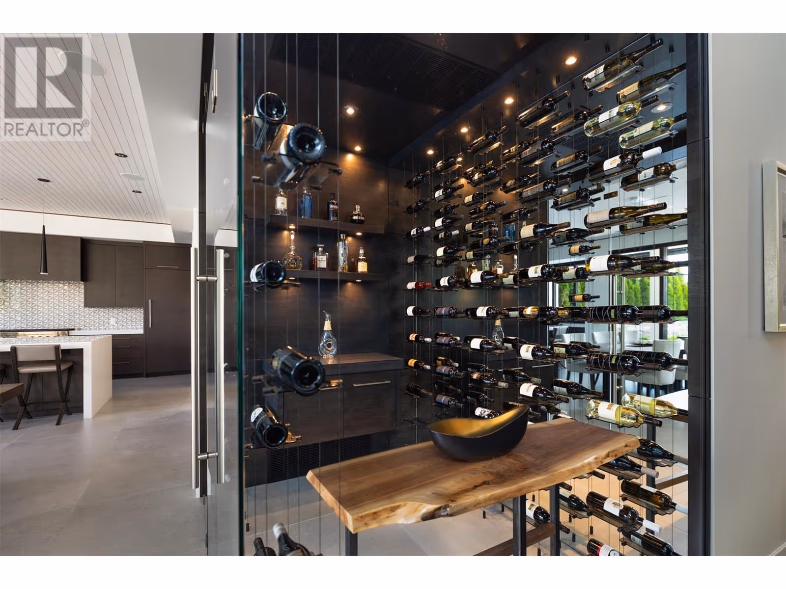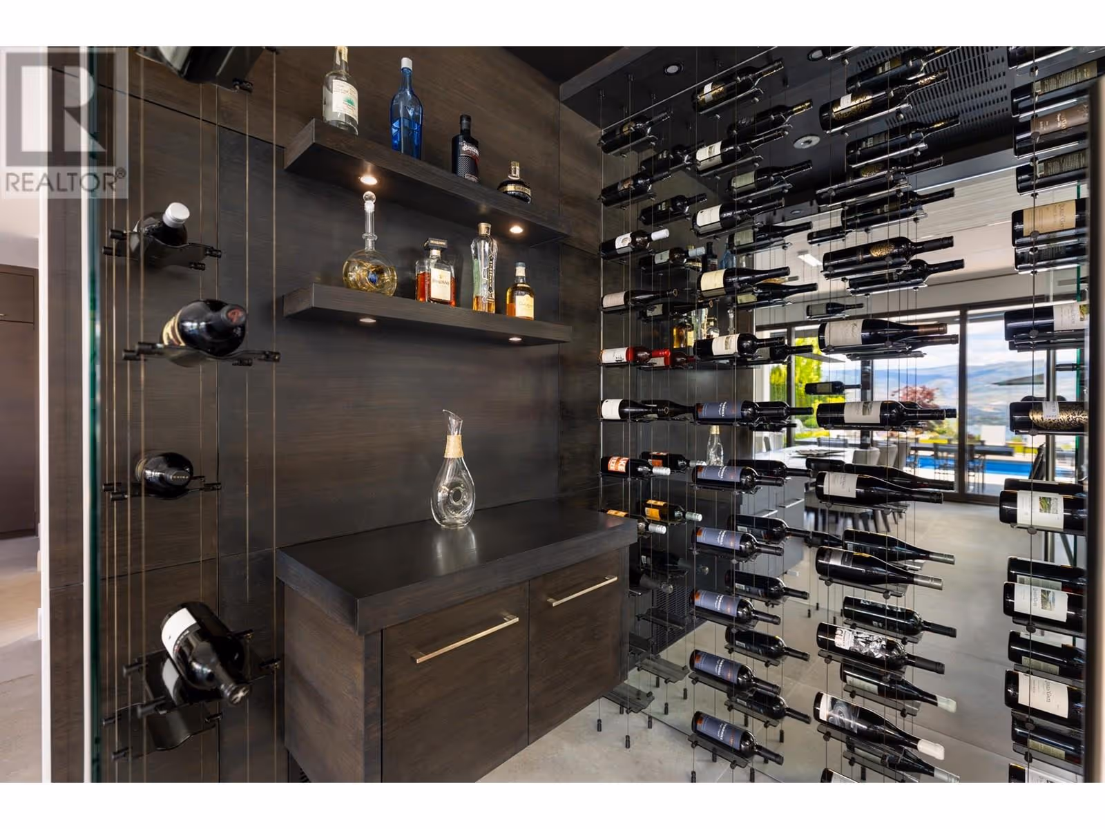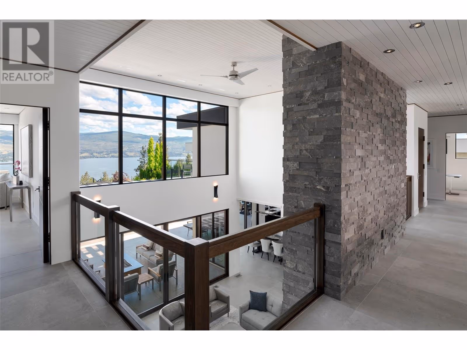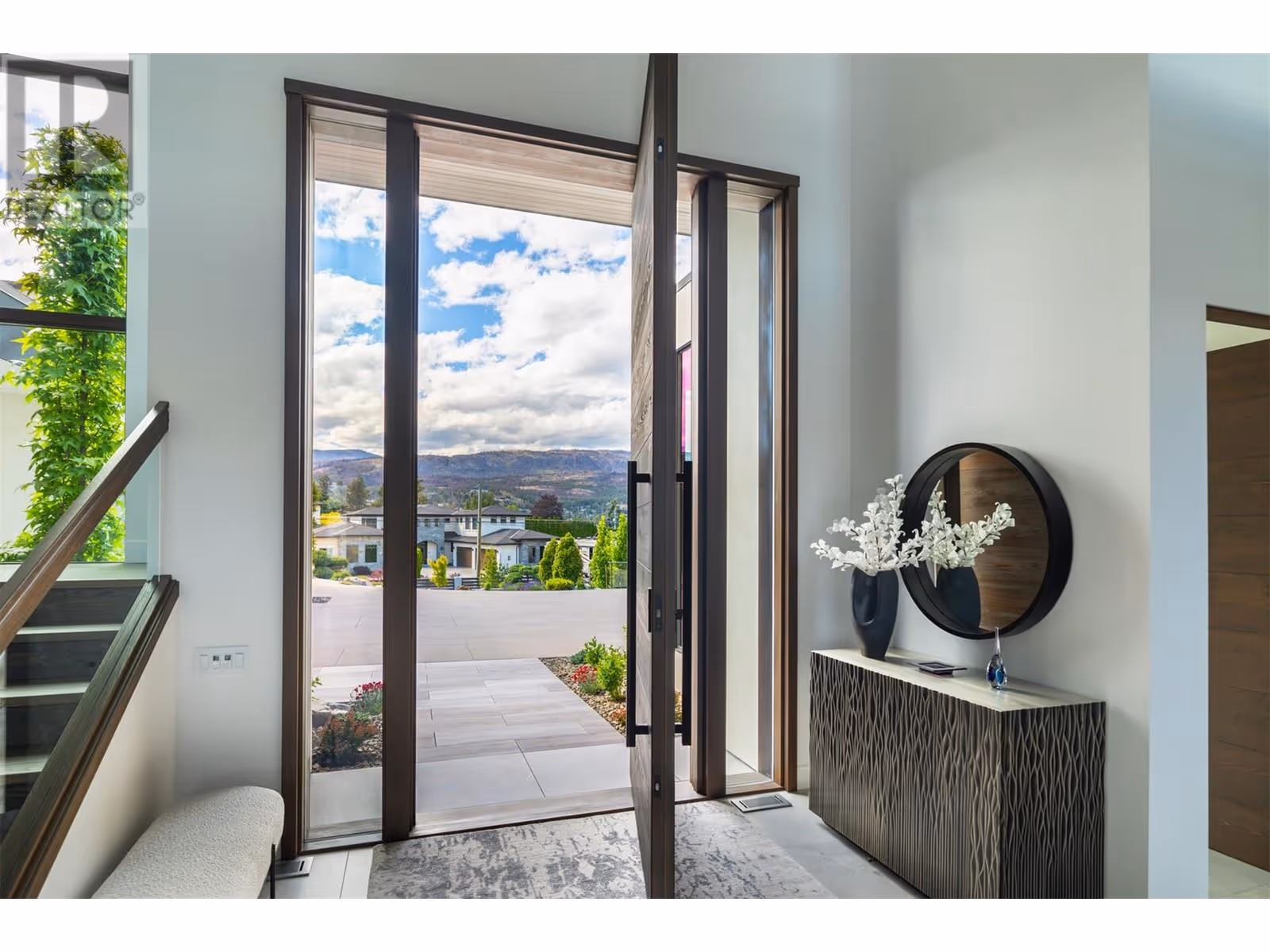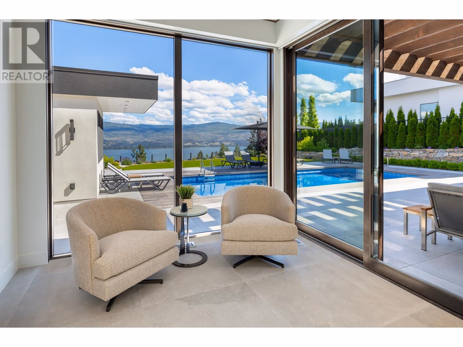 Custom SanMarc home on desirable Thacker Drive in Lakeview Heights. This property boasts exceptional attention to detail that is sure to impress. Expertly designed, it offers a remarkable layout inside & out for everyday living while maintaining its allure as a modern masterpiece.From nearly every room & the backyard, enjoy expansive, unobstructed Okanagan Lake views. A solid wood 12-ft pivot door welcomes you to the foyer with a 20-ft marble tiled entry wall leading to the catwalk on the 2nd level, connecting the 2 wings of the home. The great room boasts 23-foot ceilings, floor-to-ceiling windows, & an 80-inch linear gas fireplace. Gourmet kitchen w/ Carolyn Walsh-designed cabinetry, waterfall island, professional appliances & a window that fully retracts, creating a passthrough to the outdoor kitchen. Glass-enclosed 75+ bottle temperature-controlled wine room. Sliding doors on the main level open to a remarkable outdoor retreat: saltwater pool with auto cover, synthetic lawn, Jacuzzi hot tub, outdoor kitchen, $12K sound system, covered patio w/ glass ceiling. Luxurious main floor primary w/ pool access, spa-inspired 5-piece en suite with views of the lake, heated floors, custom closet, and a linear gas fireplace. Main floor living with elevator that accesses all three floors. Upstairs offers 4 large beds, all with en suites, and 2 featuring private lake view patios. Laundry on both levels. Oversized 3-car garage with built-ins, custom cabinetry, and prewired for EV. (id:58842)