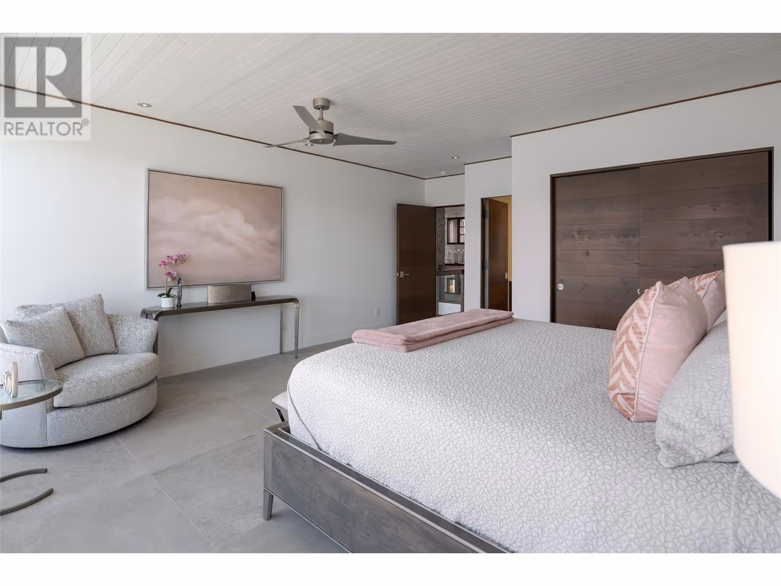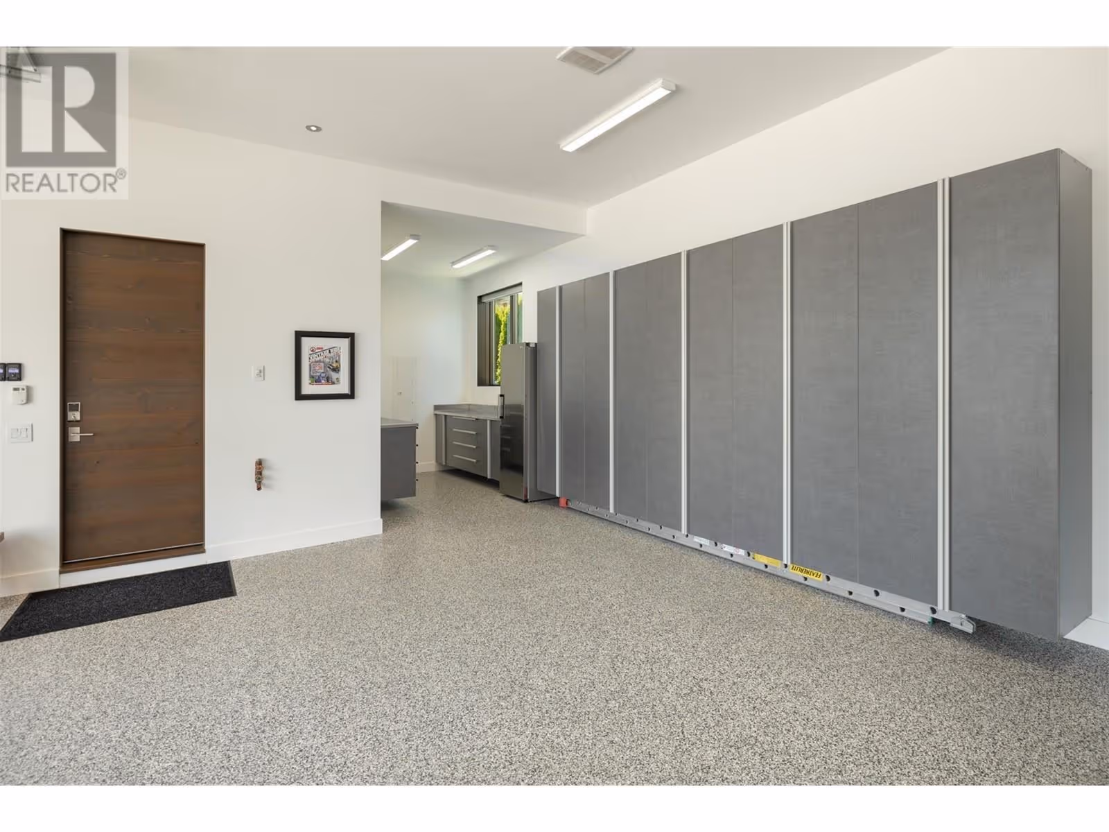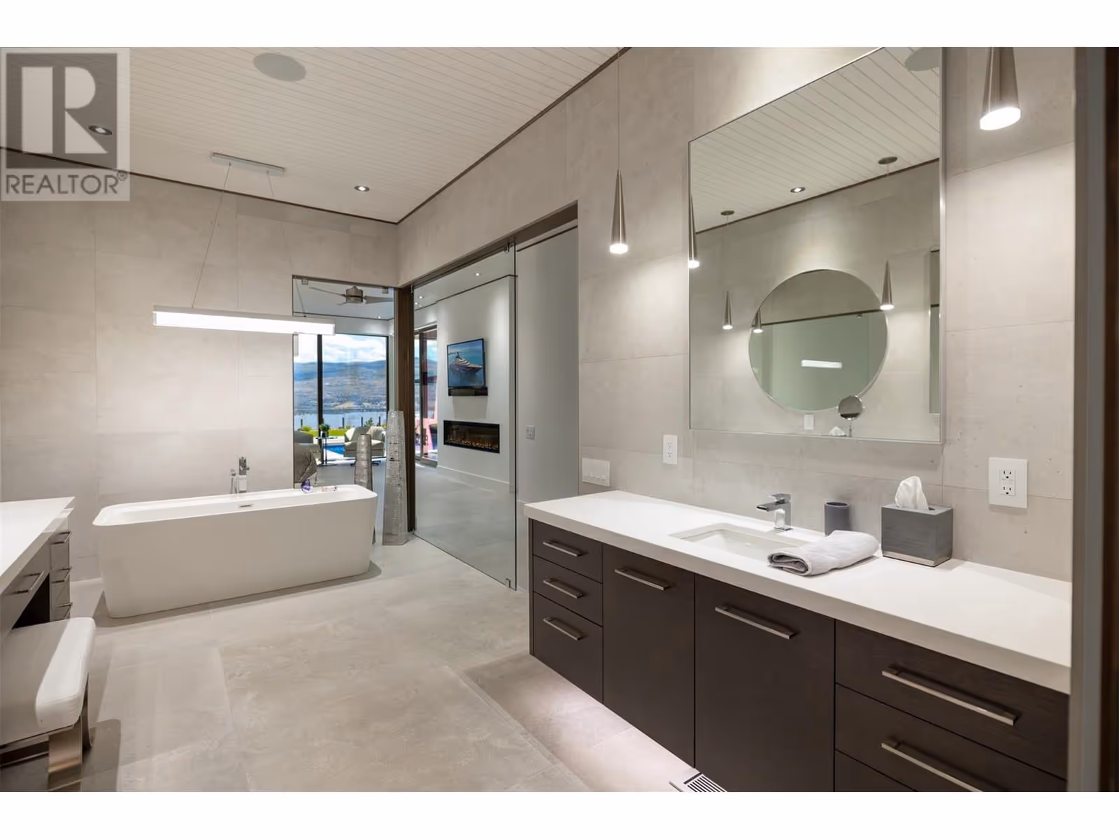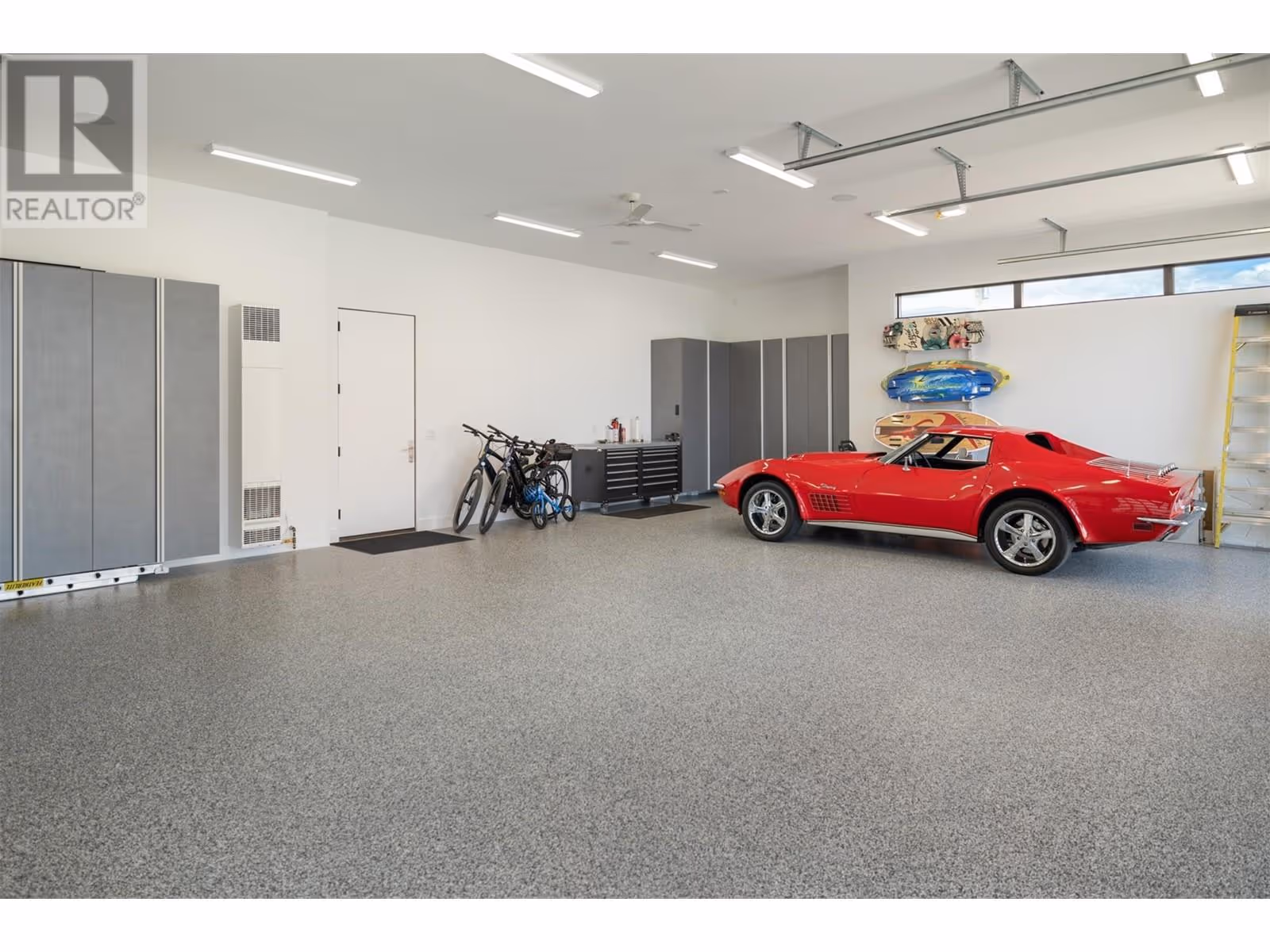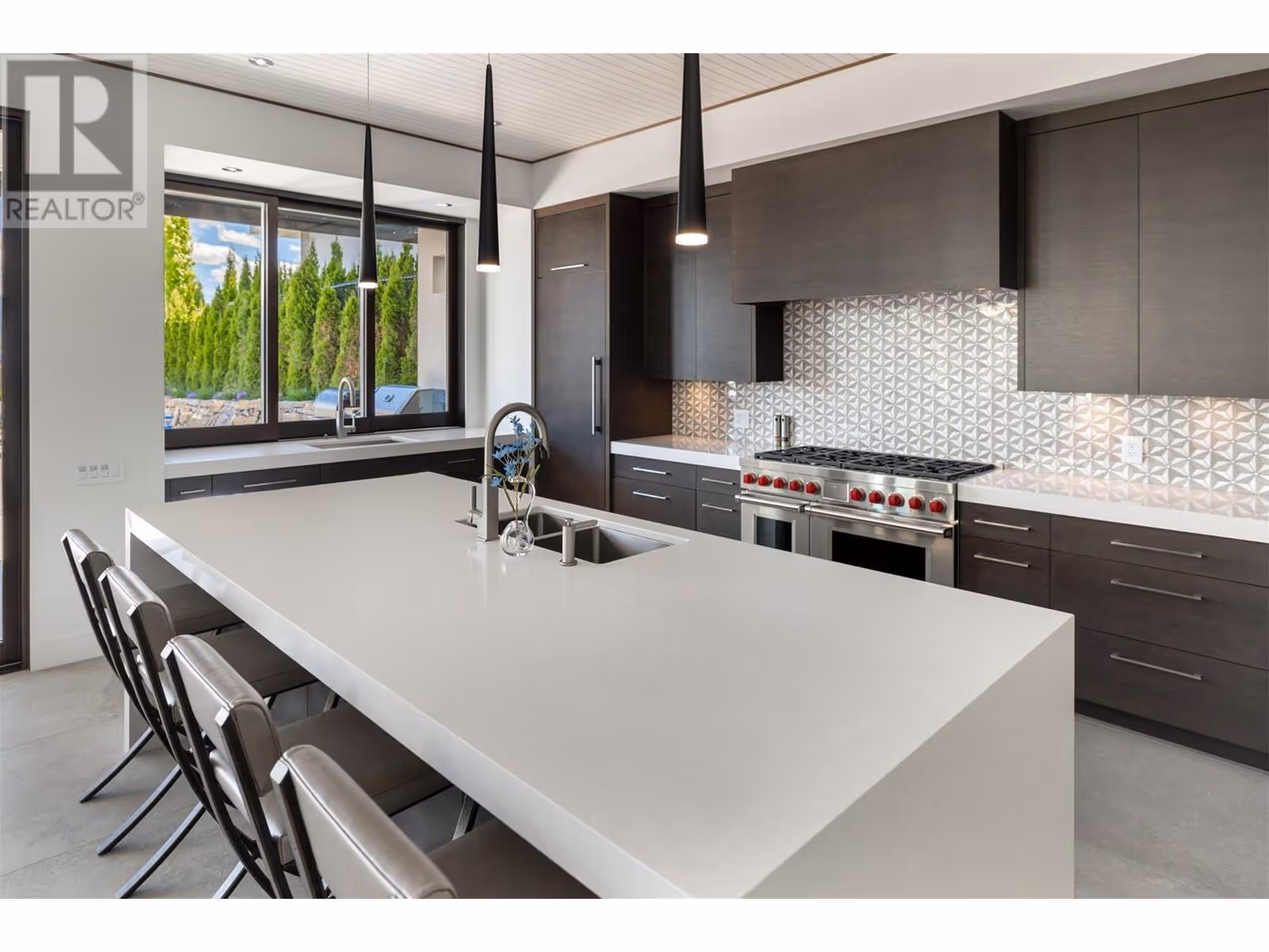 Custom SanMarc home on desirable Thacker Drive in Lakeview Heights. This property boasts exceptional attention to detail that is sure to impress. Expertly designed, it offers a remarkable layout inside & out for everyday living while maintaining its allure as a modern masterpiece.From nearly every room & the backyard, enjoy expansive, unobstructed Okanagan Lake views. A solid wood 12-ft pivot door welcomes you to the foyer with a 20-ft marble tiled entry wall leading to the catwalk on the 2nd level, connecting the 2 wings of the home. The great room boasts 23-foot ceilings, floor-to-ceiling windows, & an 80-inch linear gas fireplace. Gourmet kitchen w/ Carolyn Walsh-designed cabinetry, waterfall island, professional appliances & a window that fully retracts, creating a passthrough to the outdoor kitchen. Glass-enclosed 75+ bottle temperature-controlled wine room. Sliding doors on the main level open to a remarkable outdoor retreat: saltwater pool with auto cover, synthetic lawn, Jacuzzi hot tub, outdoor kitchen, $12K sound system, covered patio w/ glass ceiling. Luxurious main floor primary w/ pool access, spa-inspired 5-piece en suite with views of the lake, heated floors, custom closet, and a linear gas fireplace. Main floor living with elevator that accesses all three floors. Upstairs offers 4 large beds, all with en suites, and 2 featuring private lake view patios. Laundry on both levels. Oversized 3-car garage with built-ins, custom cabinetry, and prewired for EV. (id:58842)