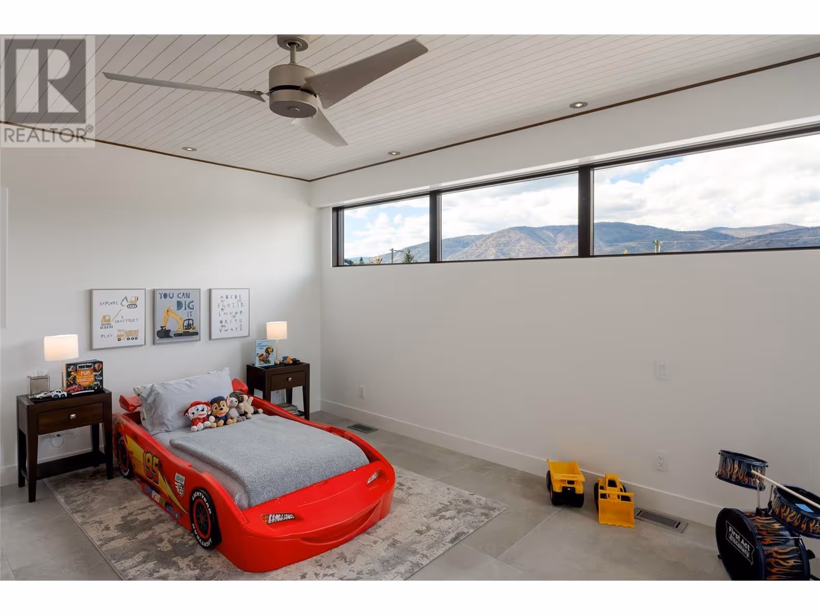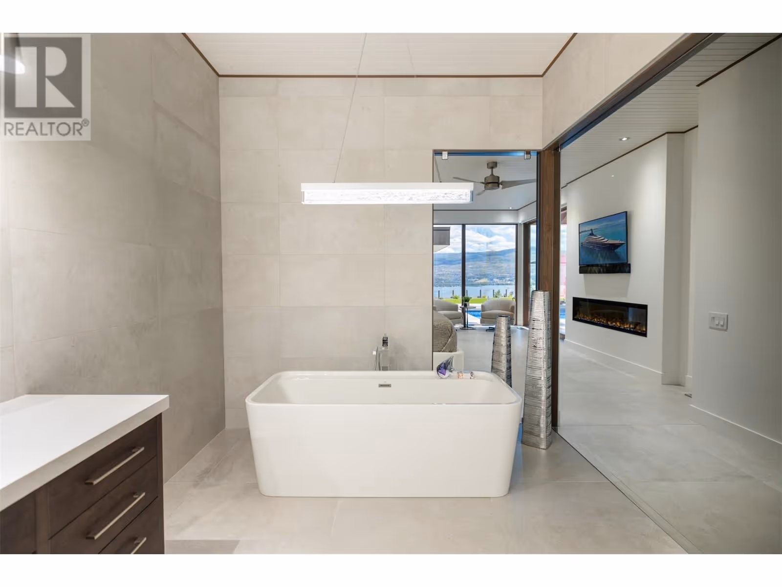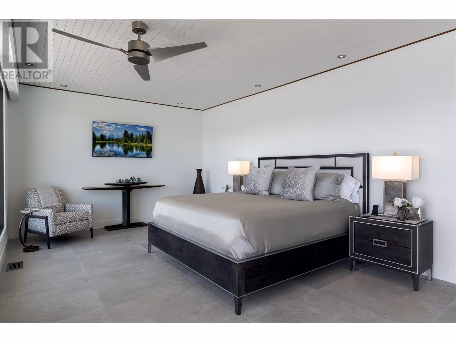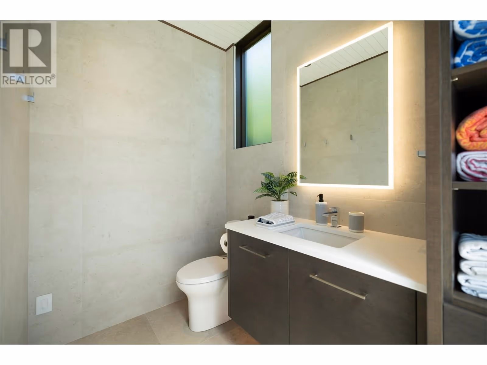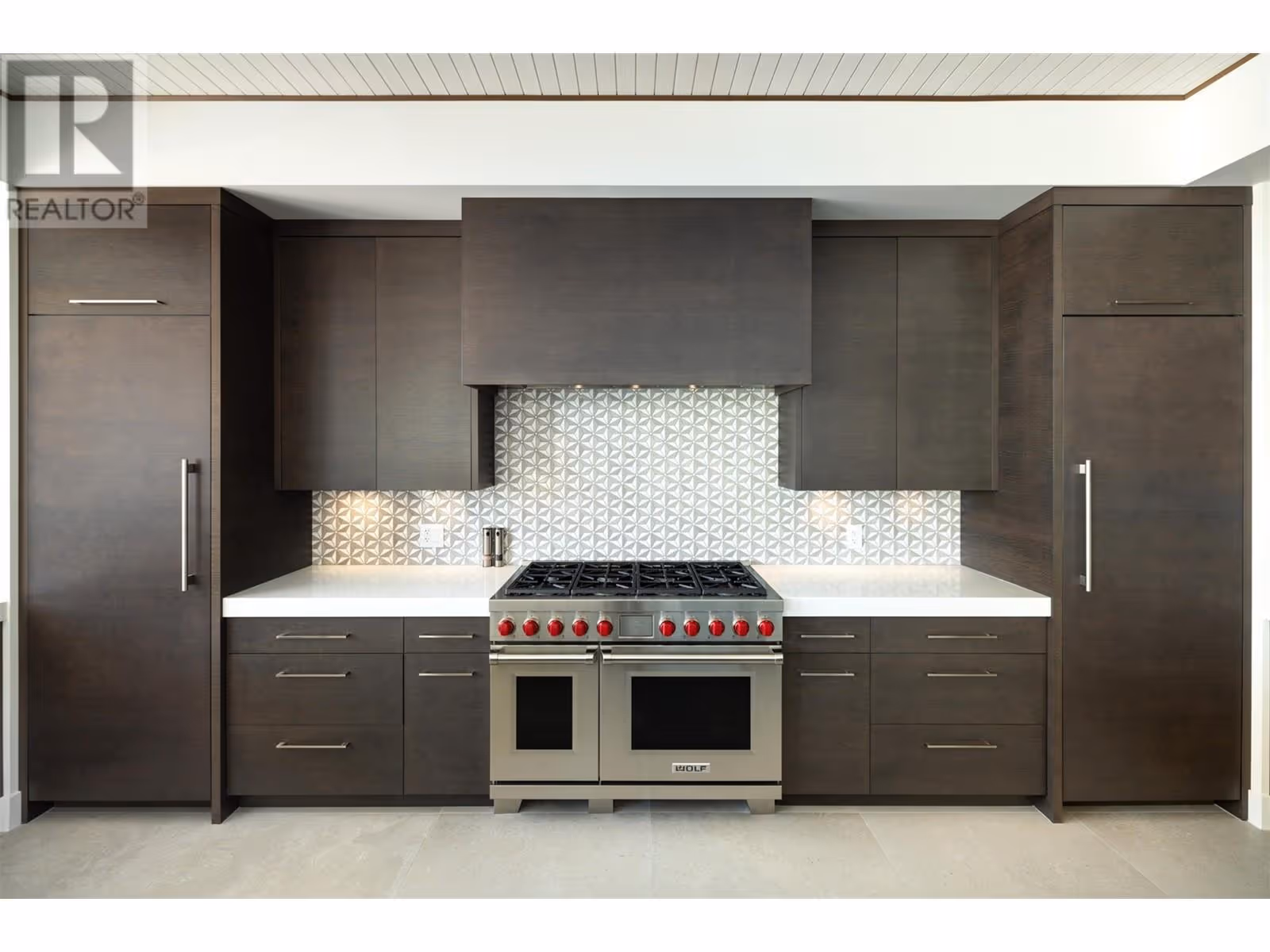 Custom SanMarc home on desirable Thacker Drive in Lakeview Heights. This property boasts exceptional attention to detail that is sure to impress. Expertly designed, it offers a remarkable layout inside & out for everyday living while maintaining its allure as a modern masterpiece.From nearly every room & the backyard, enjoy expansive, unobstructed Okanagan Lake views. A solid wood 12-ft pivot door welcomes you to the foyer with a 20-ft marble tiled entry wall leading to the catwalk on the 2nd level, connecting the 2 wings of the home. The great room boasts 23-foot ceilings, floor-to-ceiling windows, & an 80-inch linear gas fireplace. Gourmet kitchen w/ Carolyn Walsh-designed cabinetry, waterfall island, professional appliances & a window that fully retracts, creating a passthrough to the outdoor kitchen. Glass-enclosed 75+ bottle temperature-controlled wine room. Sliding doors on the main level open to a remarkable outdoor retreat: saltwater pool with auto cover, synthetic lawn, Jacuzzi hot tub, outdoor kitchen, $12K sound system, covered patio w/ glass ceiling. Luxurious main floor primary w/ pool access, spa-inspired 5-piece en suite with views of the lake, heated floors, custom closet, and a linear gas fireplace. Main floor living with elevator that accesses all three floors. Upstairs offers 4 large beds, all with en suites, and 2 featuring private lake view patios. Laundry on both levels. Oversized 3-car garage with built-ins, custom cabinetry, and prewired for EV. (id:58842)